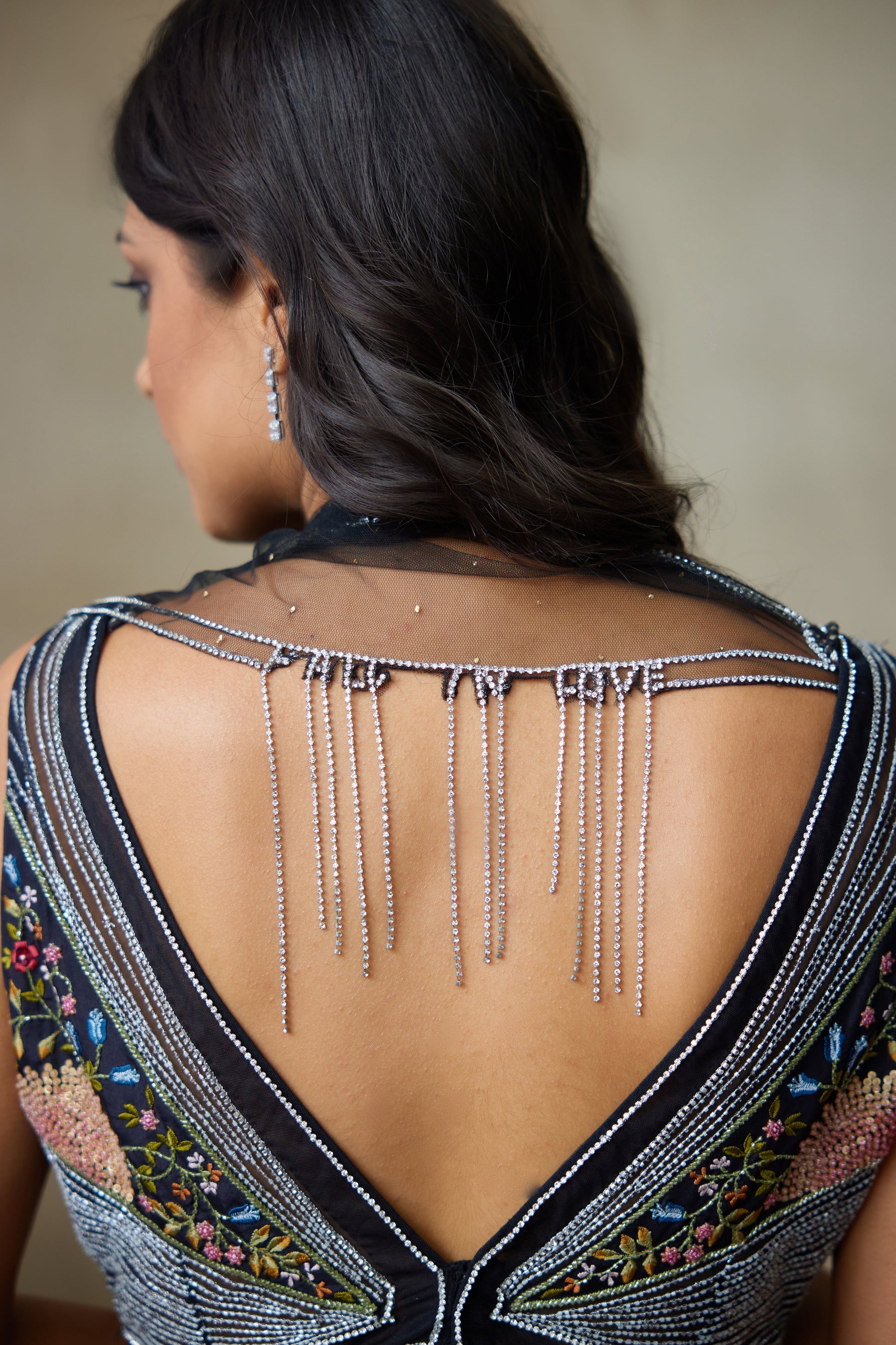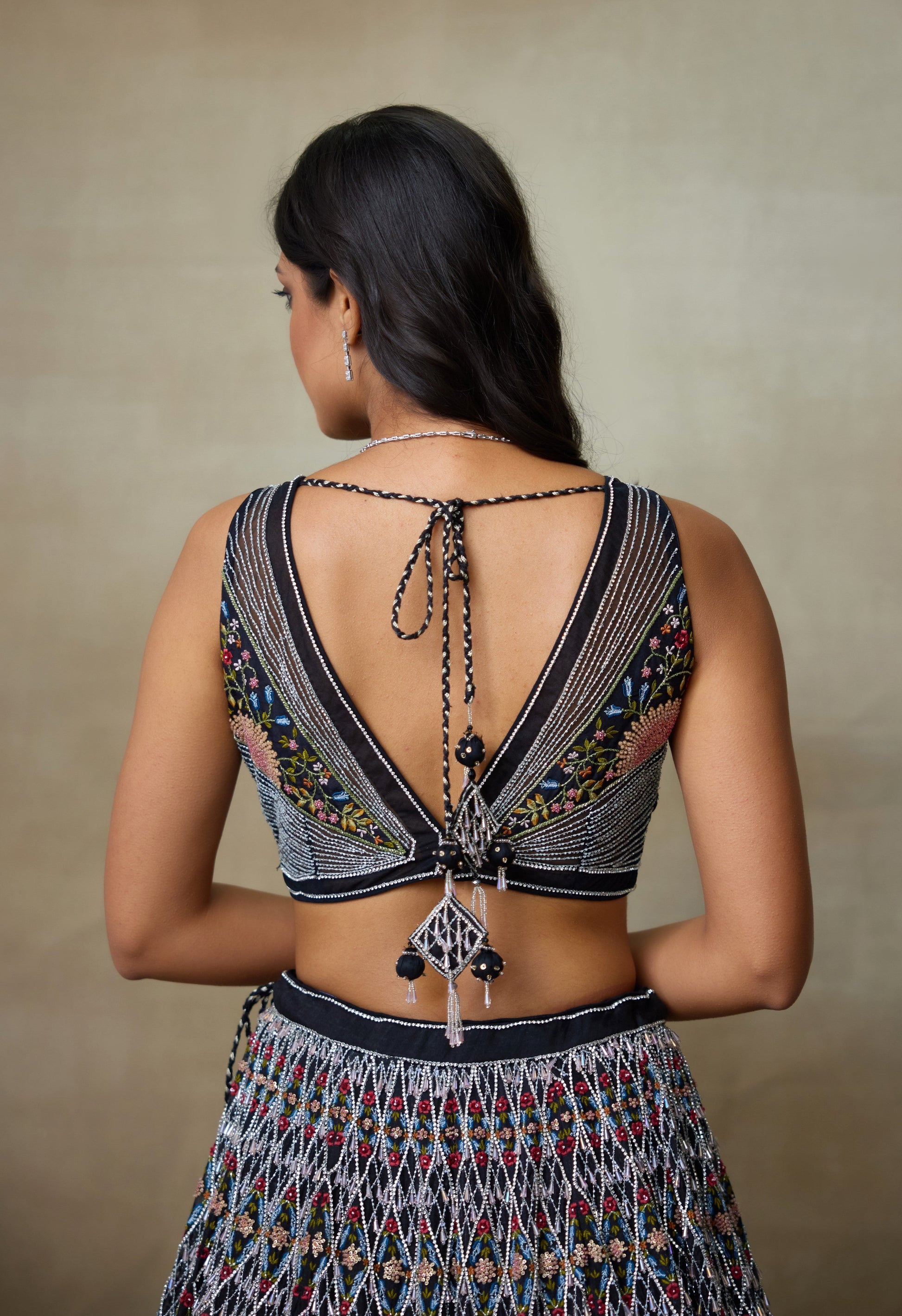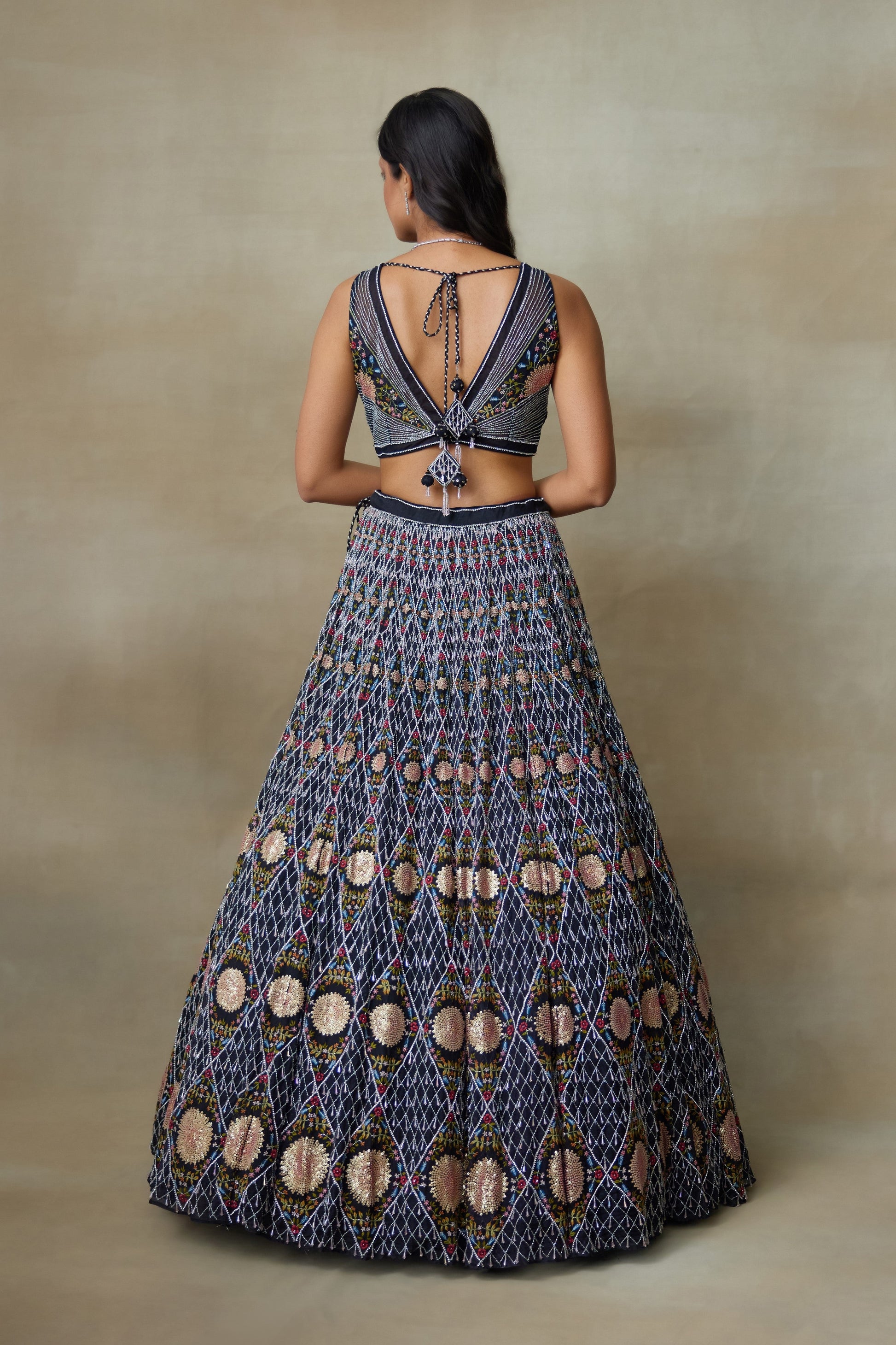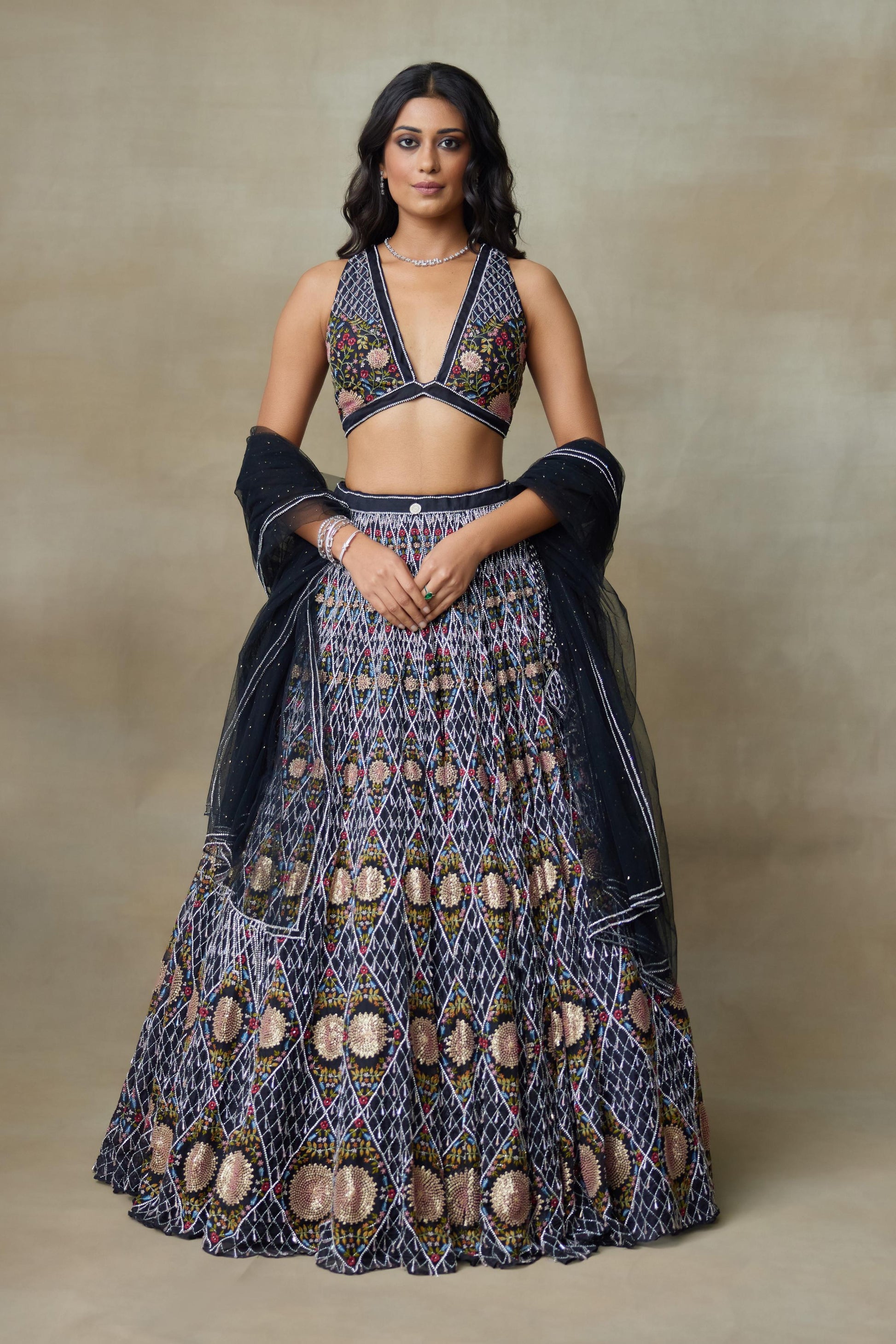 Our Black Silk Organza Lengha Paired With Chamundi Silk V Shaped Neckline Blouse And Mukesh Net Dupatta Is Carefully Hand-Embellished With Sparkling Diamond Accents And Sun Inspired Motifs In The Center With Swarovski Line Of Work Outlined, Delicate Drops Attached Across The Checkered Design And Intricate Floral Work Makes It Have A Stunning Look With Unique Style With Elegance.