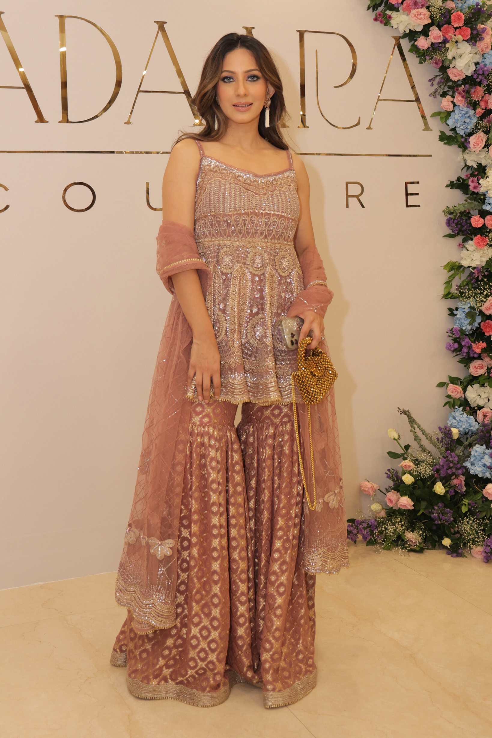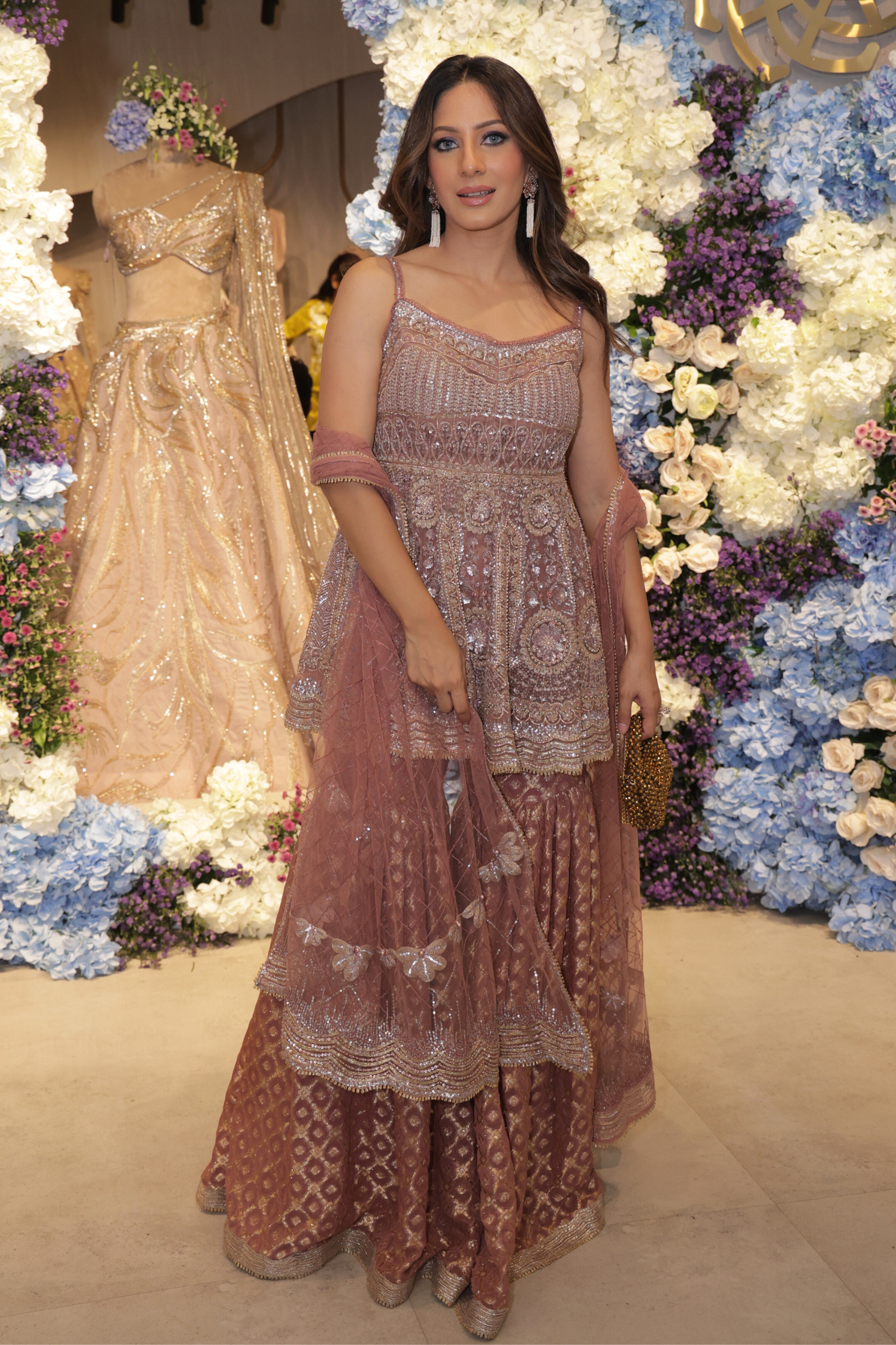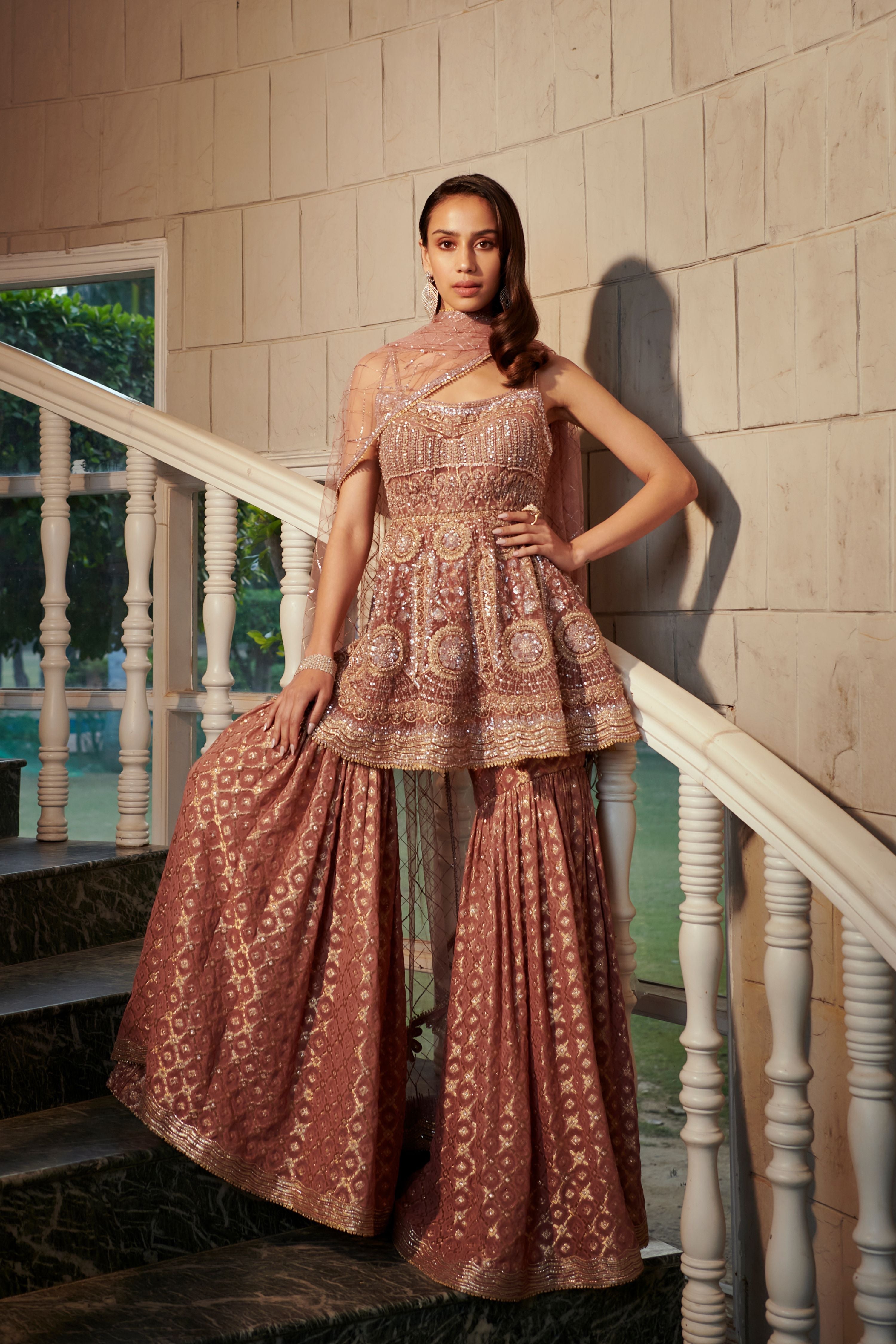This Sharara comes with heavy embroidered peplum which is paired with brocade georgette sharara and dupatta.