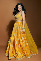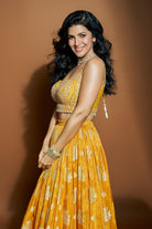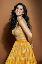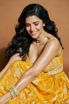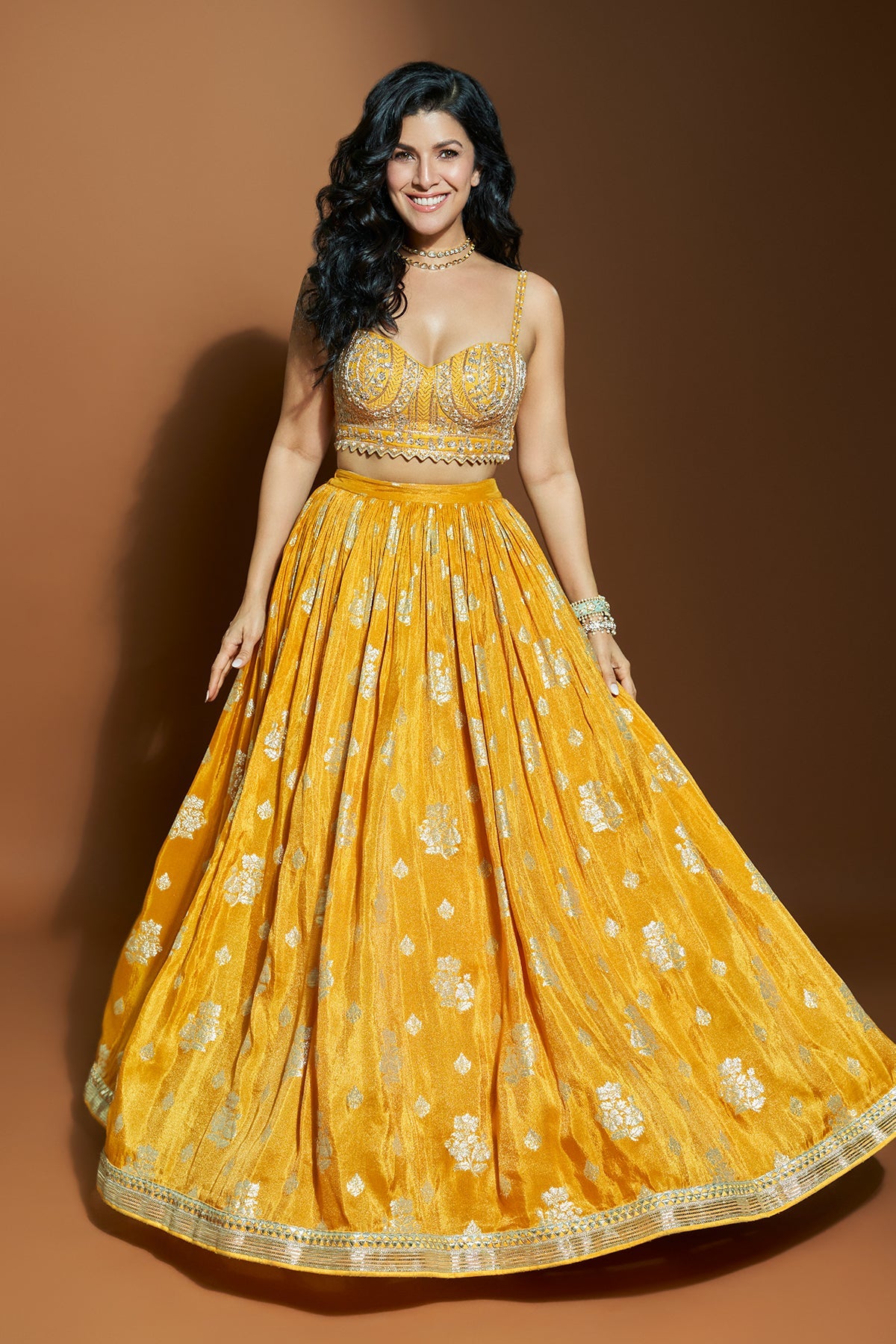 Jacquard skirt with zardozi, glass beads, pearl embroidered blouse, and tulle dupatta.