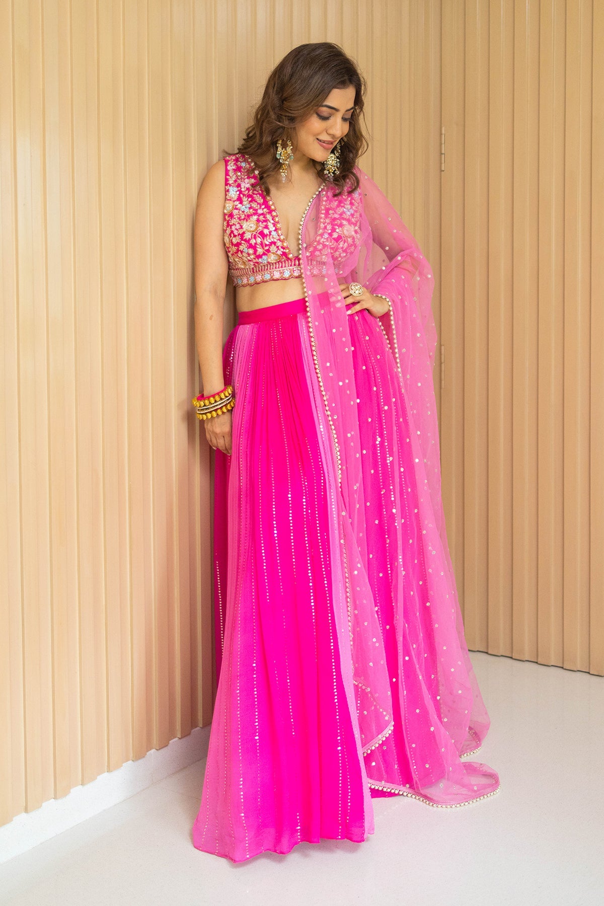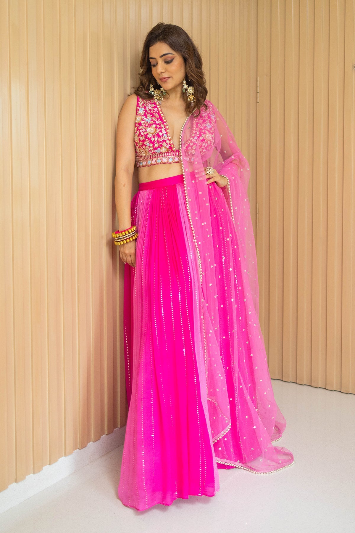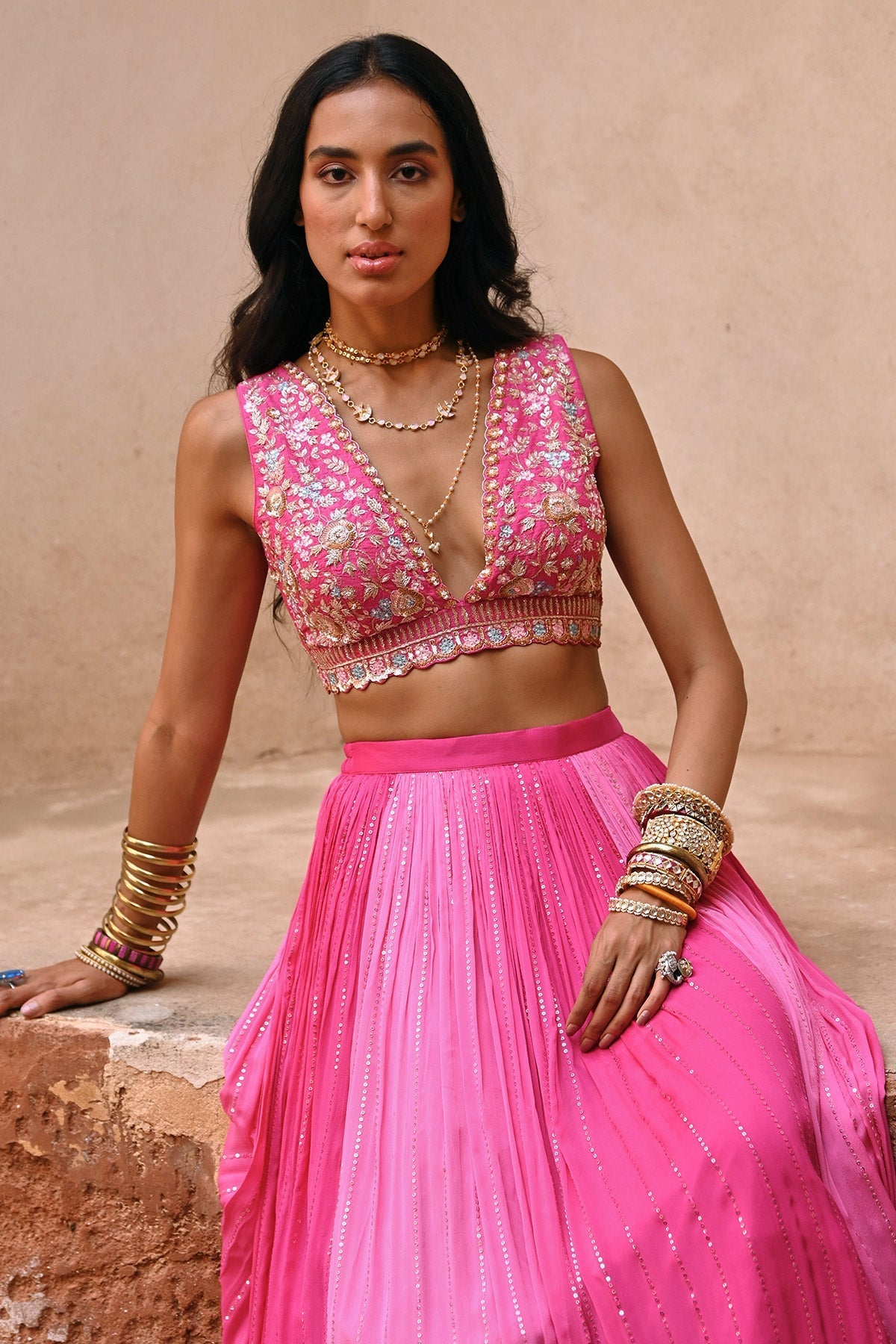 Resham zardozi and glassbeads embroidered blouse with shaded georgette skirt and tulle dupatta.