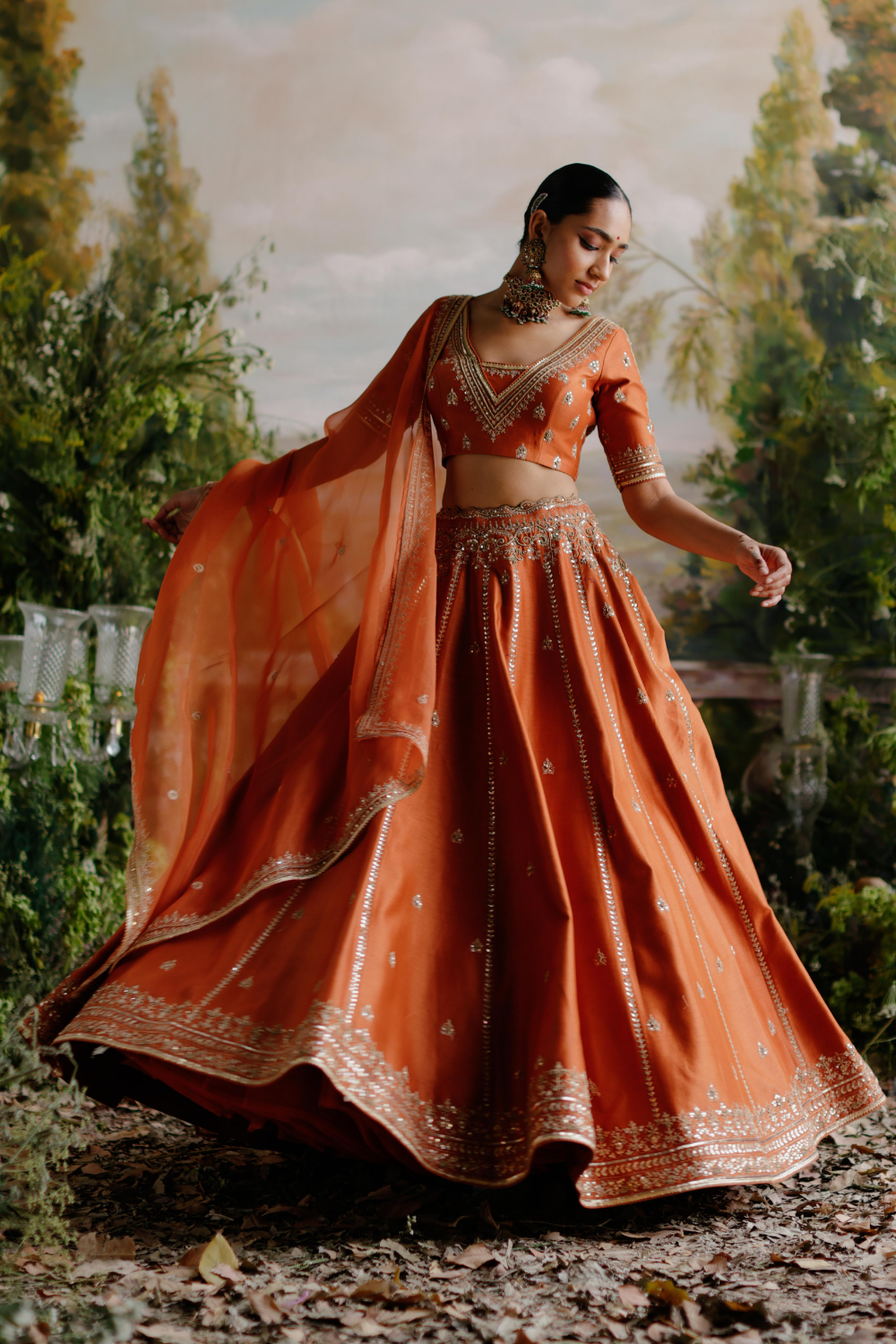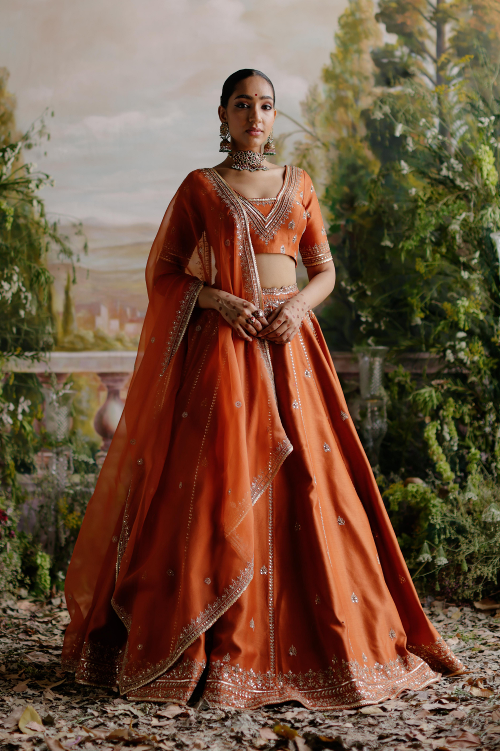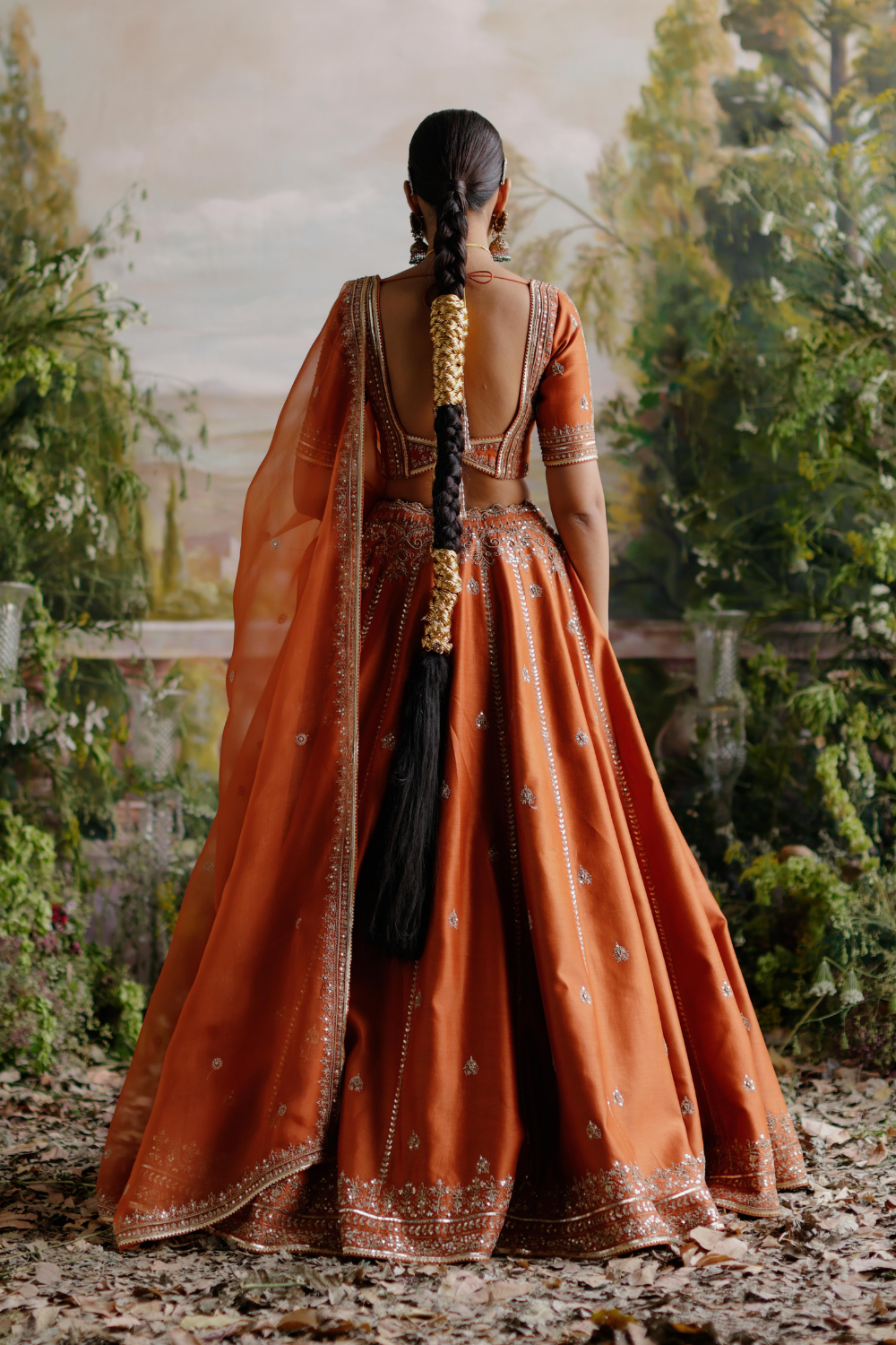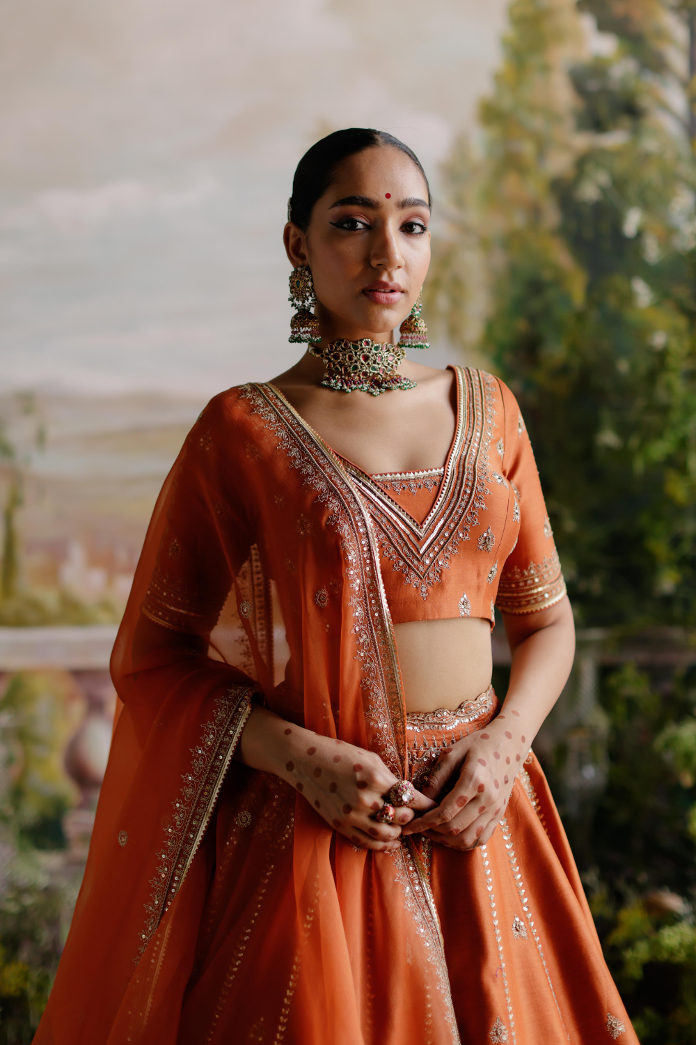 Featuring a rust orange Chanderi lehenga set paired with an organza base dupatta with antique gold dori and embellished hand embroidery.