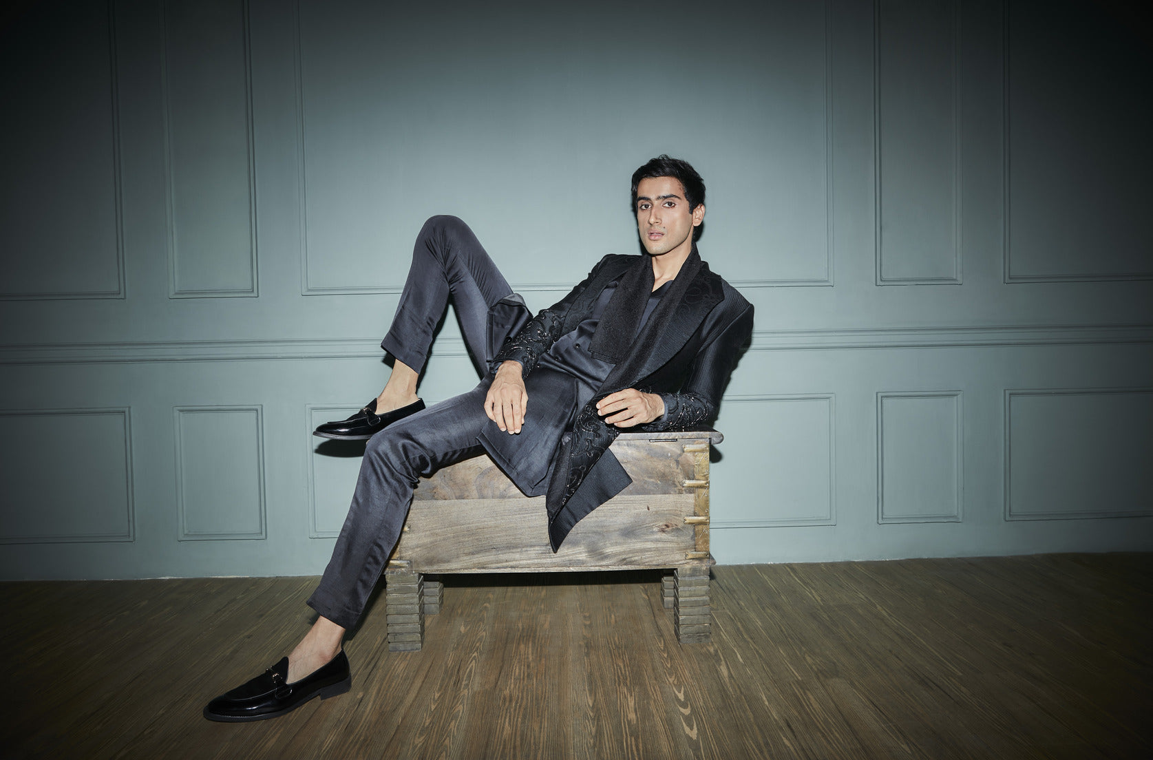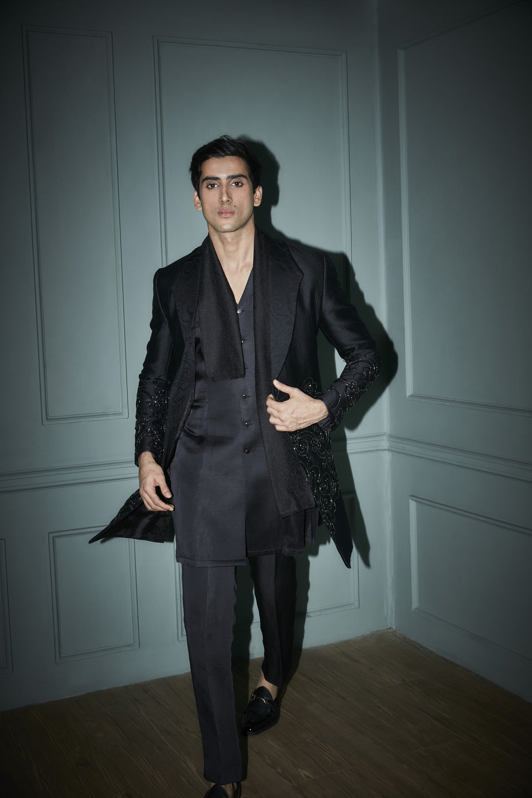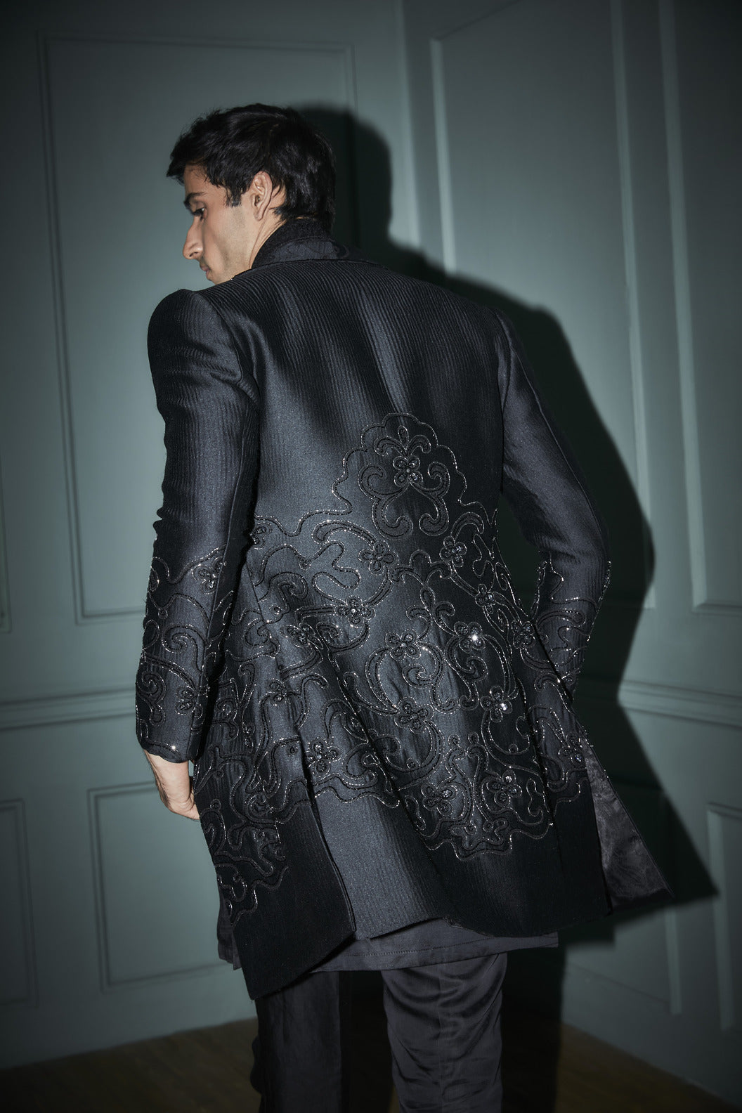 Embroidered indo-western sherwani set. The outfit is fabricated in imported embossed fabric. The Jacket is embroidered with cutdana and salli work at the hem of the jacket. Paired with shirt and matching trouser pants.