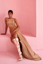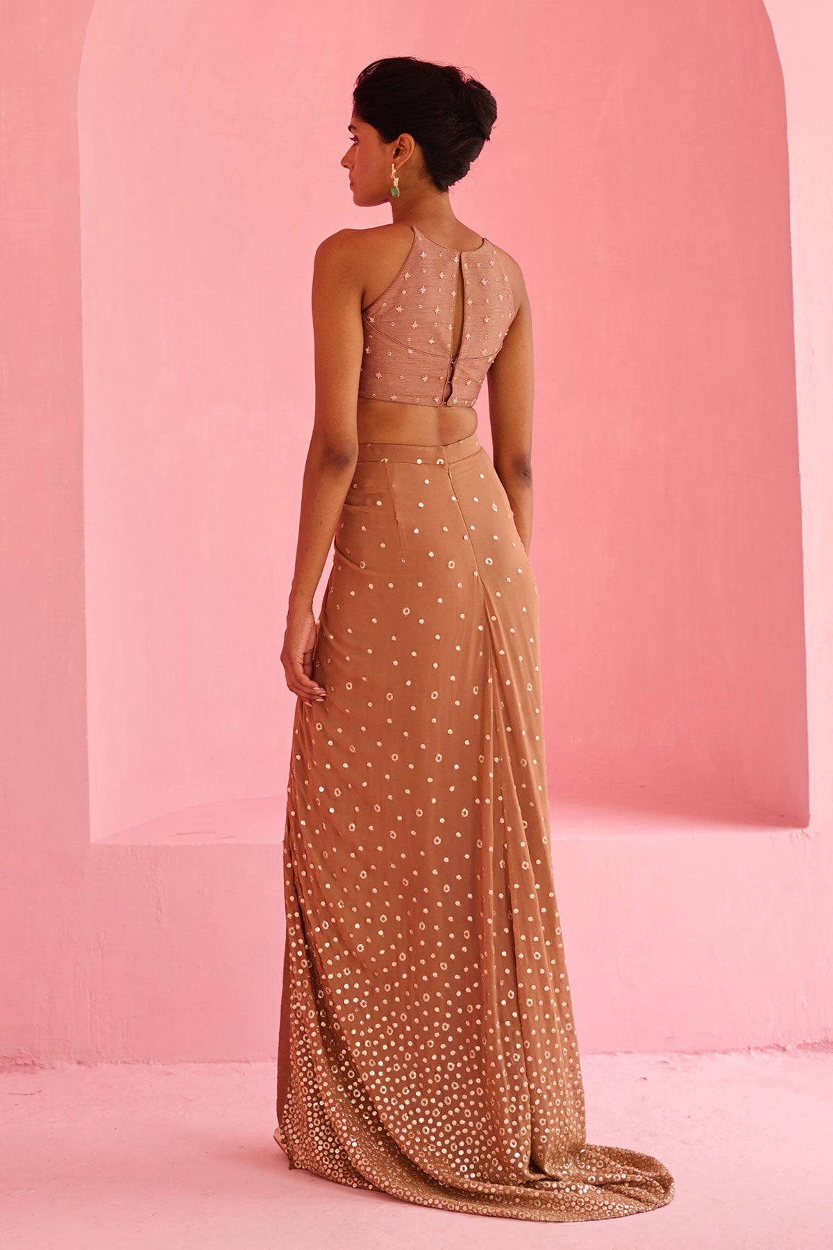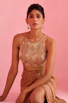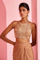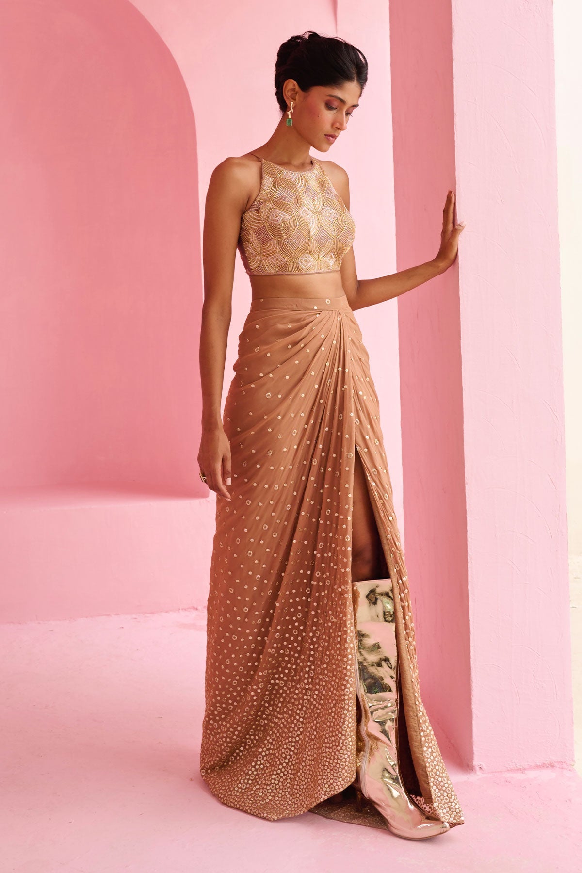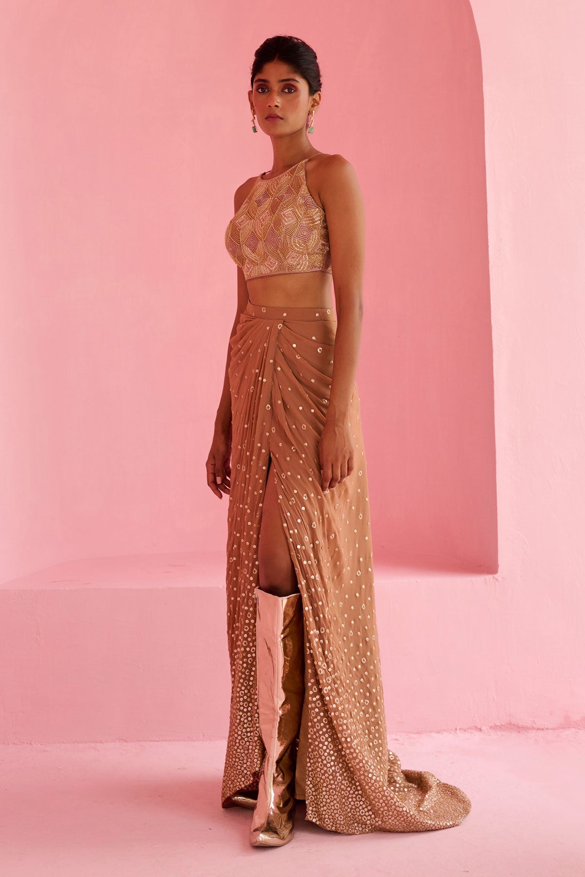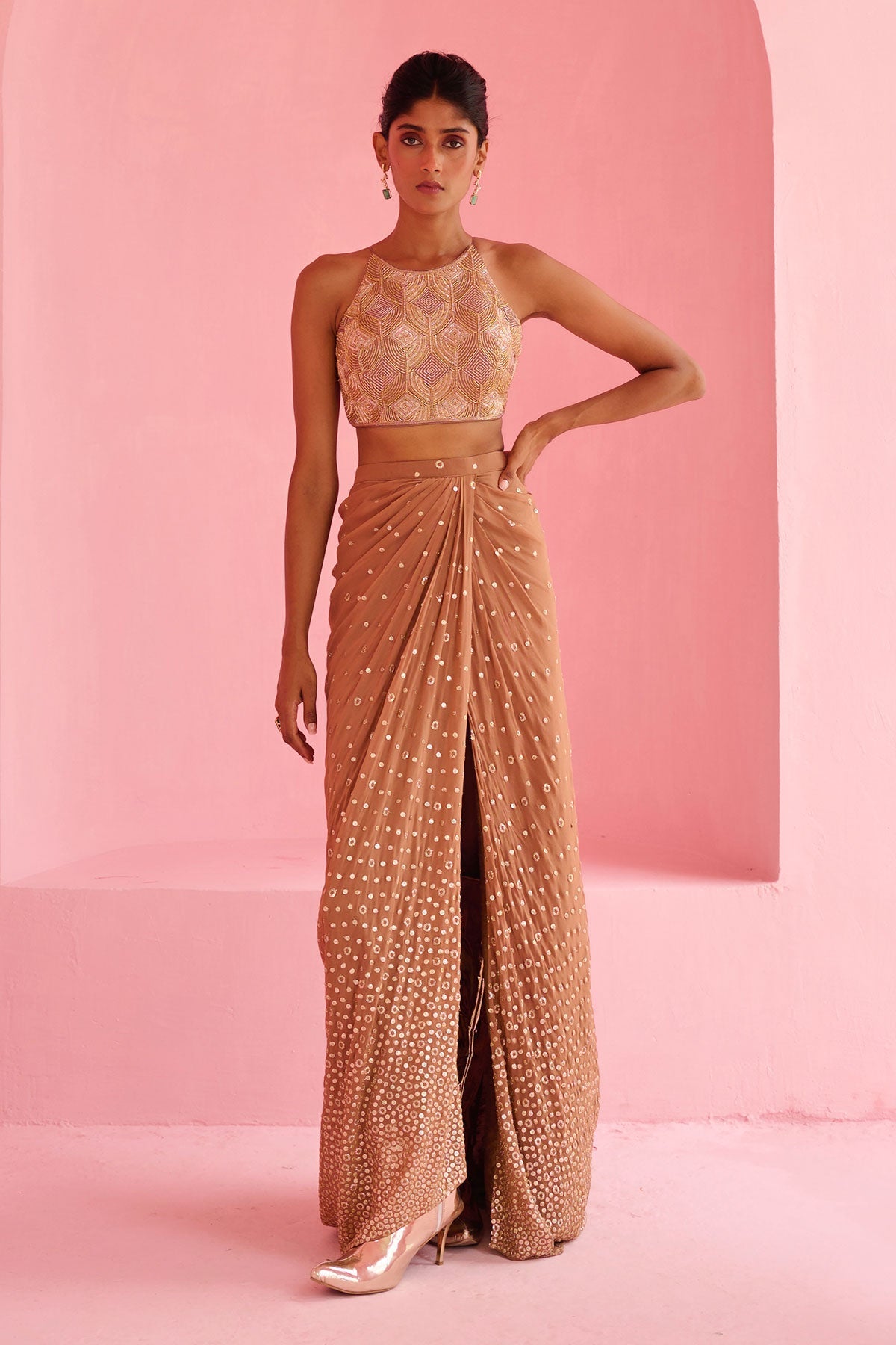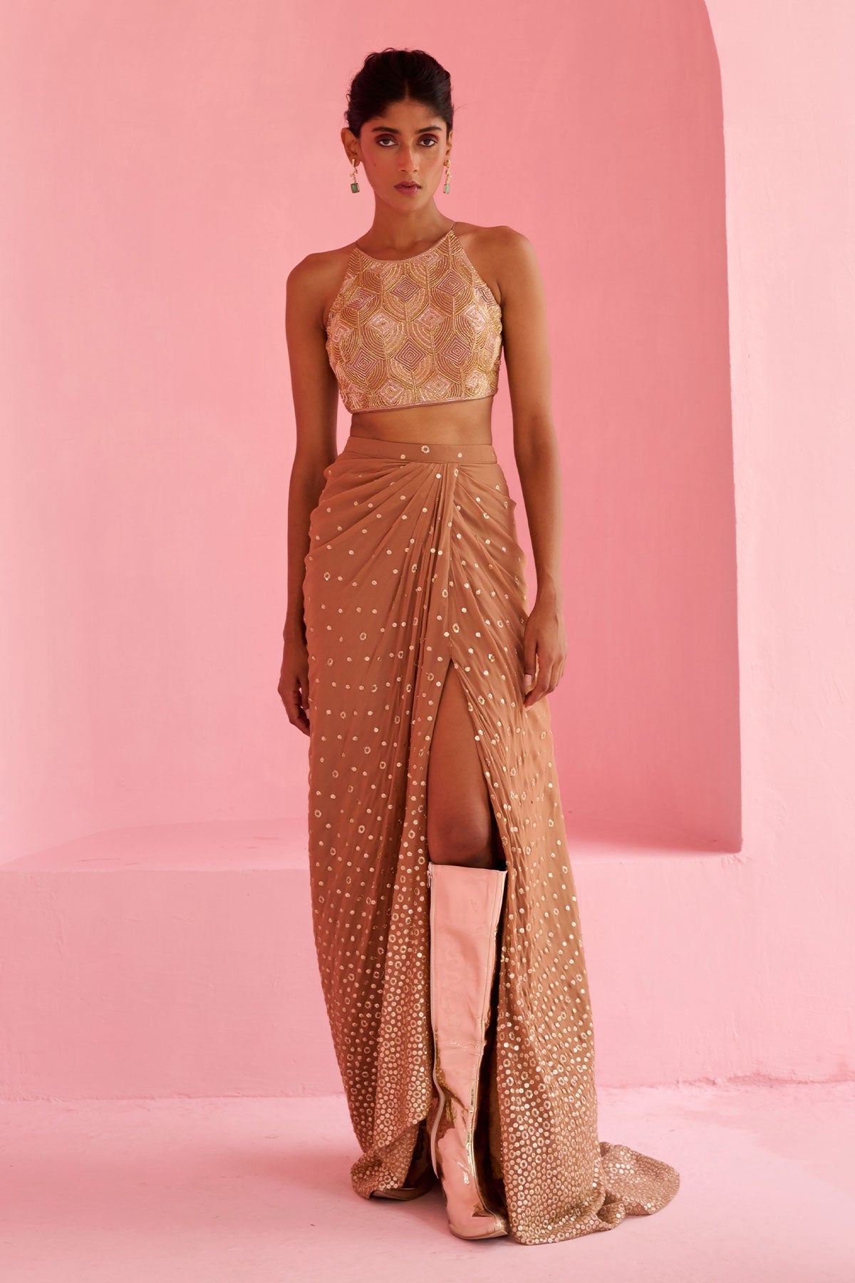 Sequence embellished drape skirt paired with glassbeads embroidered halter neck top.