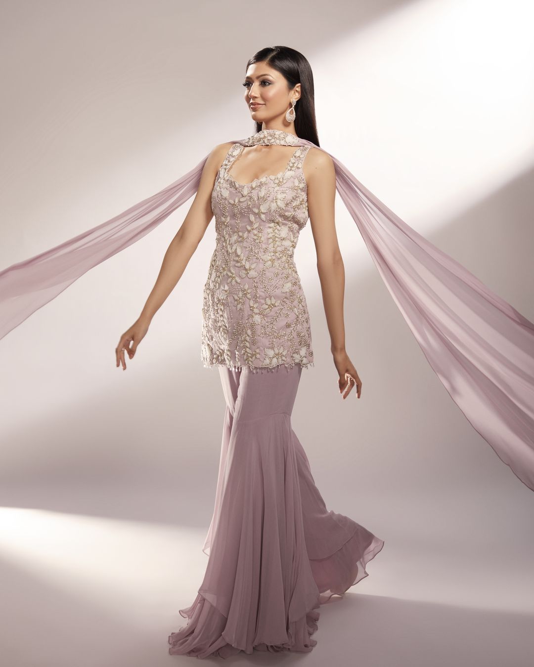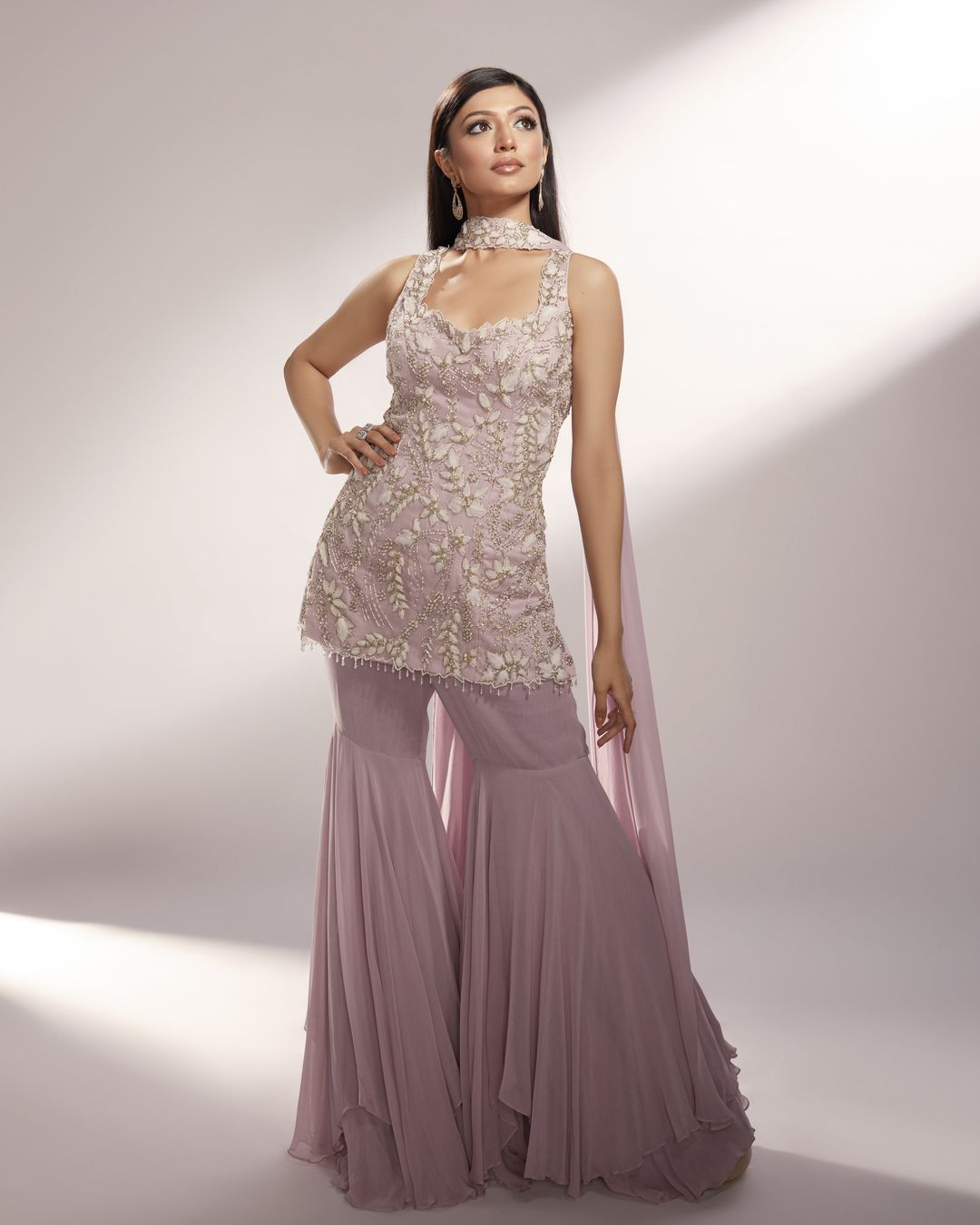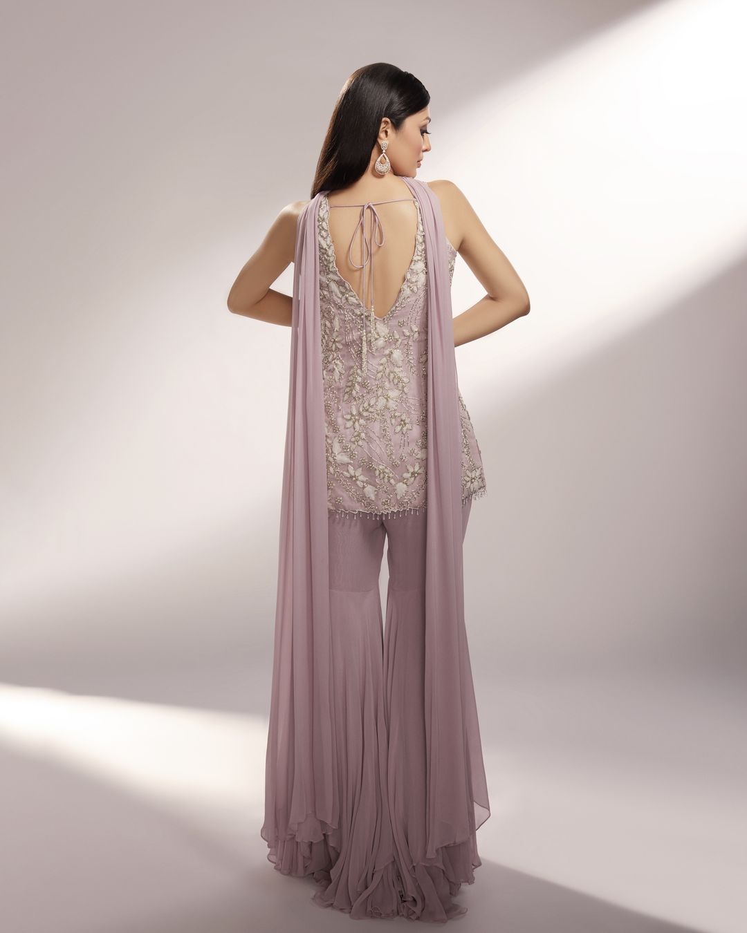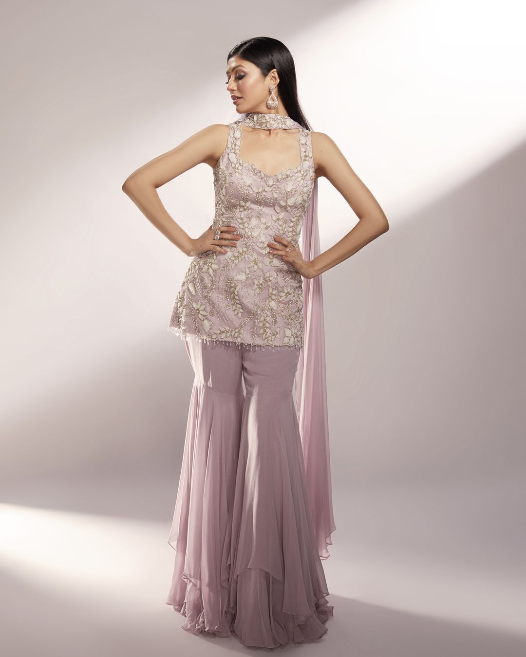 Nova is our dusty lavender and white sharara set embellished with organza floral details accompanied with silver glass beads and pearls.