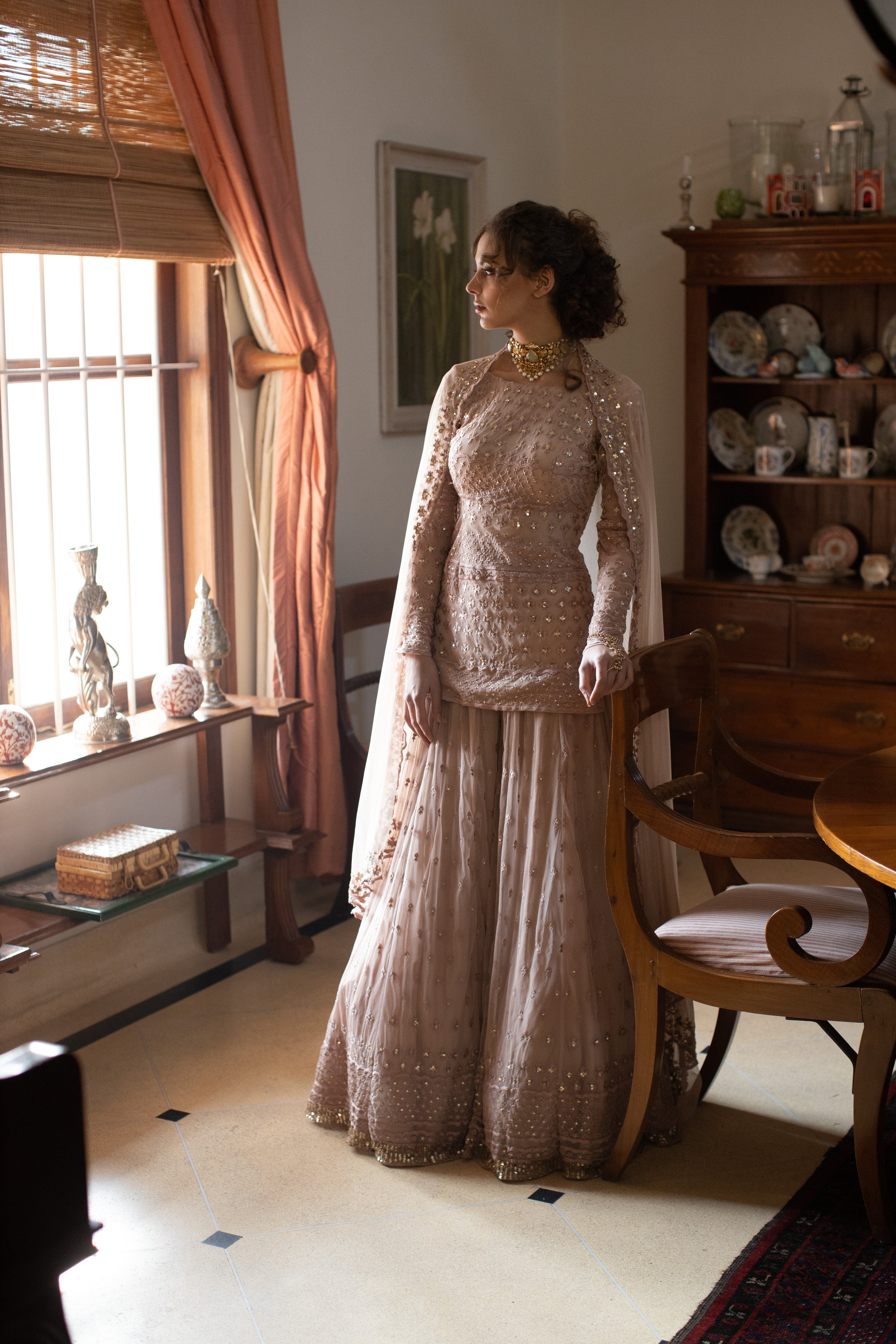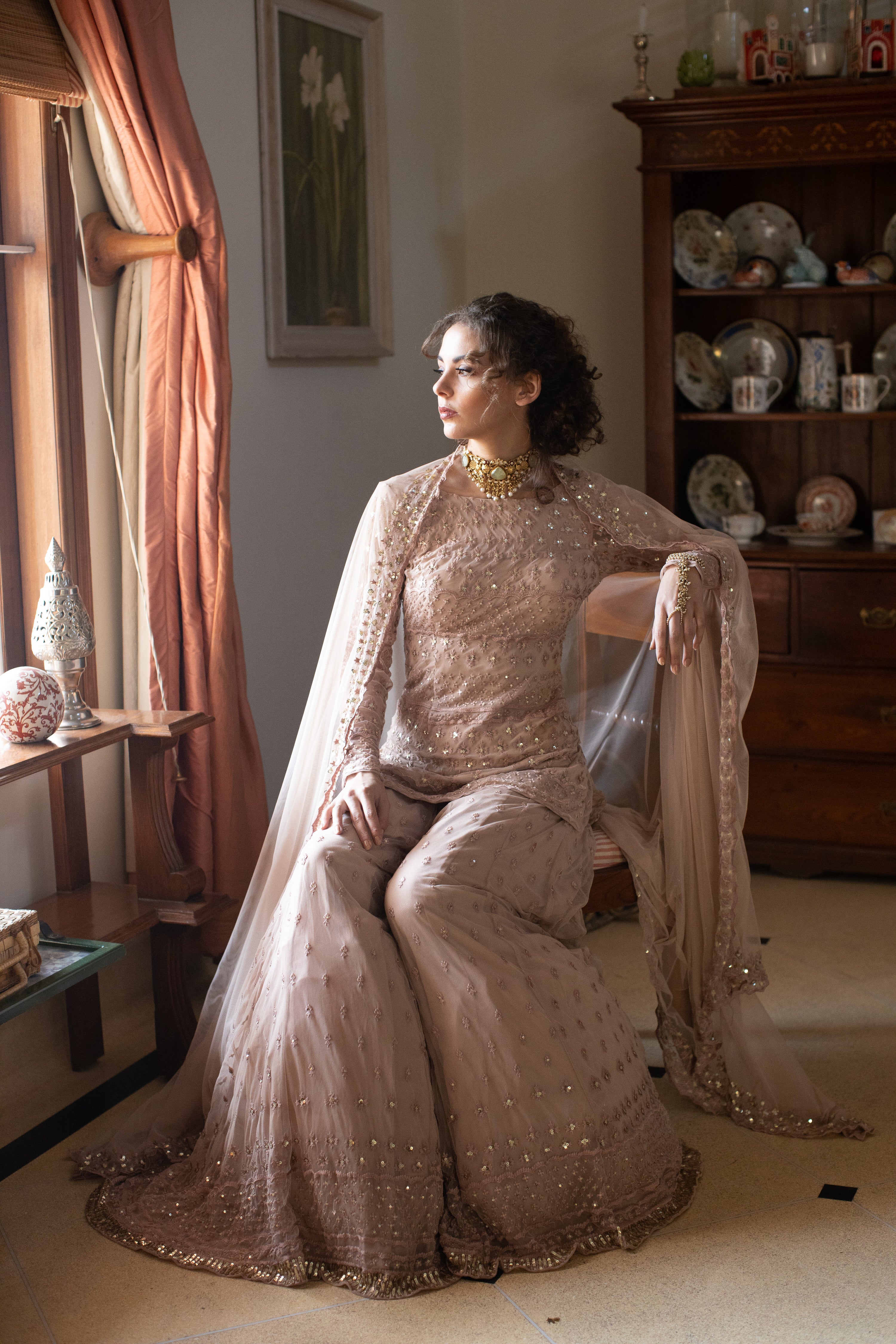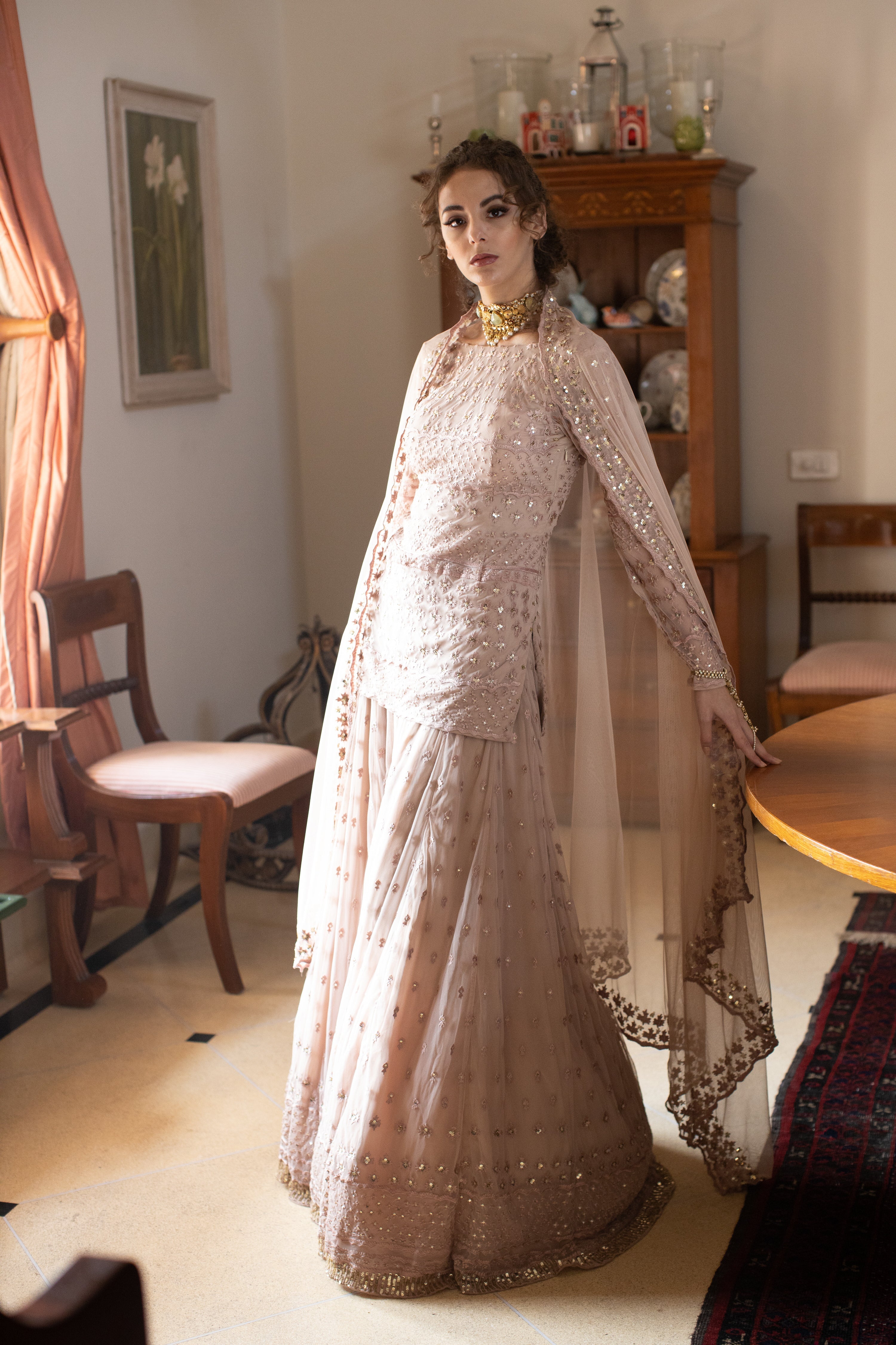Nude Threadwork Kurti And Sharara Set