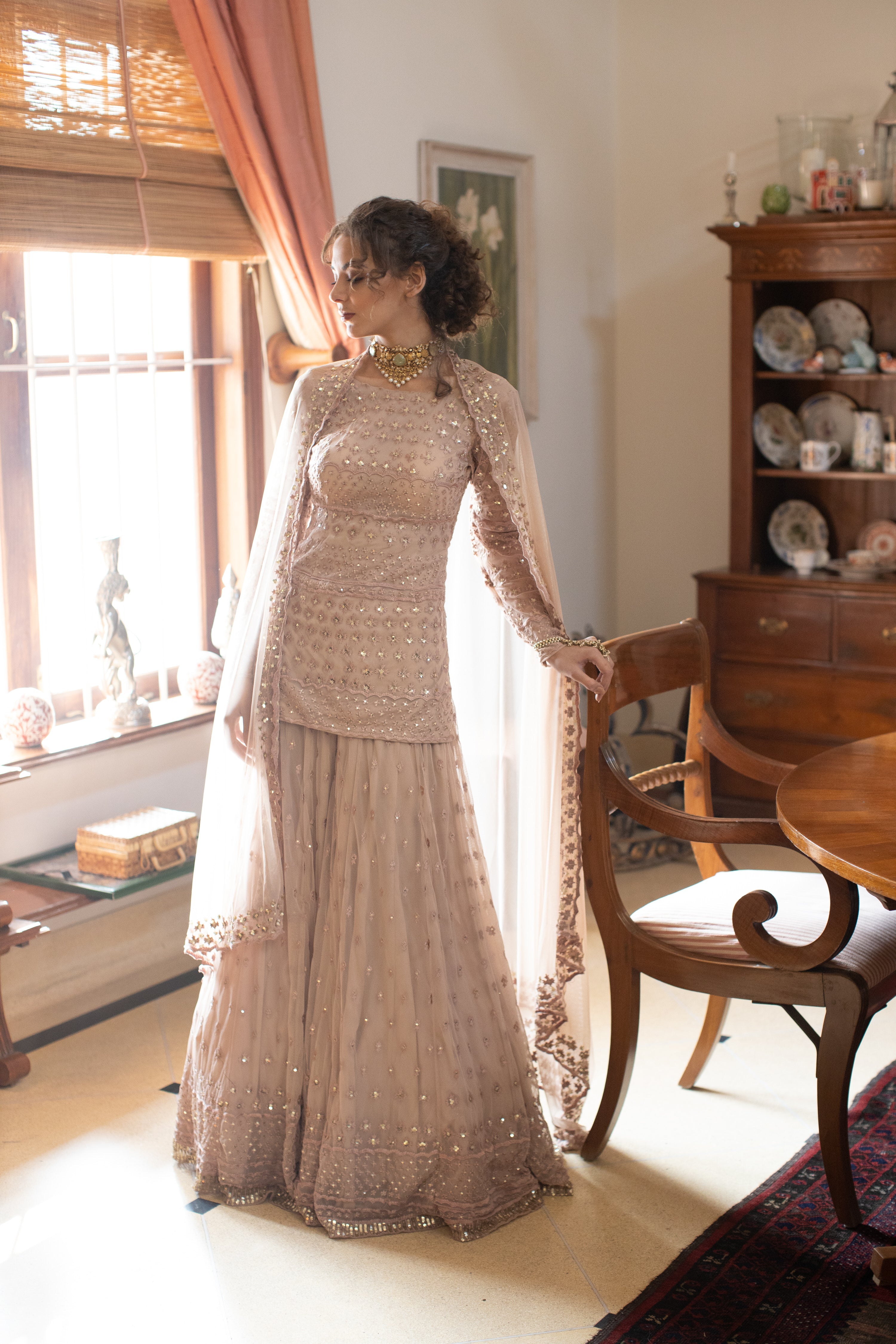Featuring a Nude Thread Work Kurti And Sharara Set in Net.