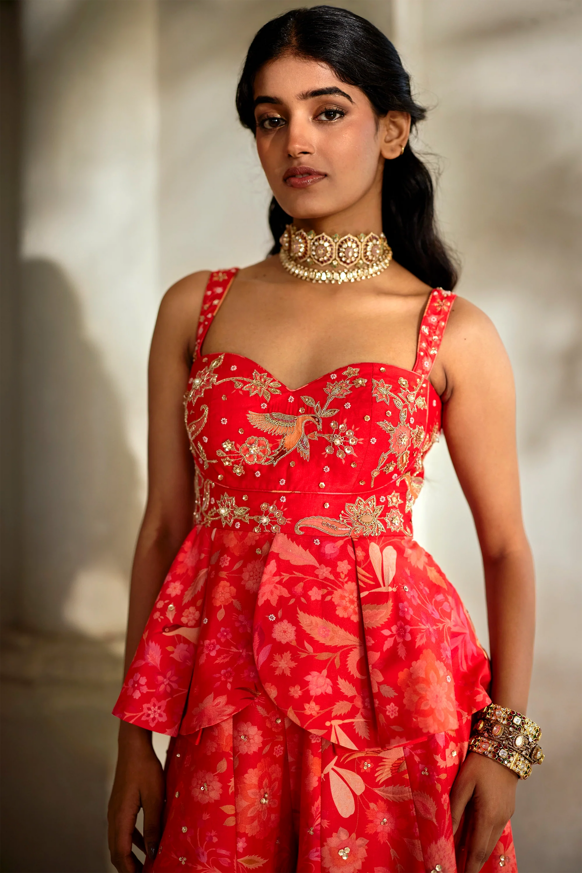 A peplum and palazzo set designed for charm and fluidity. The peplum top features a sweetheart neckline with hand embroidery on the yoke, complemented by a structured box-pleated silhouette. It pairs effortlessly with same-print palazzos accented with minimal embroidery highlights.