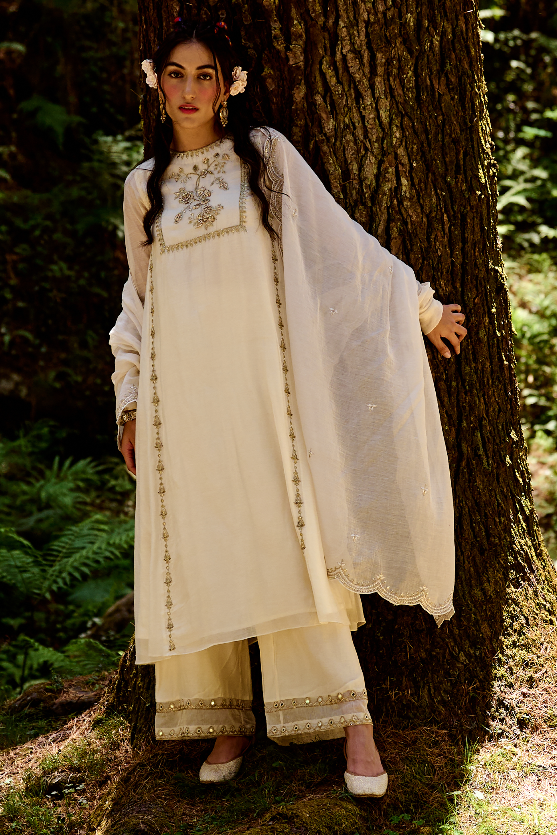 Off–white kurta set of hand–embroidered kurta, dupatta and pants embellished with mirrors, sequins, zari, cutdana and resham thread work.