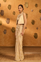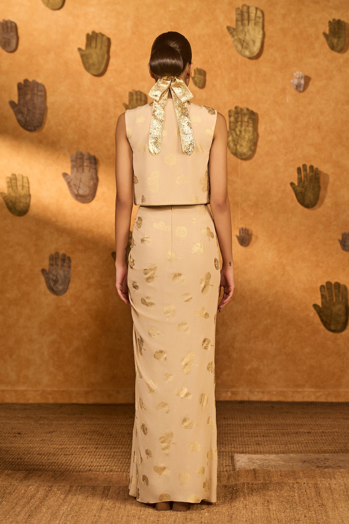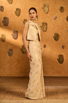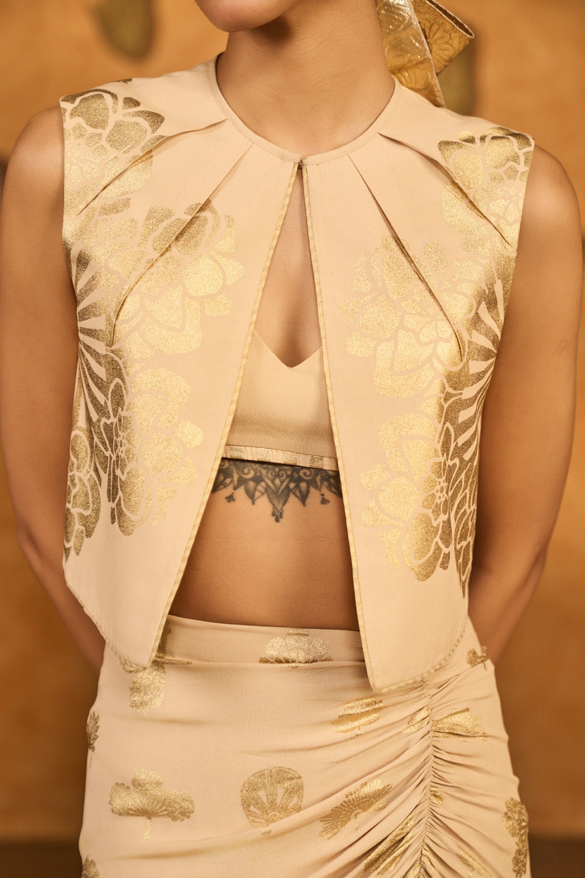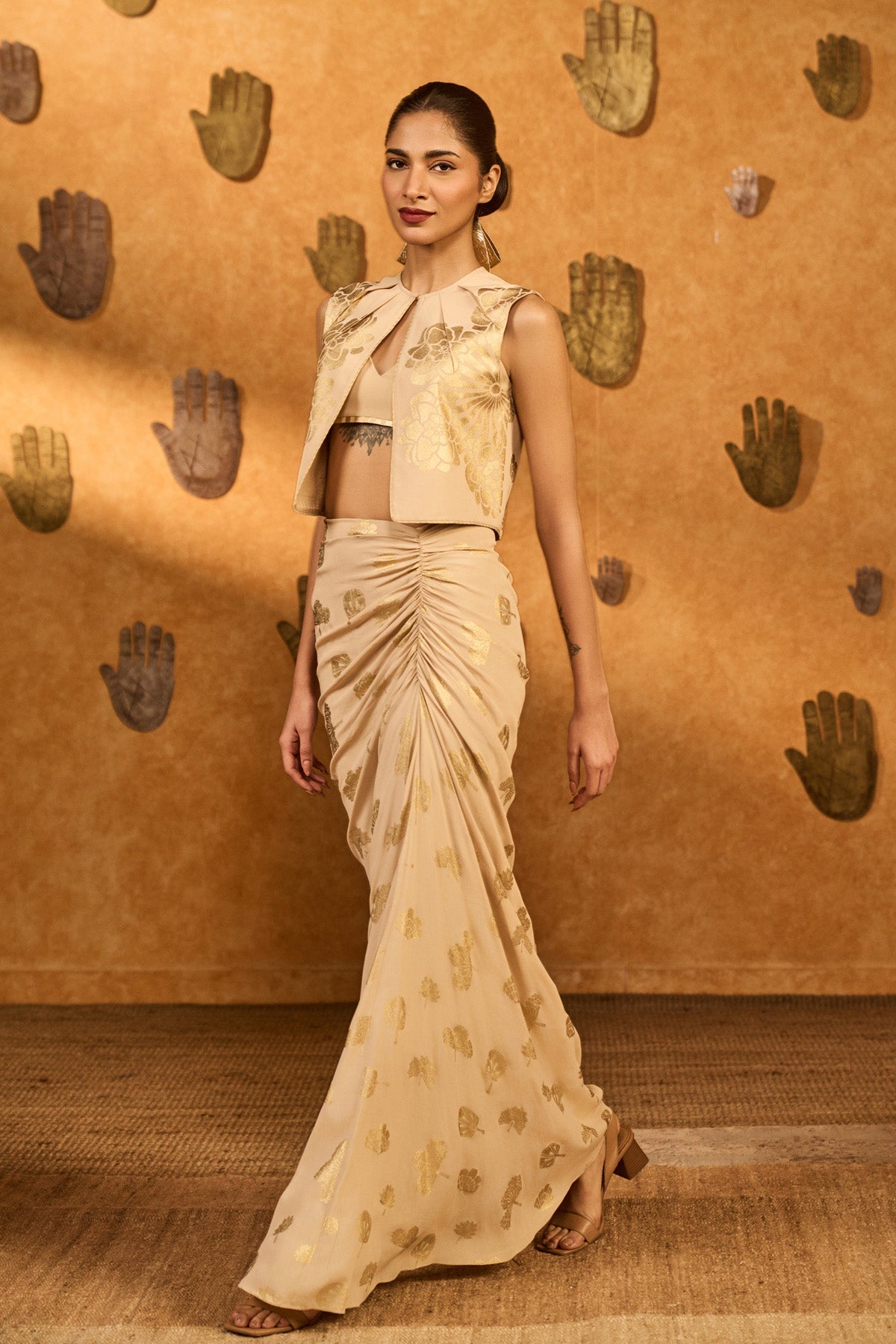 Details: Jacket- Beautiful foil placement printed jacket with gathering detail |Back adorned with all over foil print| Front opening | Hem embellished with stripes print piping Skirt- All over printed drape skirt | Side seam closure Bustier- Bustier with adjustable straps | Center back opening