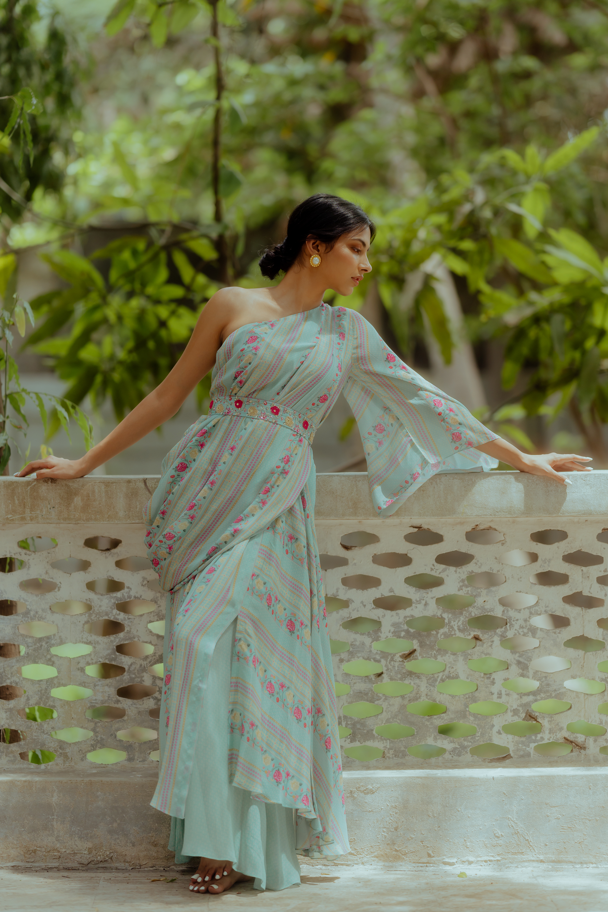 A tea pot blue rose border print one shoulder top with drape skirt, paired with a stunning hand–embroidered french knotted belt.