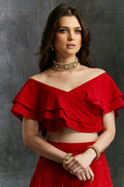 Off Shoulder Crop Top With Red Embroidered Lehenga