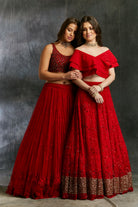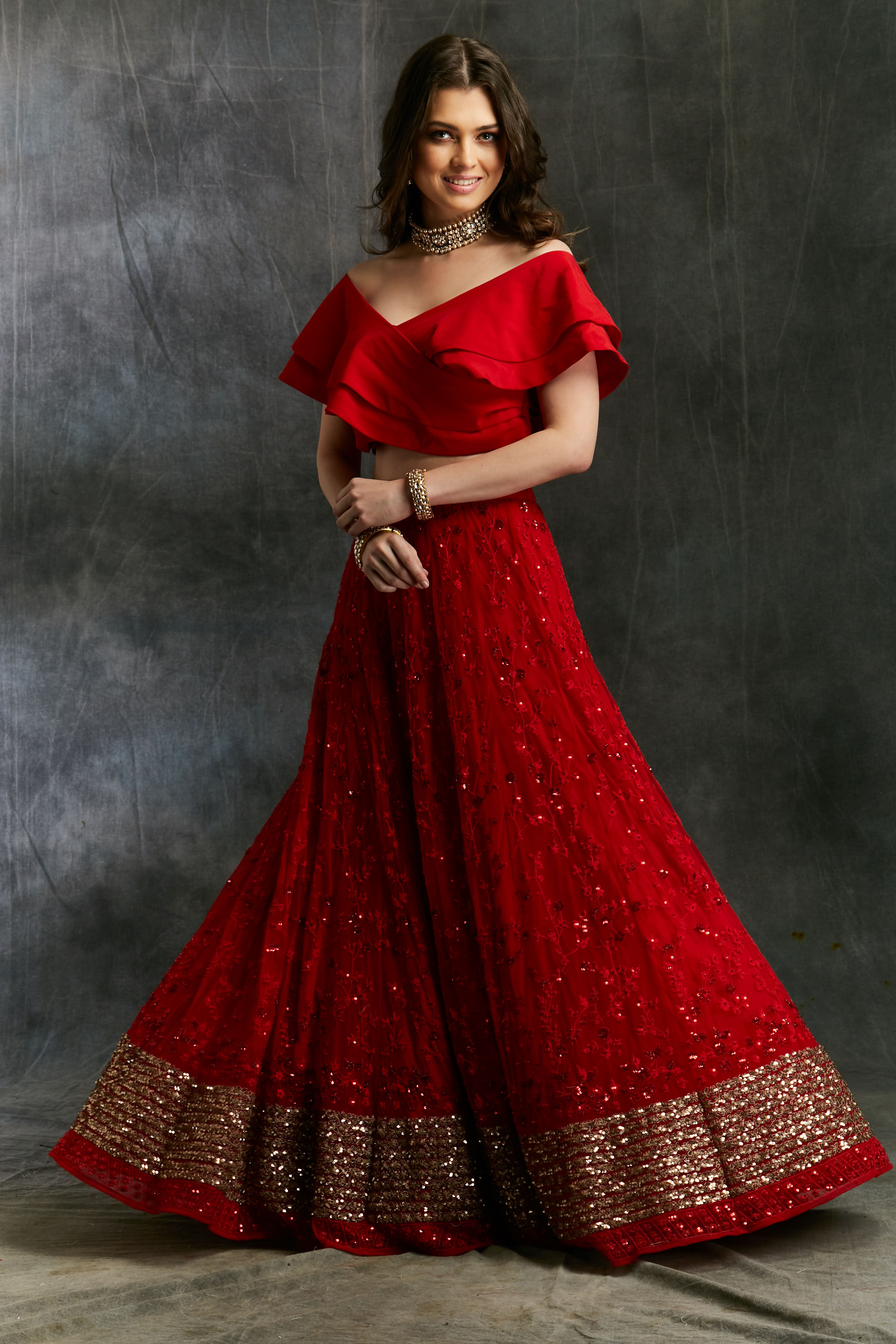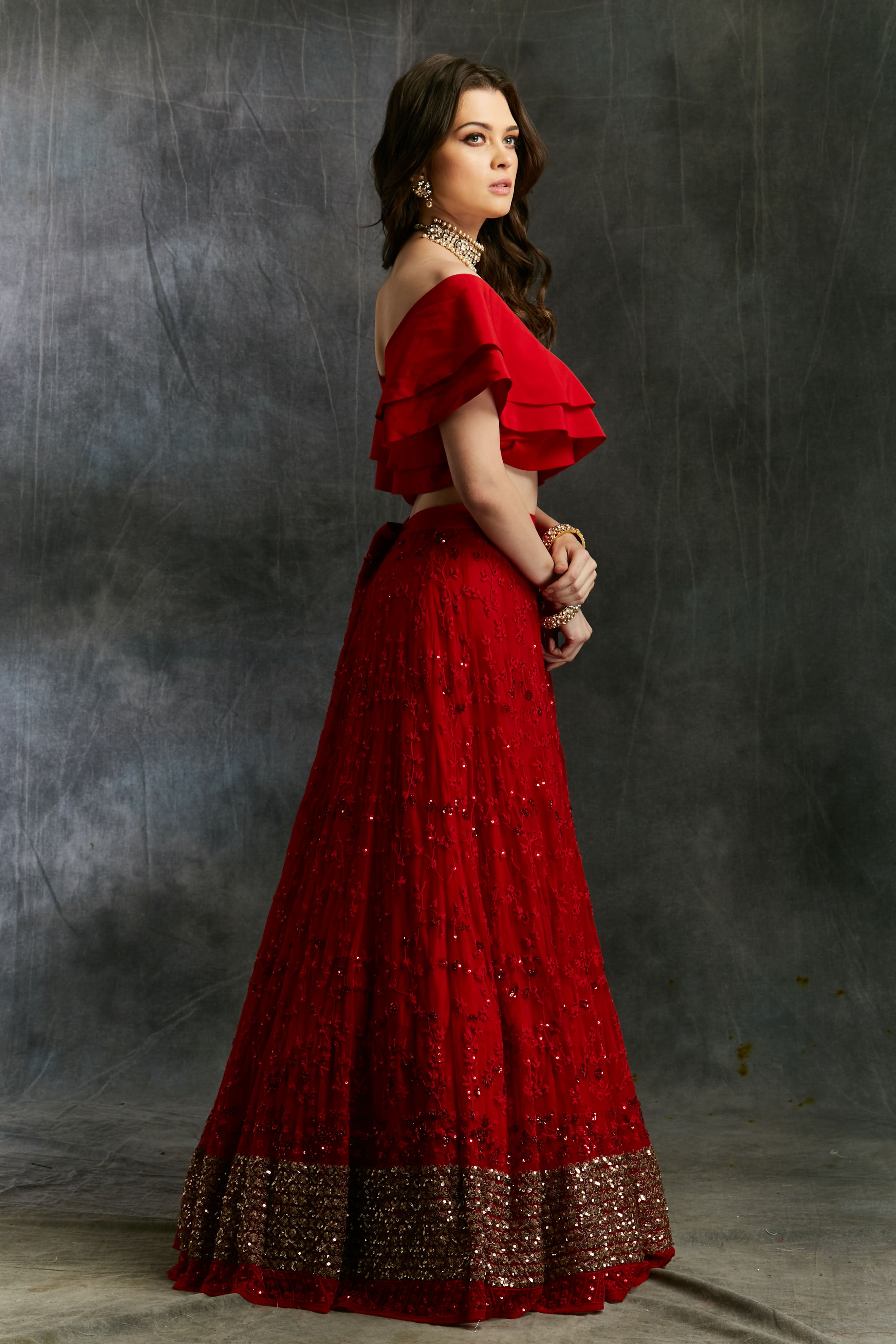 Featuring a OFF SHOULDER CROP TOP WITH RED EMBROIDERED LEHENGA IN NET.