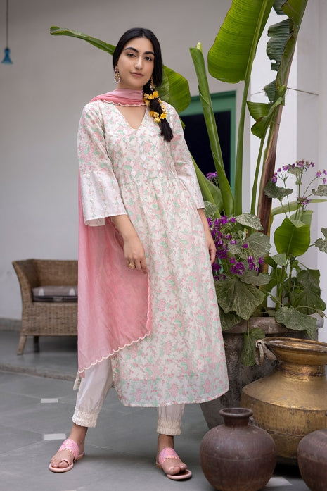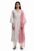 An Off-White block printed handwoven Chanderi kurta, is paired with an Off-White cotton salwar, offering both comfort and grace. Completing the ensemble is a Pink Ombre pure Silk Chanderi dupatta, adorned with intricate hand embroidery, creating a chic elegant style.