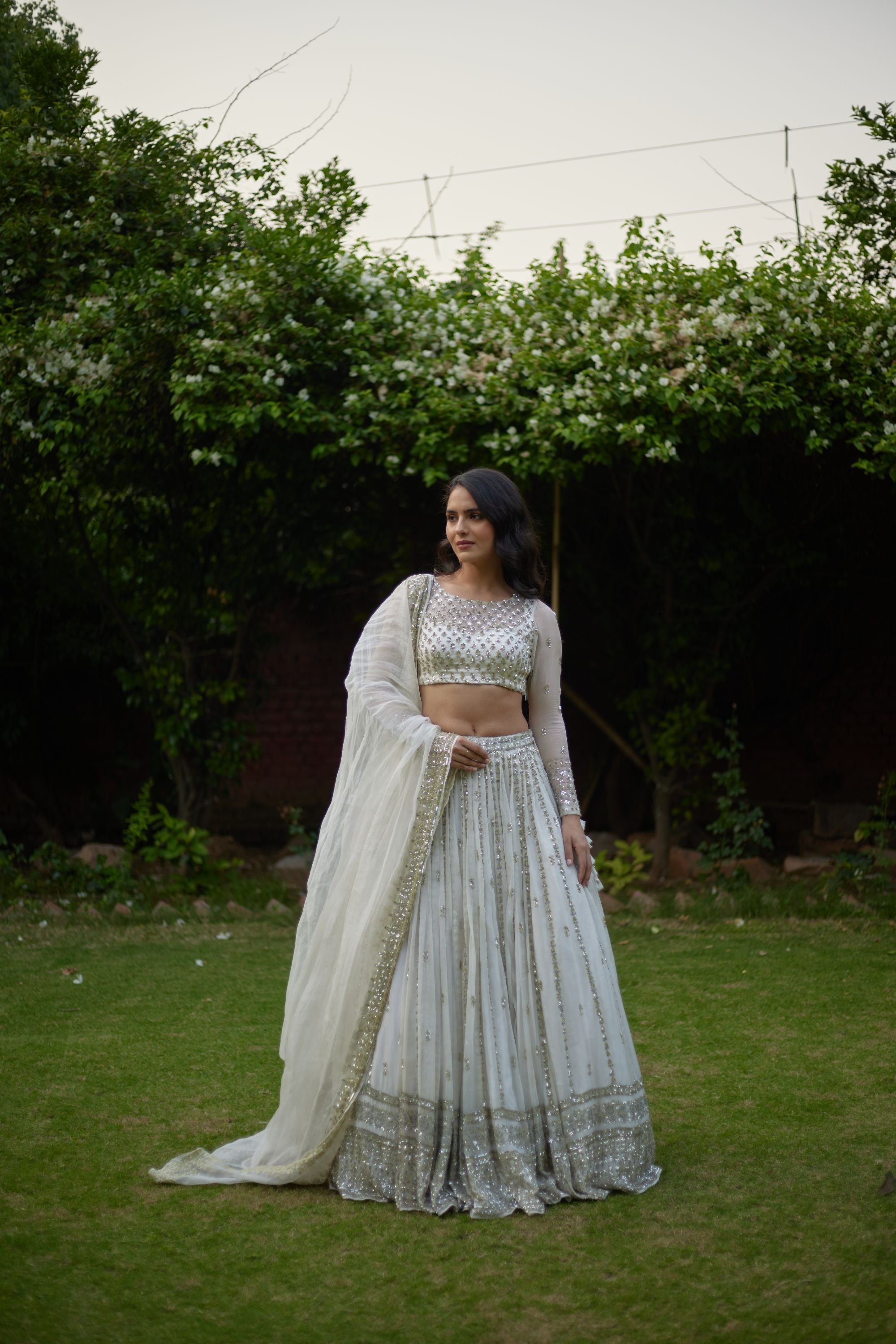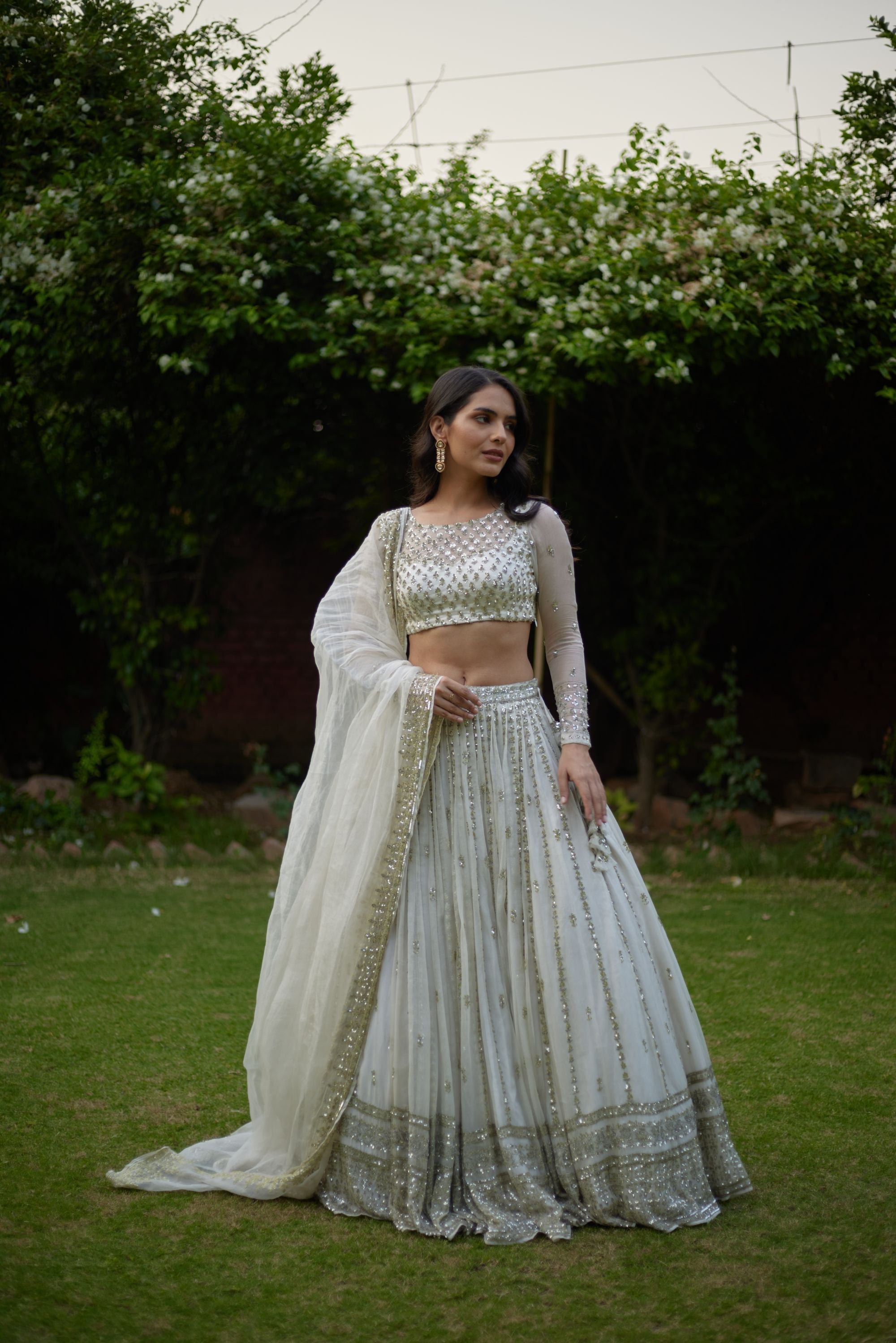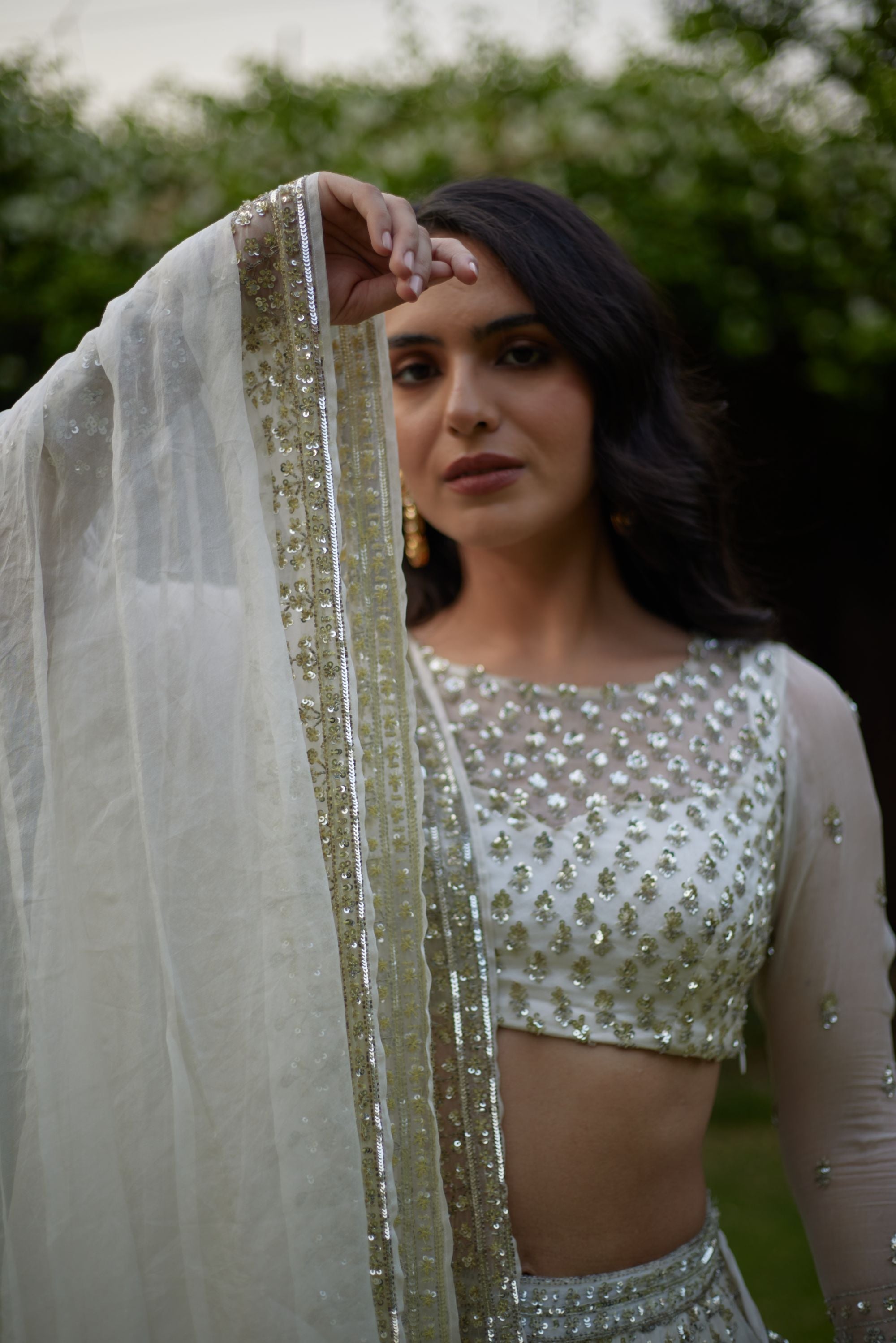 Featuring a Off white Heavy Line work Lehenga set in Organza.