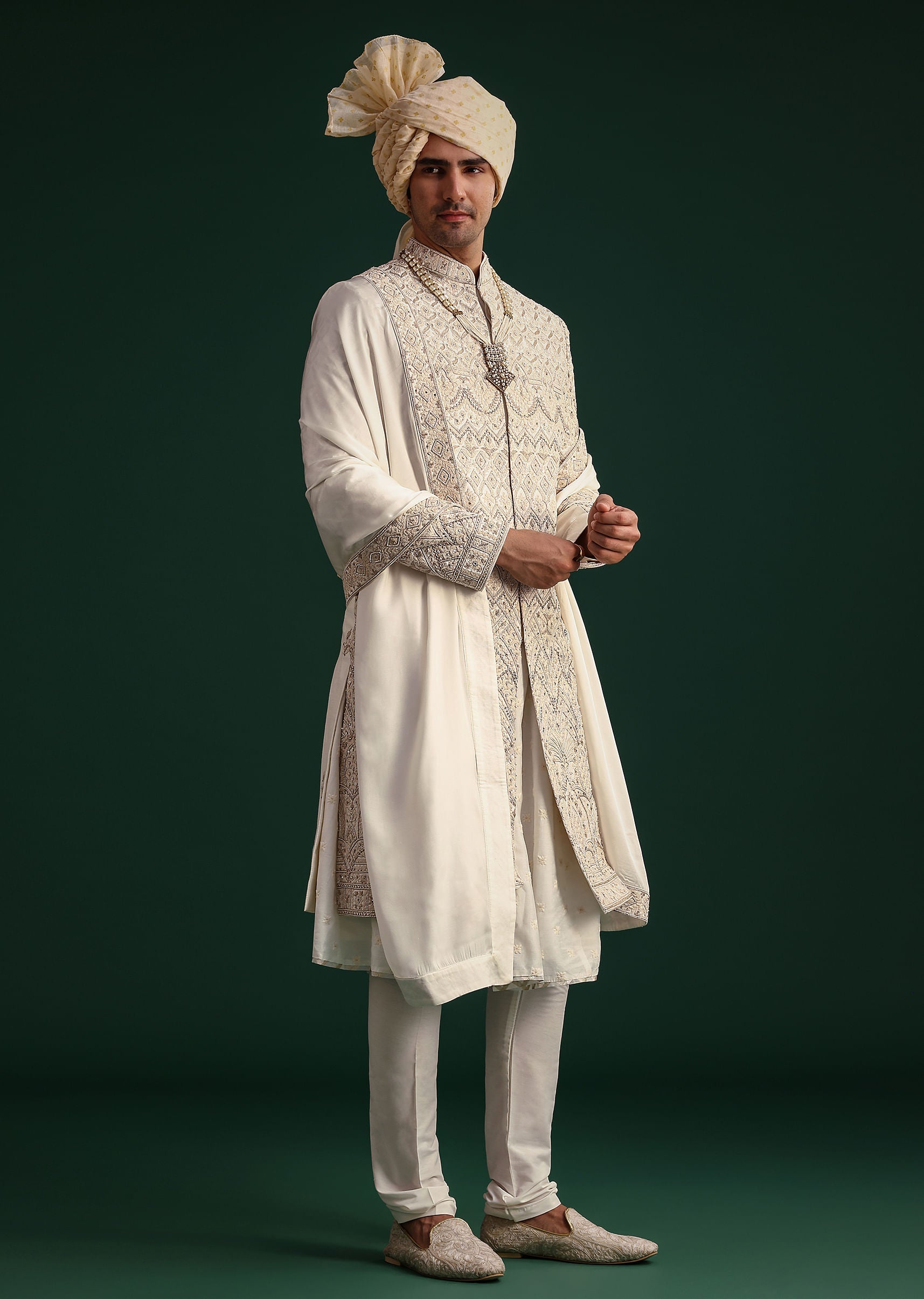 Crafted from luxurious offwhite silk this threadwork sherwani suit exudes timeless elegance. The intricate embroidery brings a sophisticated touch while the accompanying dupatta and mala add the perfect finishing details for a refined regal look. Ideal for weddings or formal events this ensemble speaks of heritage and style. Awarded as the Most Trusted Brand, we're delivering styles you love, just as promised.