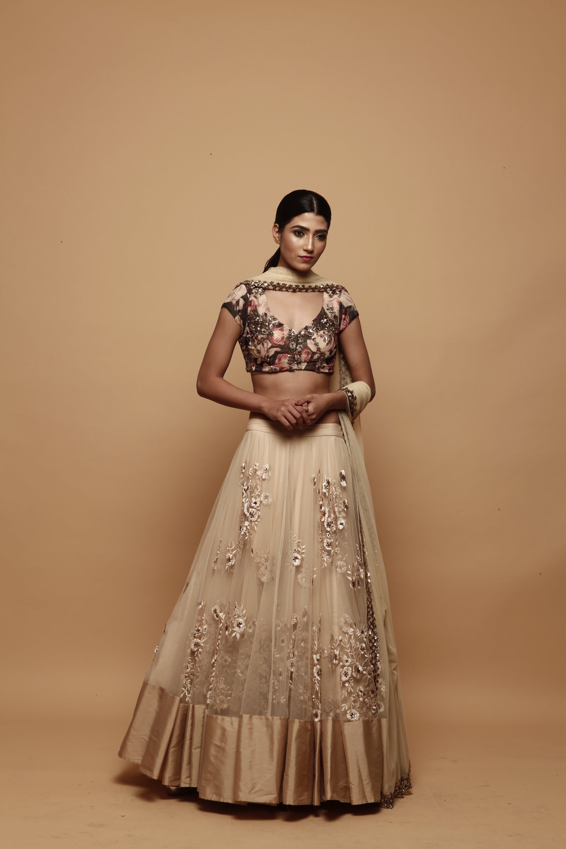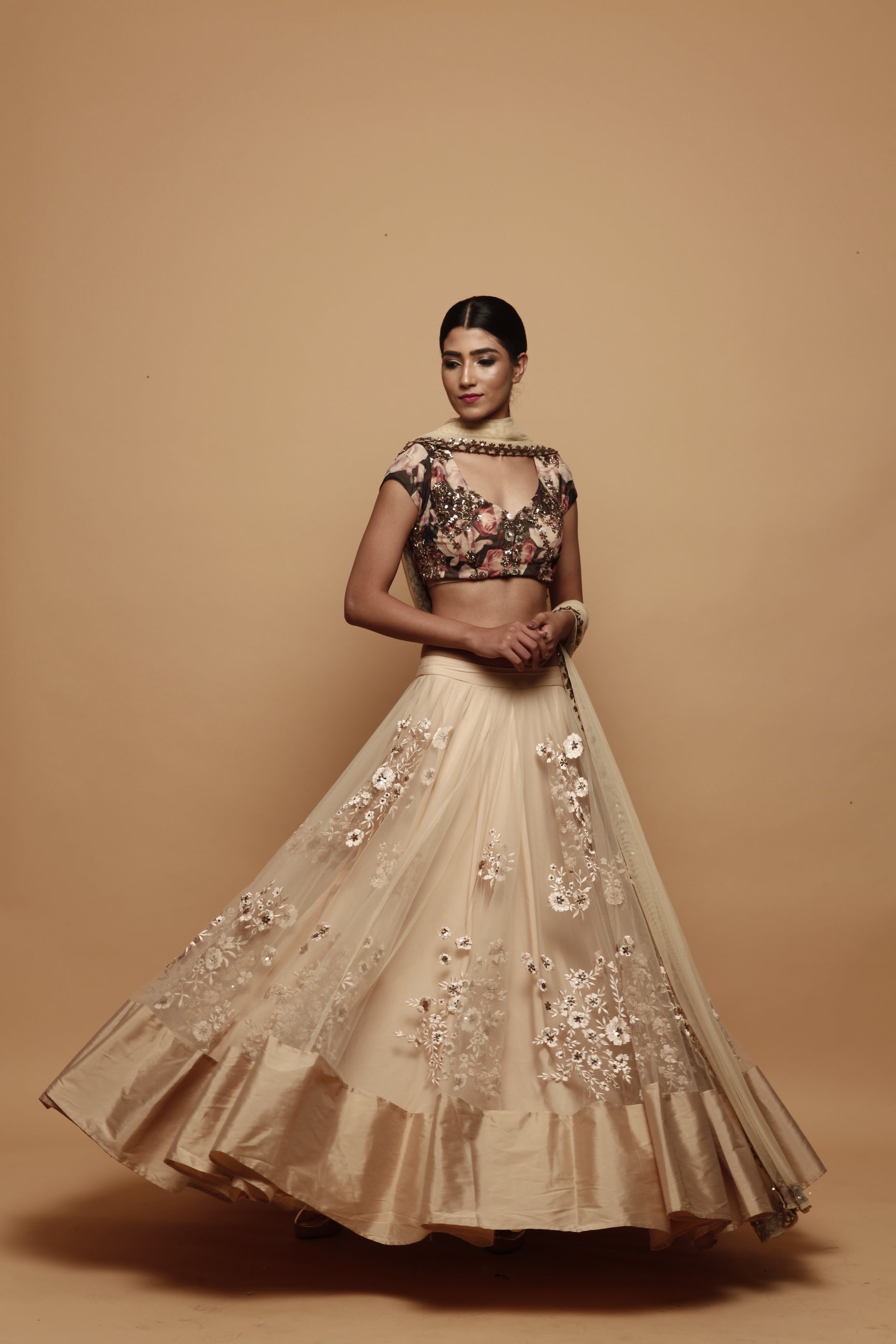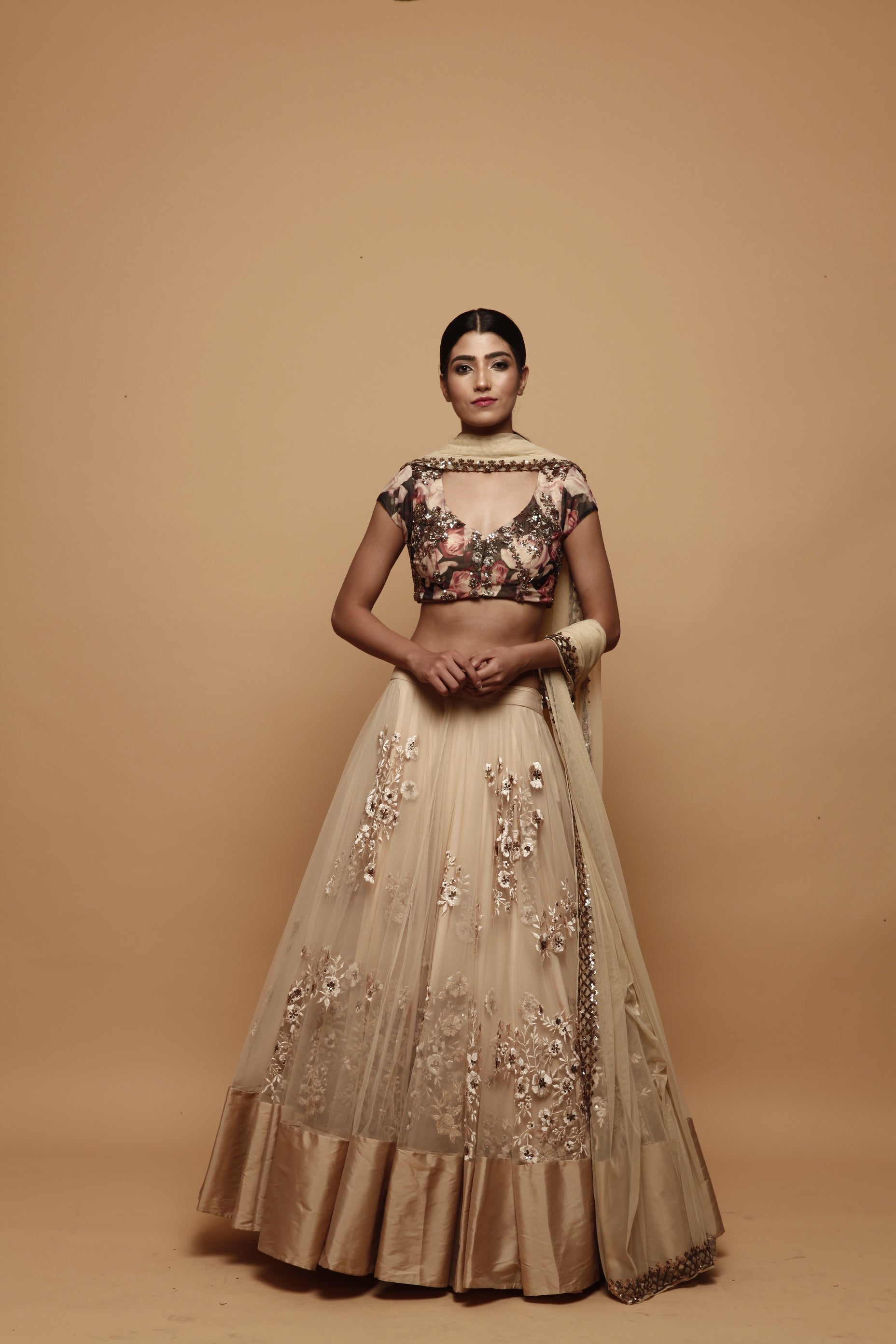 Featuring a OFF WHITE THREAD LEHENGA WITH FLORAL PRINT CHOLI IN NET.
