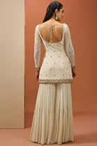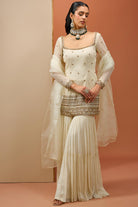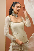 This Consist of Offwhite kurta with handwork on neckline and hemline.It is paired with Sharara and Dupatta