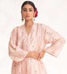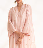 A nude pink kurta set, harmonized with straight pants, is elevated by exquisite antique gold zardozi embroidery, delicately embellished with loops on the neckline.