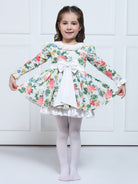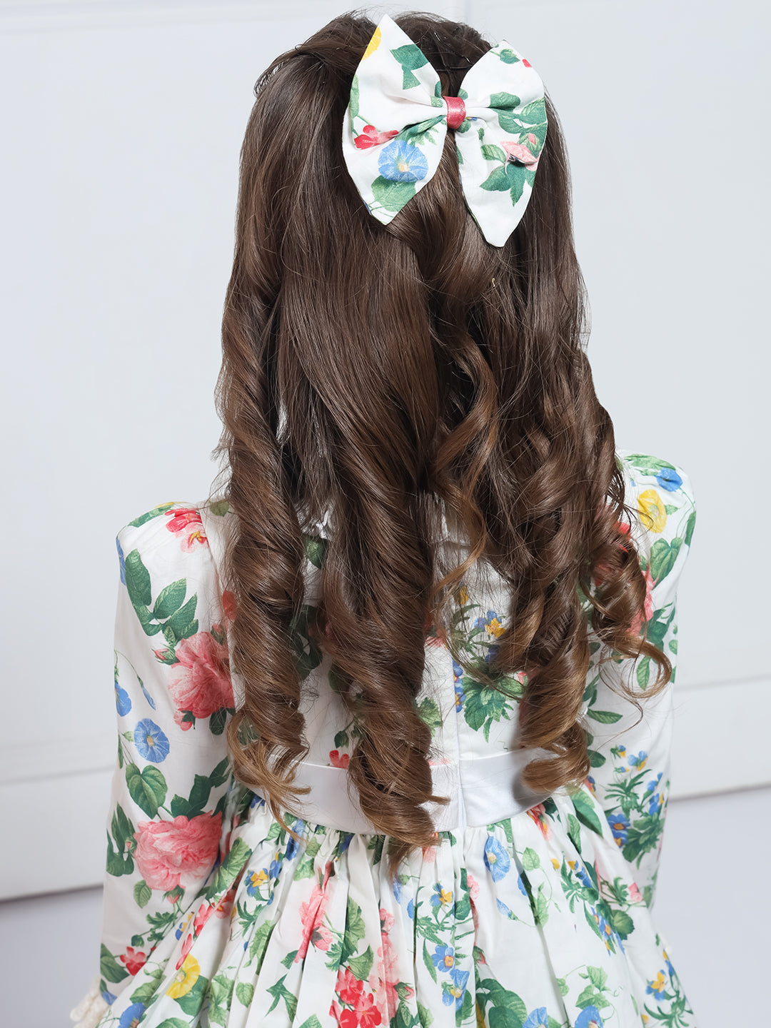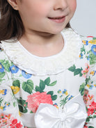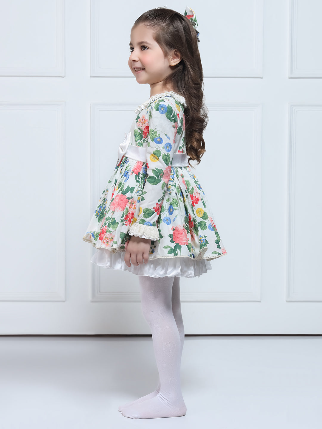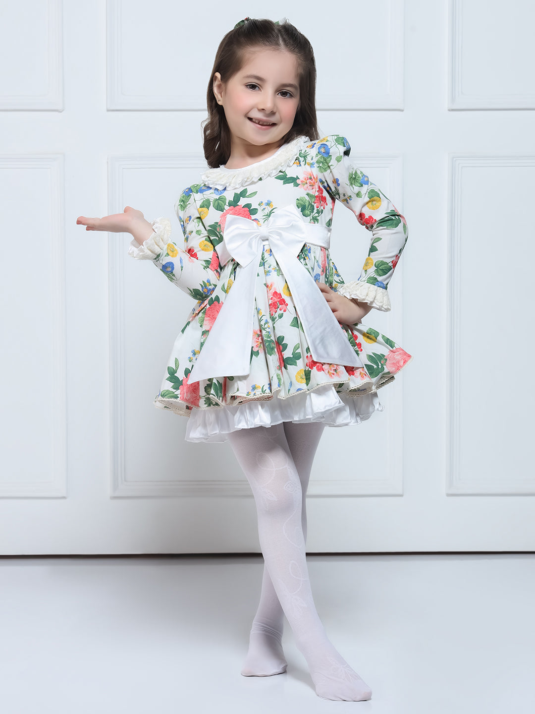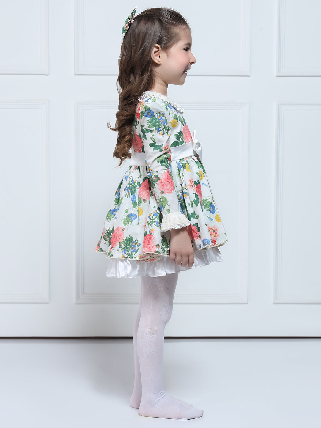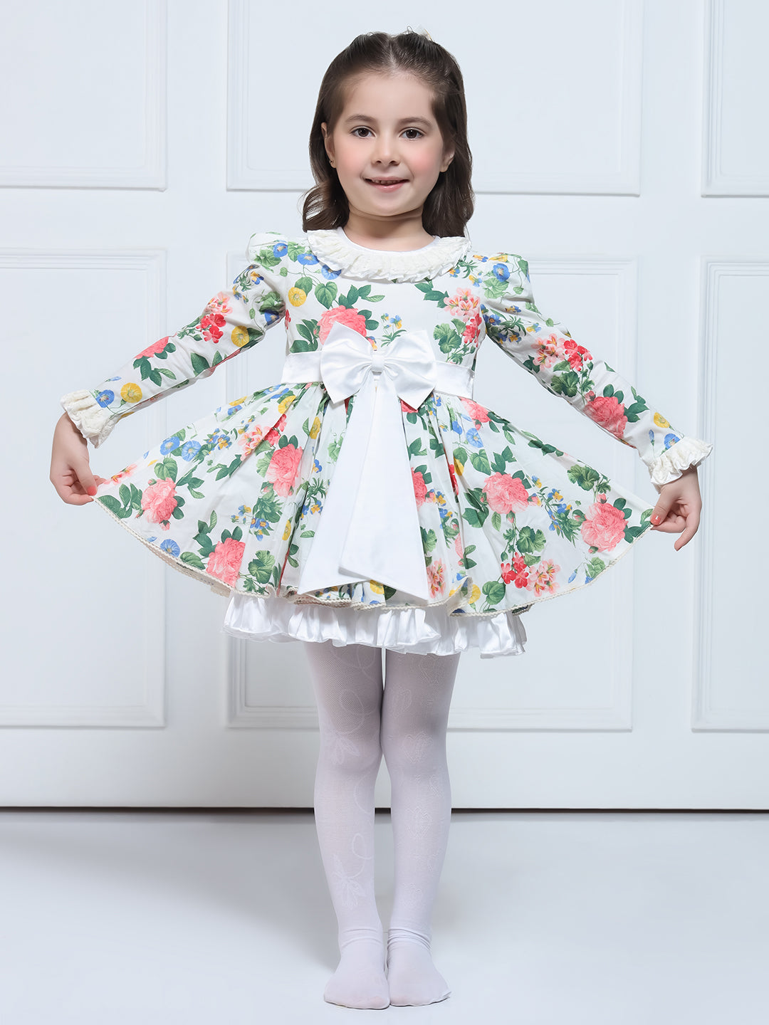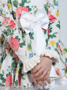 * LACE AND SATIN FRILLED COLLARS , CUFFS AND BIG BOW AT THE BELT.