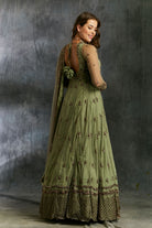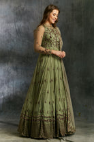 Featuring a OLIVE GREEN ANARKALI WITH DUPATTA AND BELT IN NET.