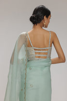 A mint organza saree, embellished with rhinestone accents along its hem, creating a mesmerizing allure. Accompanying this is a banarasi brocade blouse, its elegance further enhanced by rhinestone embellishments on the delicate straps. This ensemble is a seamless fusion of textures and embellishments.