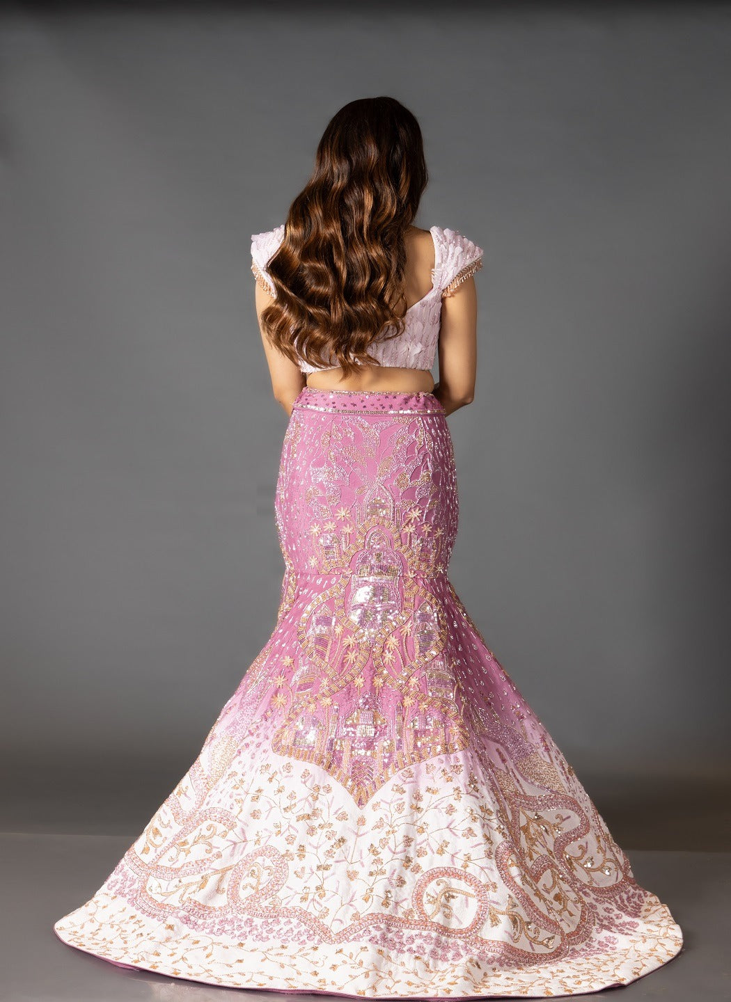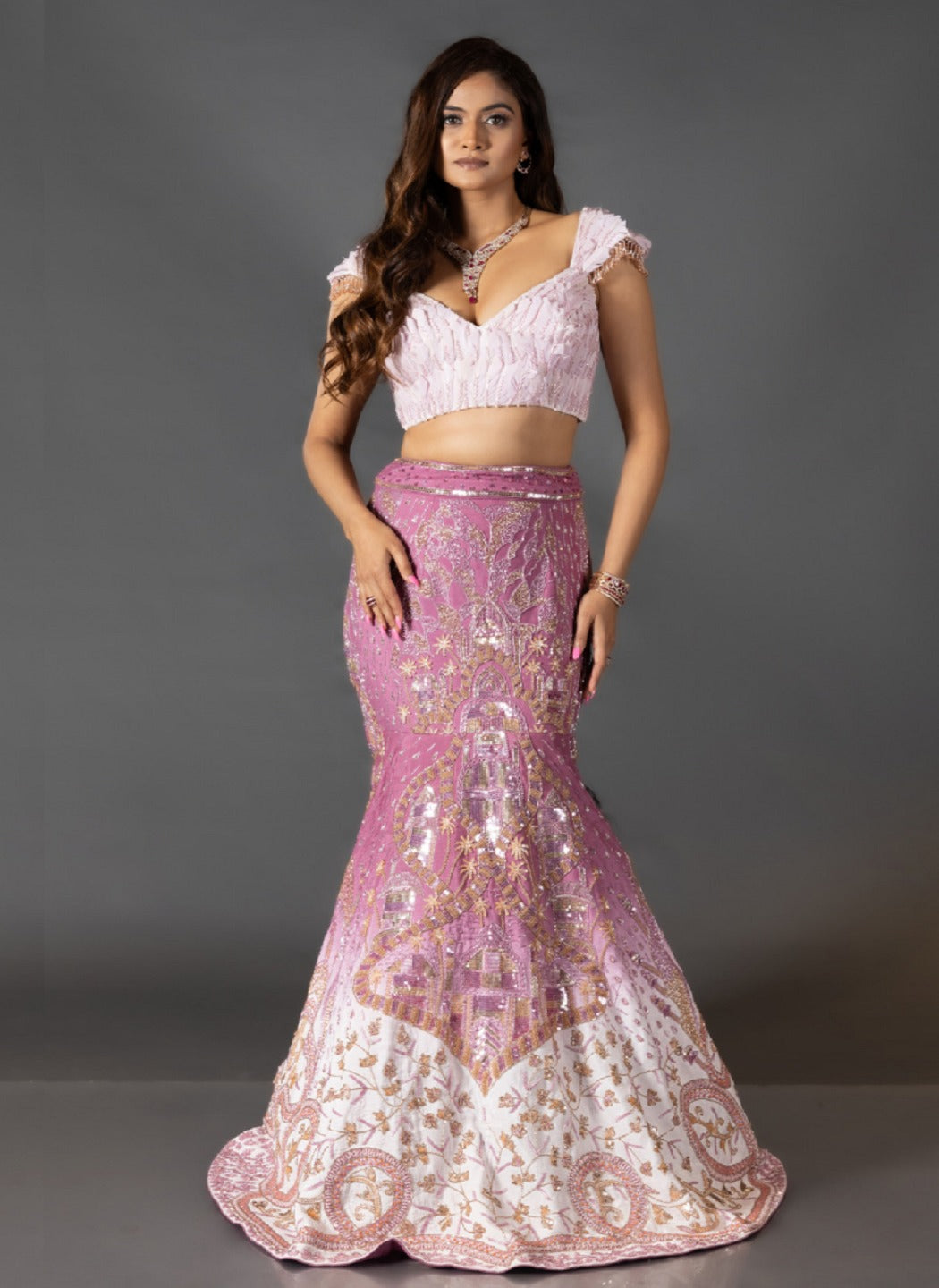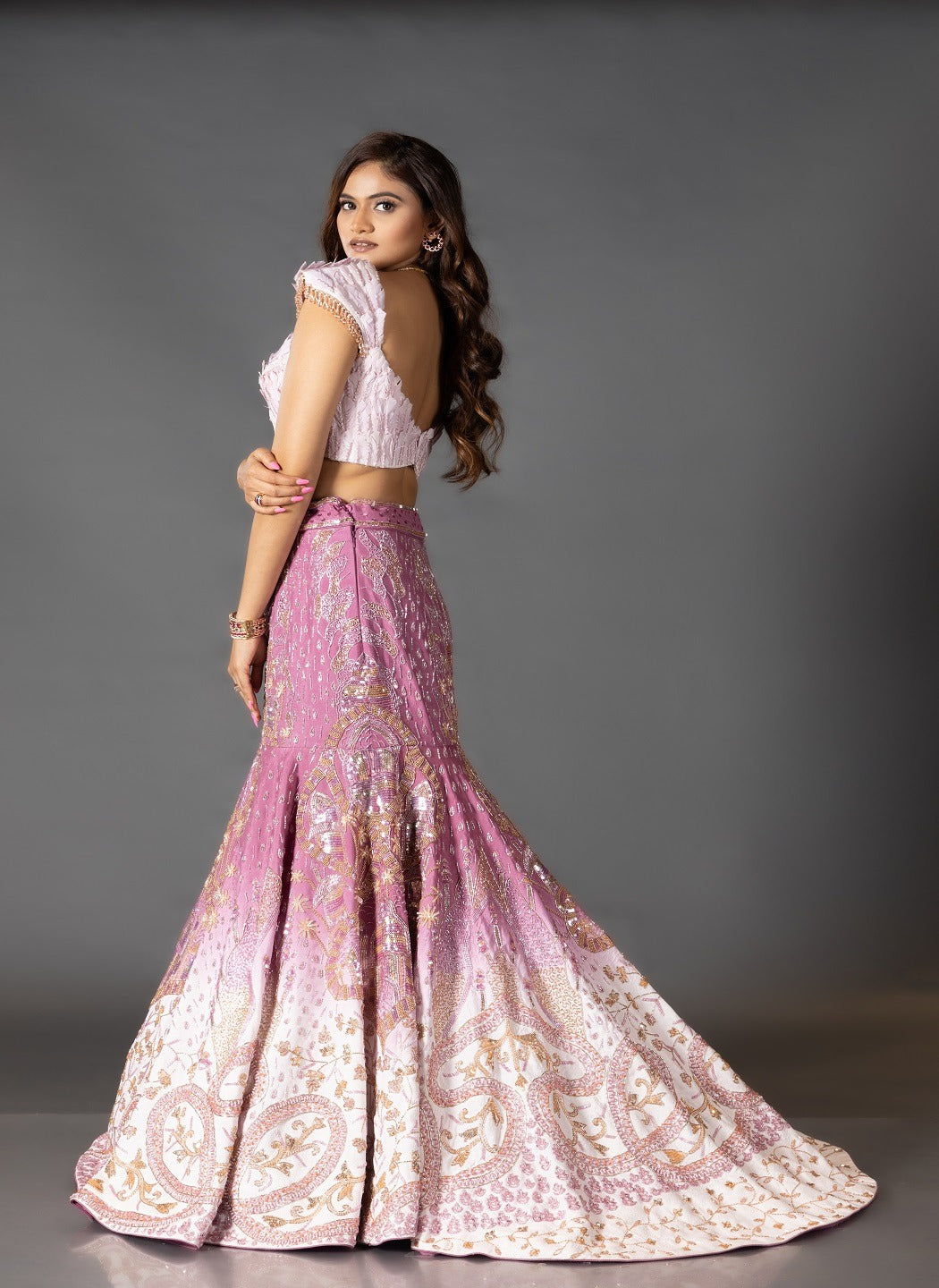 This stunning outfit is crafted in a dreamy shade of mauve, embroidered with sequins and beadwork featuring ombre fish-cut lehenga as the key highlight.