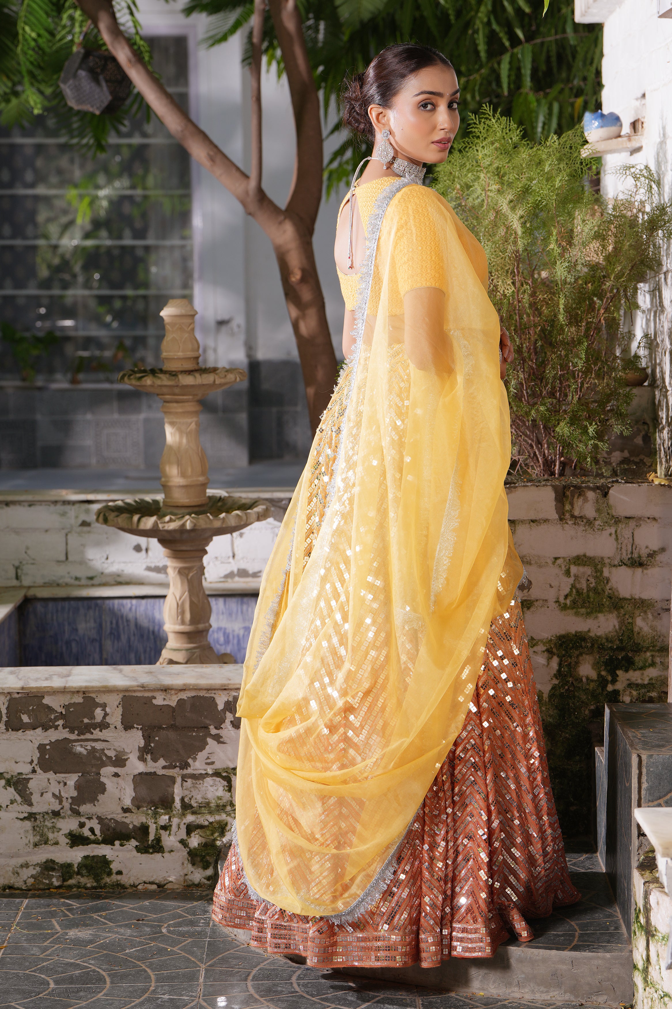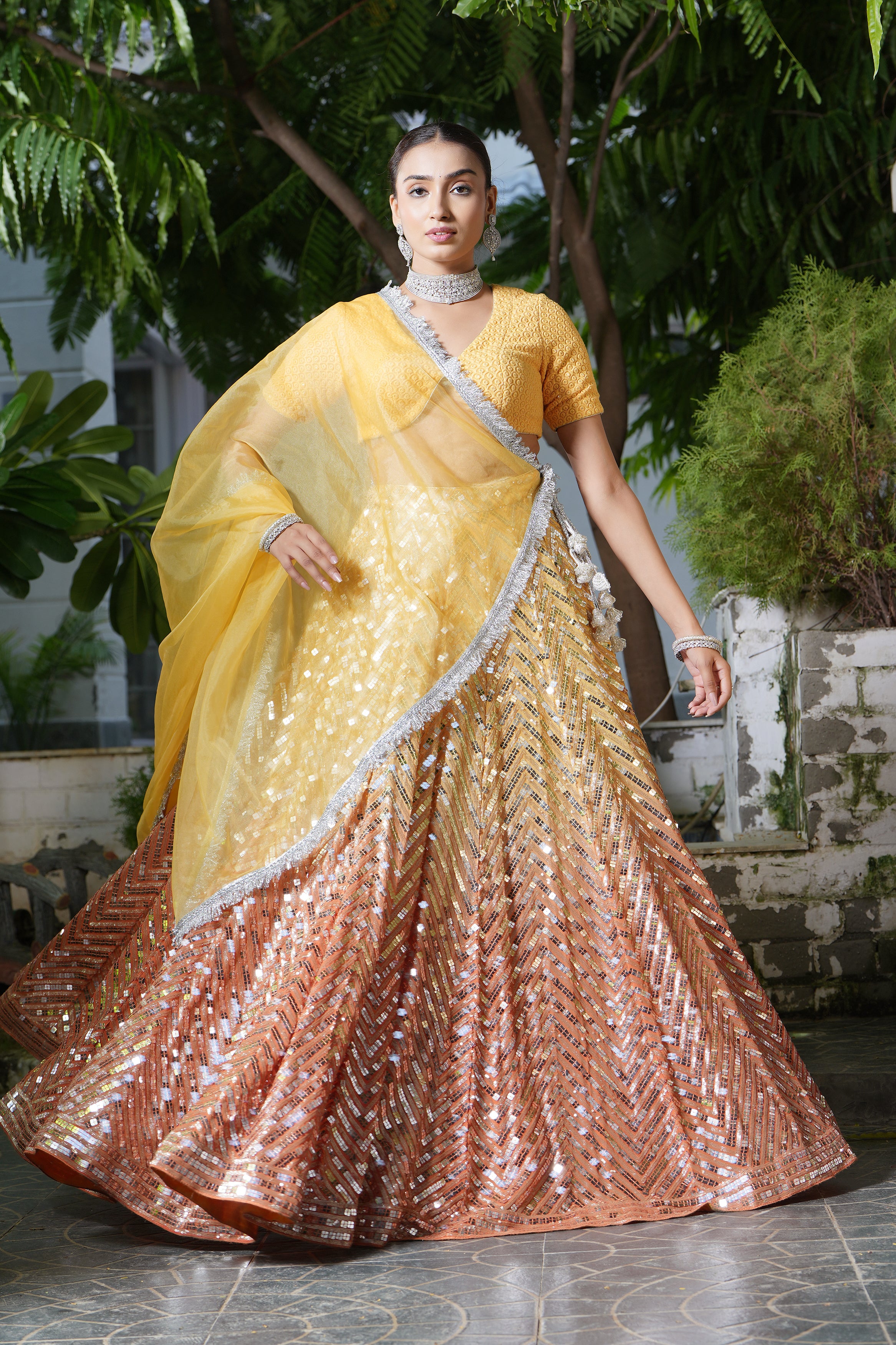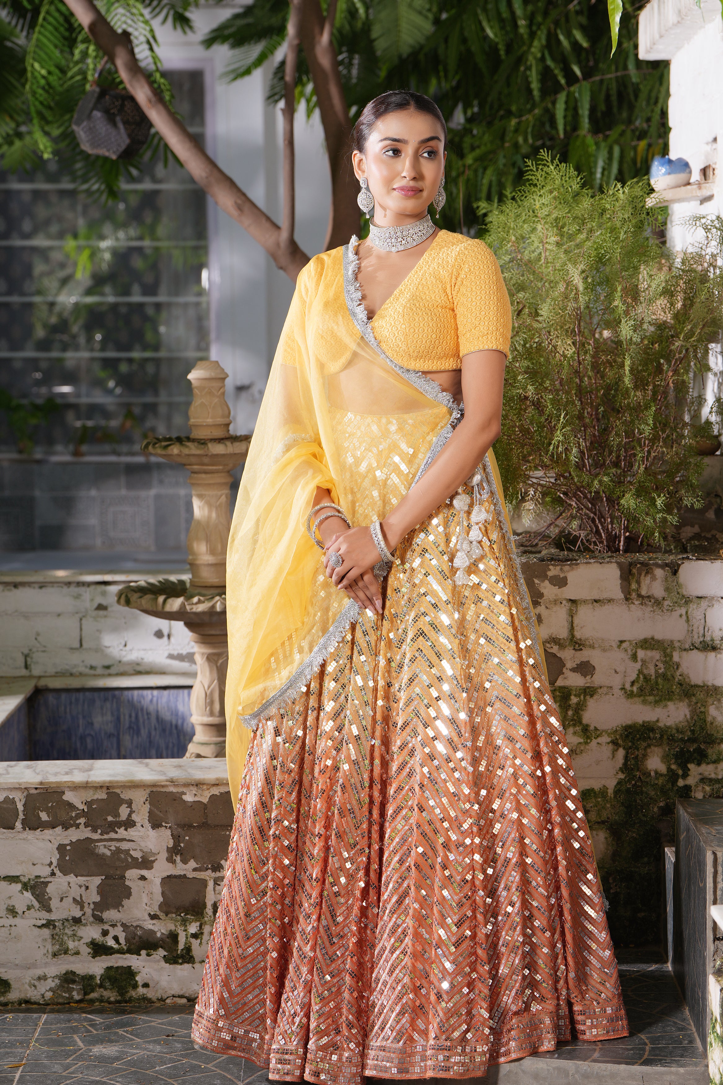 Ombre orange sequins chevron lehenga. Yellow embroidered V neckline blouse and matching net dupatta. Silver lace on dupatta.
