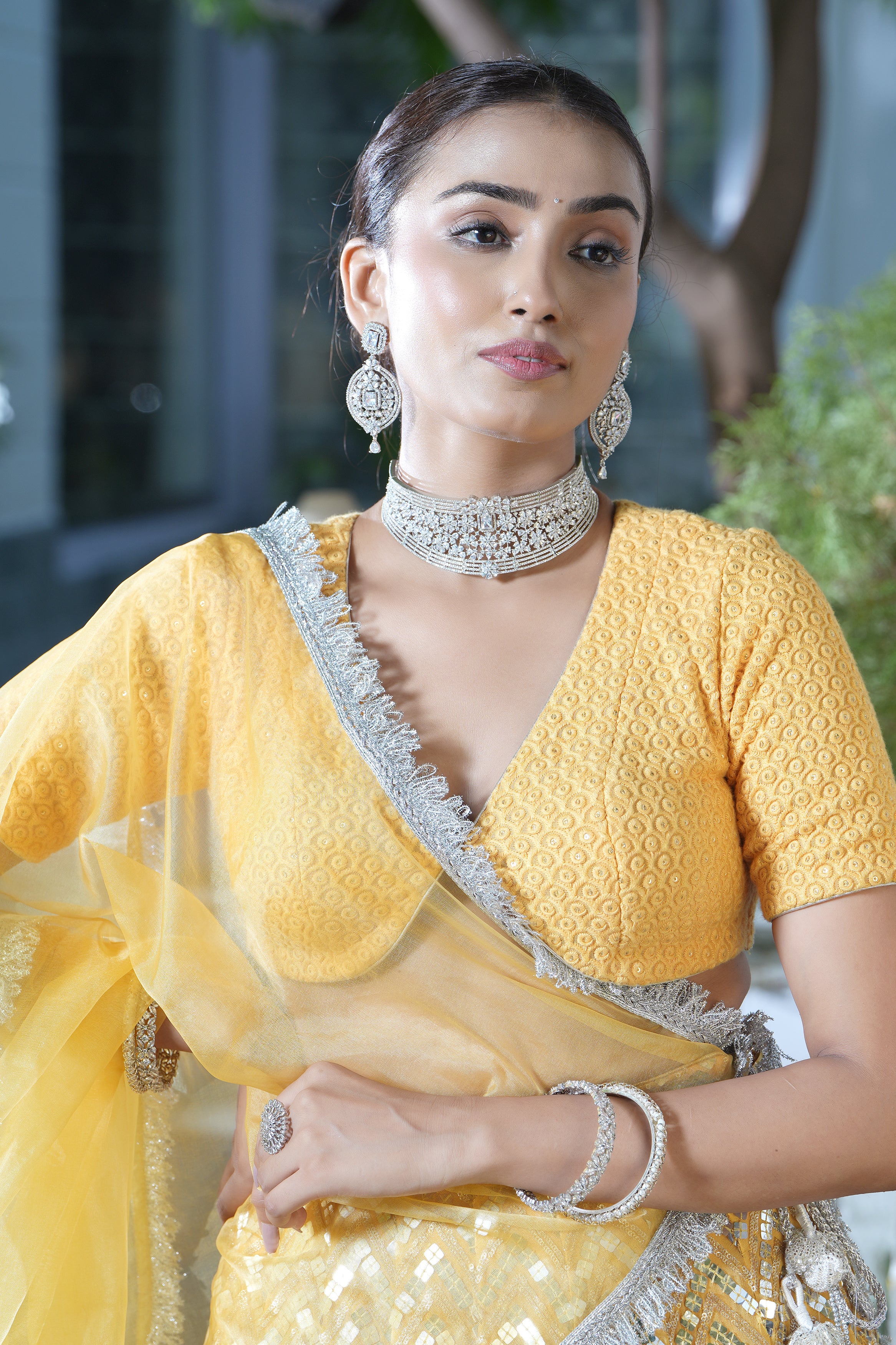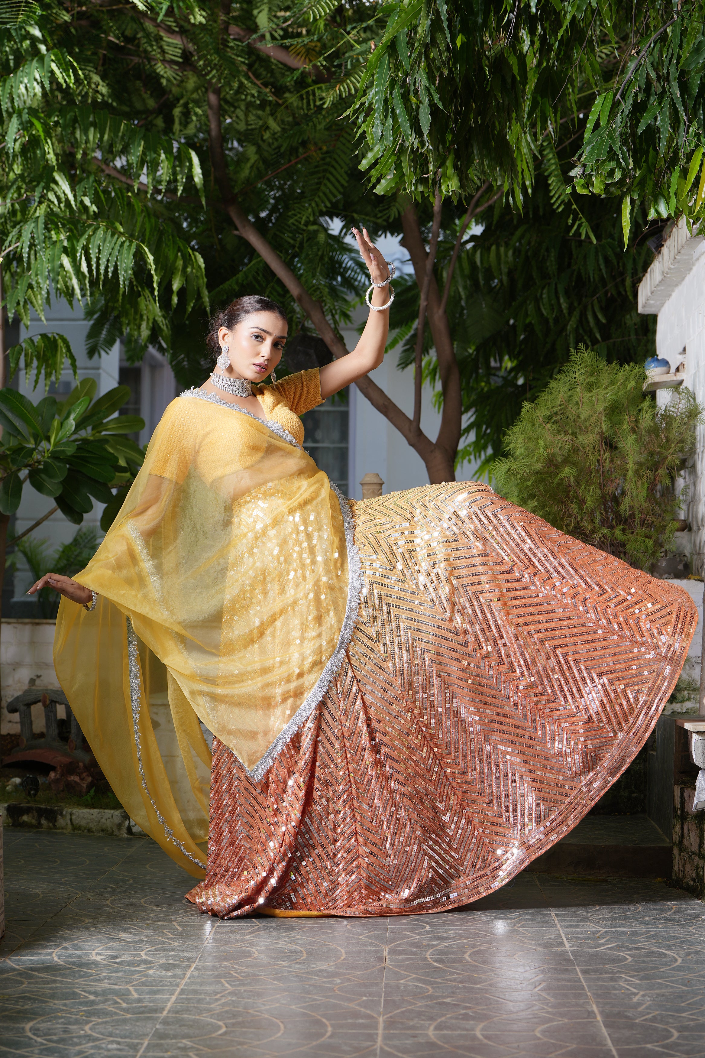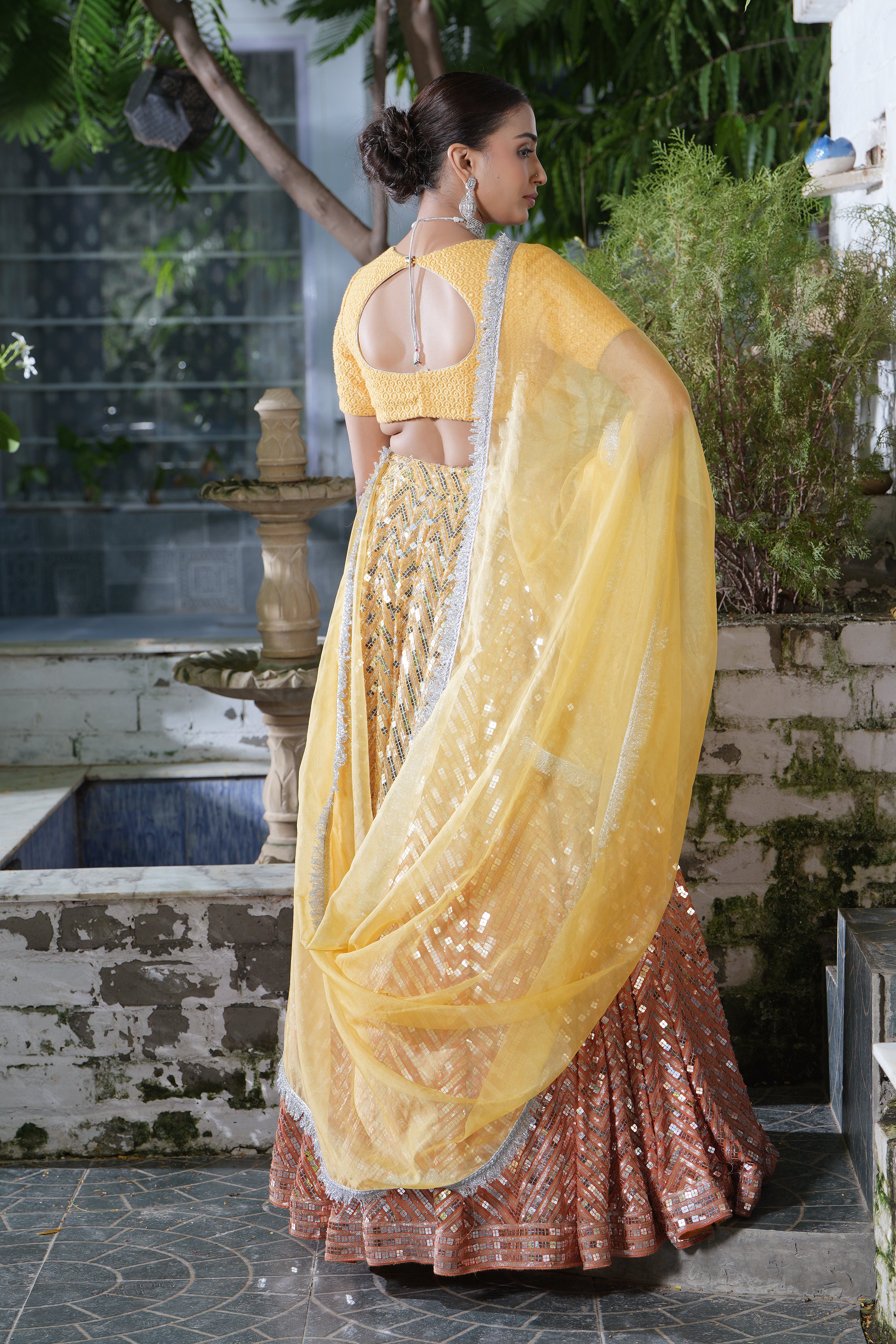 Ombre orange sequins chevron lehenga. Yellow embroidered V neckline blouse and matching net dupatta. Silver lace on dupatta.