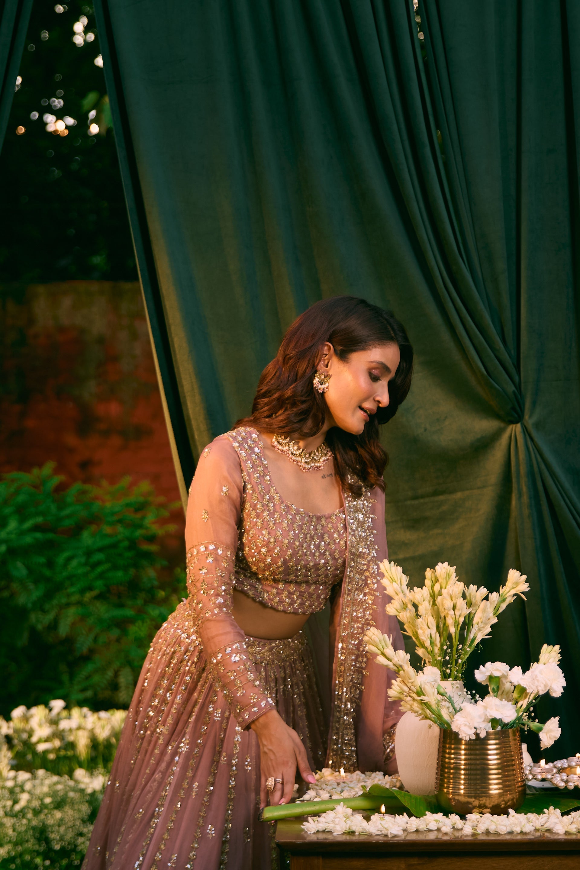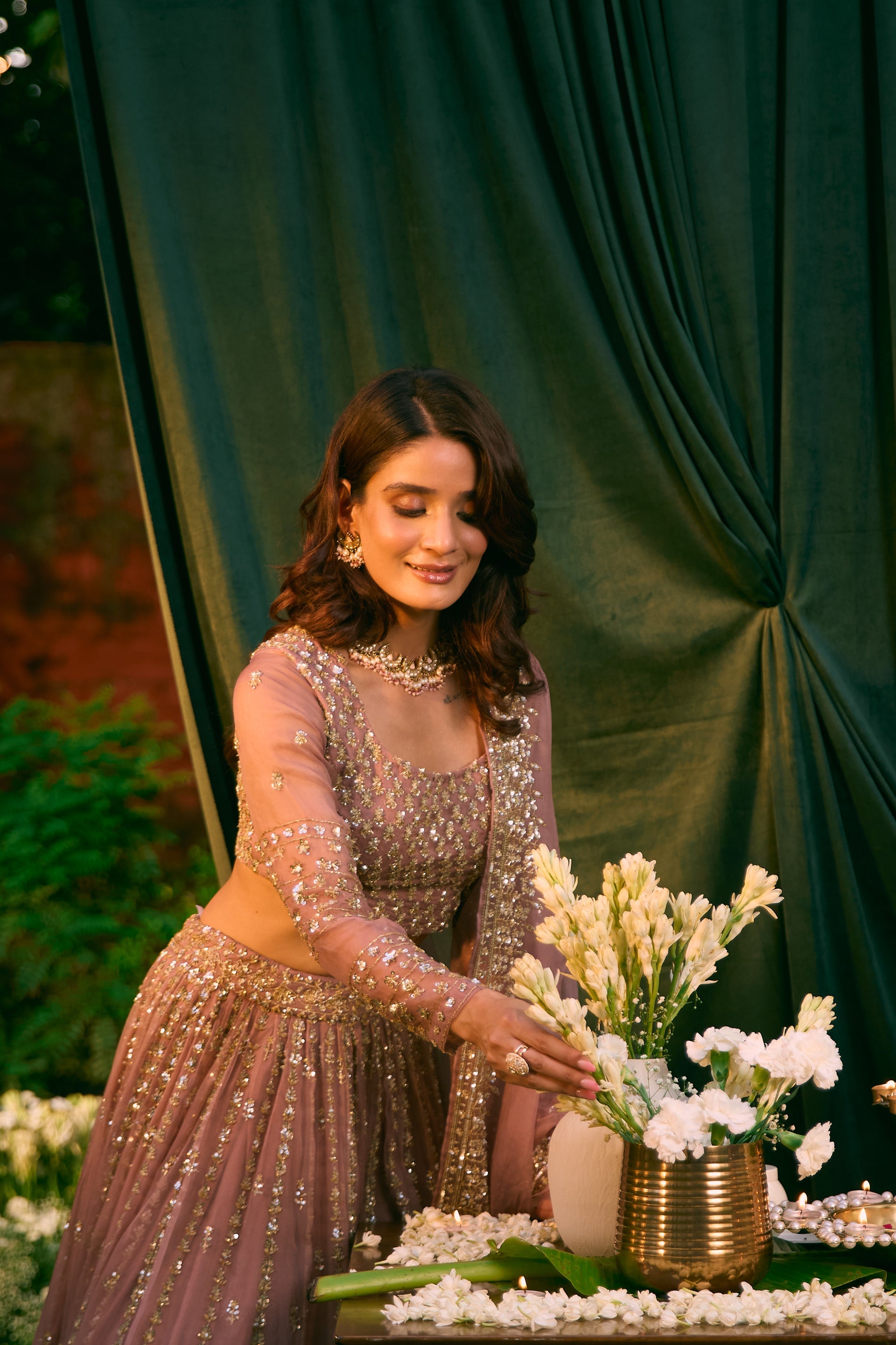 Featuring a Onion Pink Organza Line work Lehenga Set in Organza Silk.