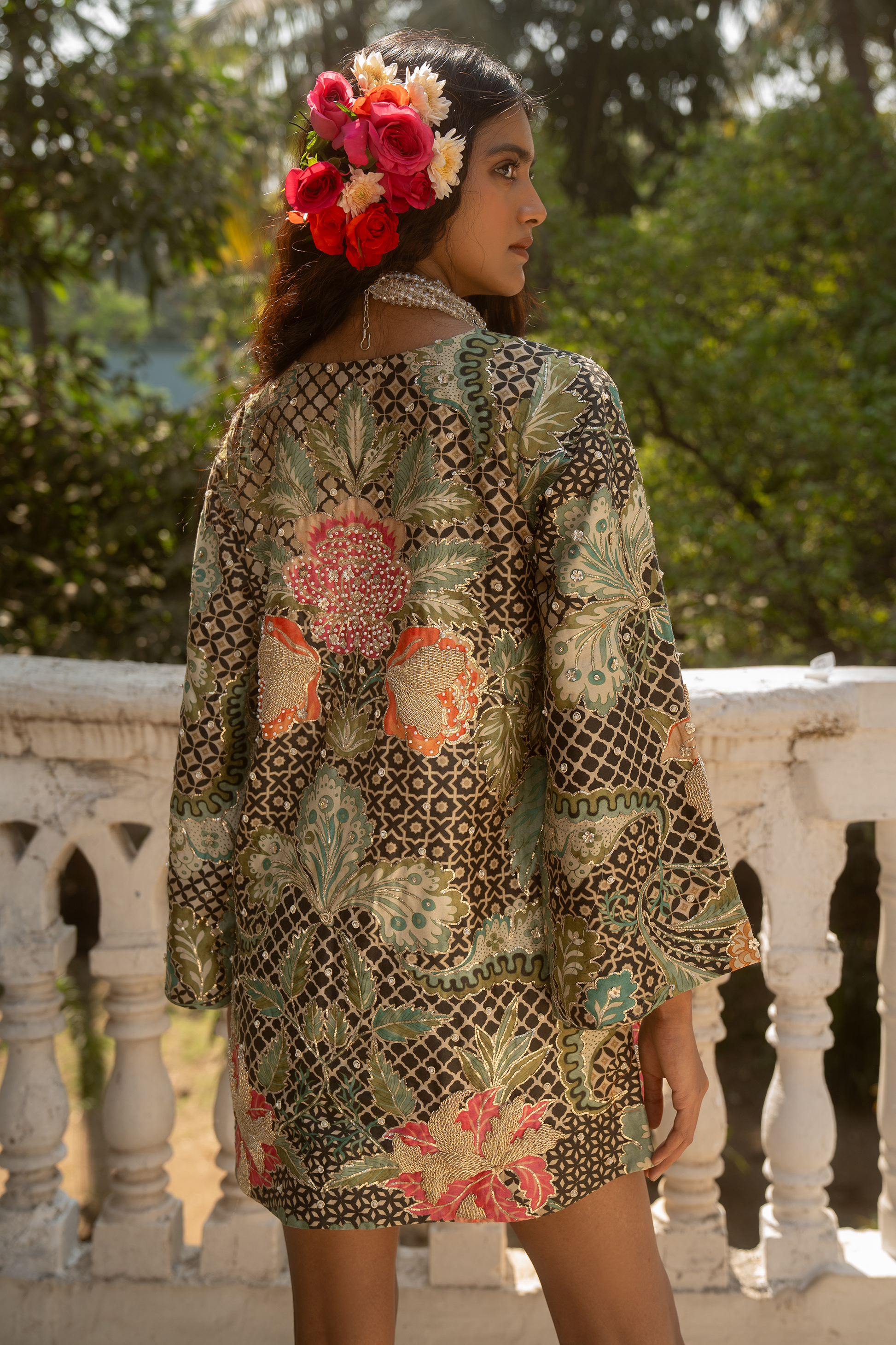 A placement print embroidered short dress, embellished with baby flowers and zardosi embroidery.