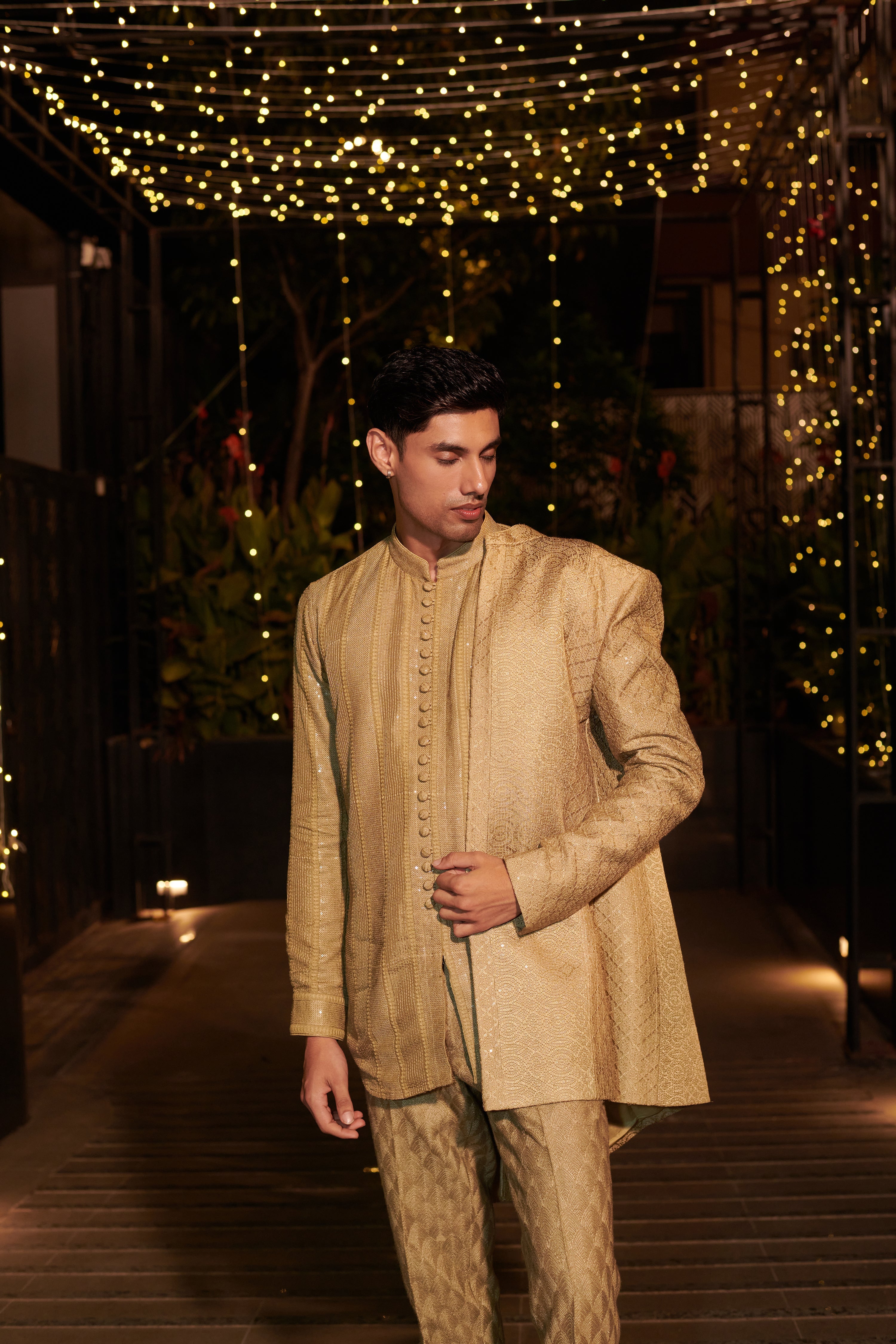 Make a refined statement with this men’s ensemble in a stunning Endive Green hue. Crafted with intricate hand-thread work that adorns the entire outfit, every stitch exudes artisanal craftsmanship and attention to detail. The short jacket features an open-front design with a sleek standing collar, adding a modern touch to a classic silhouette. Paired with tapered pants, this look offers a perfect balance of sophistication and contemporary flair. Ideal for formal gatherings or stylish evening events, this outfit ensures both comfort and elegance, offering a sharp, tailored fit that effortlessly combines tradition with innovation. Perfect for the fashion-conscious man seeking an elevated, unique style.