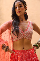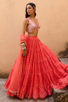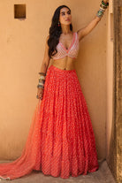 Bandhani printed frill skirt with mirror and leather applique blouse with tulle dupatta.