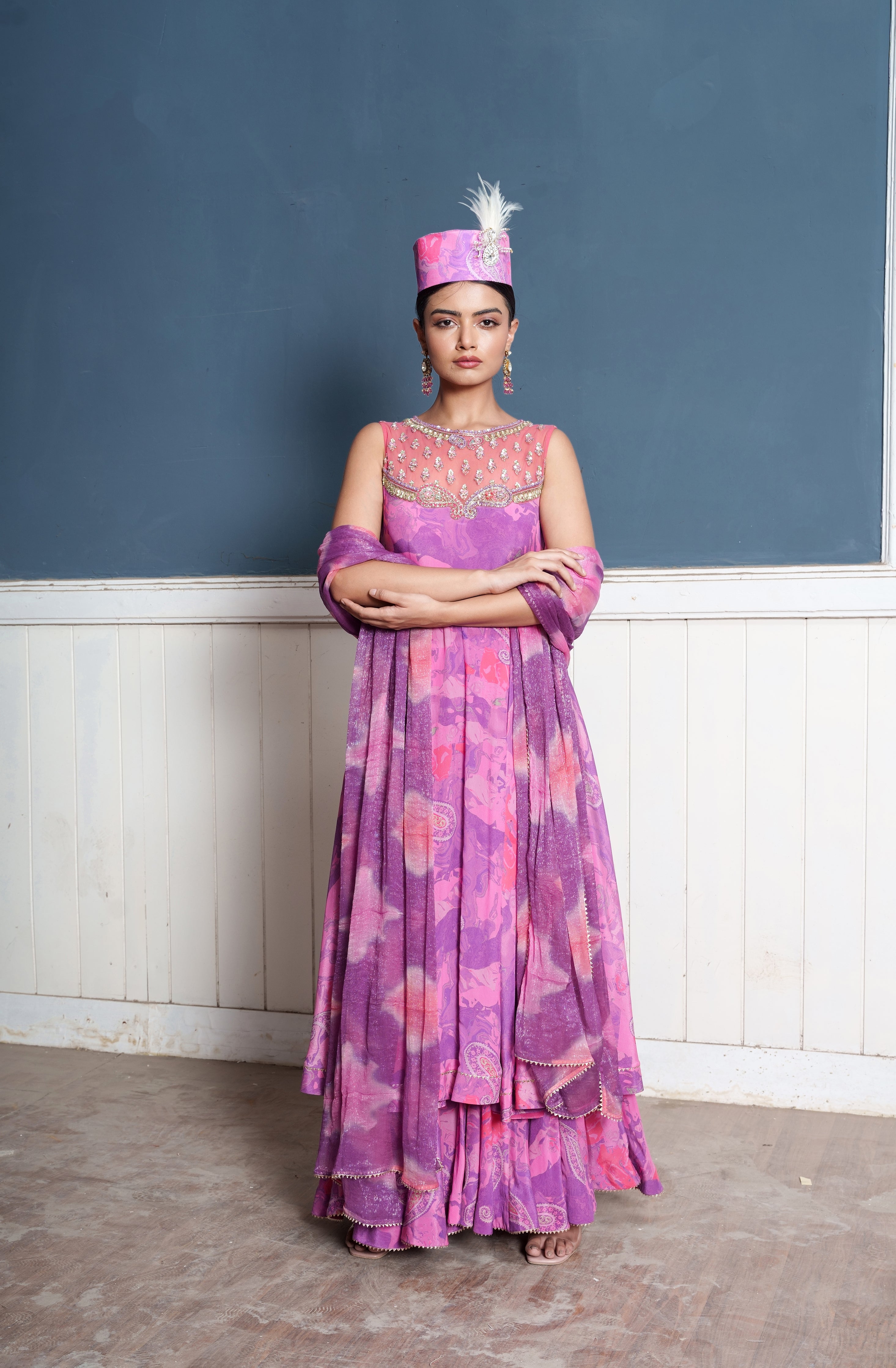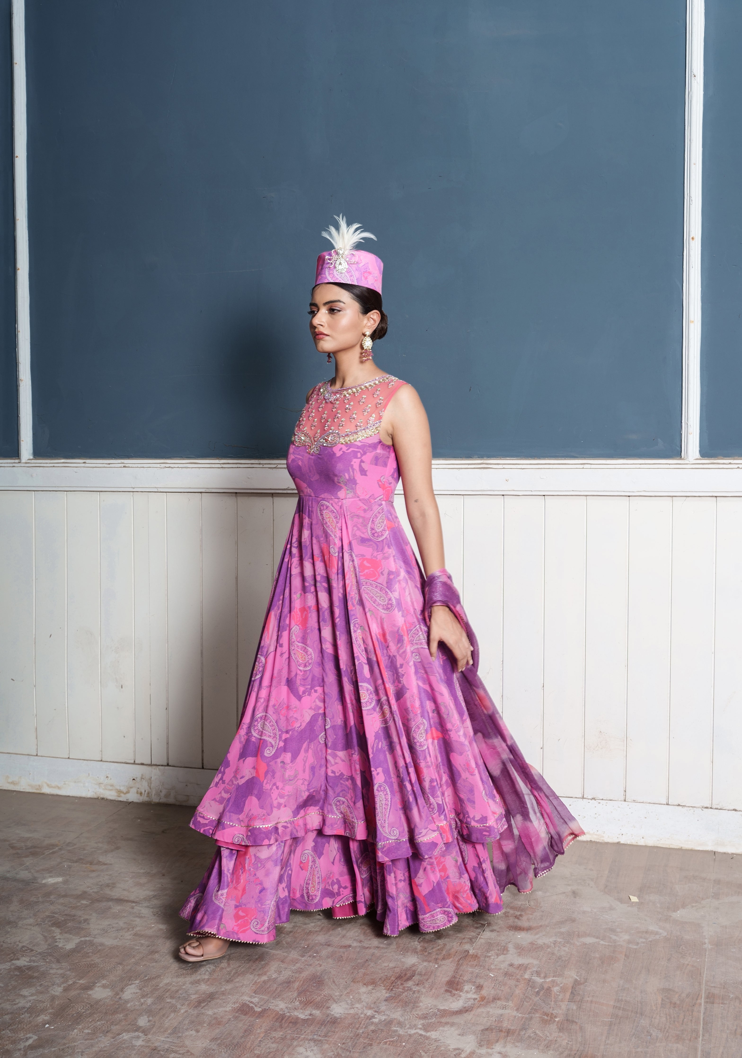 Paisley Embroidered Wildberry Printed Anarkali Palazzo Attached Set