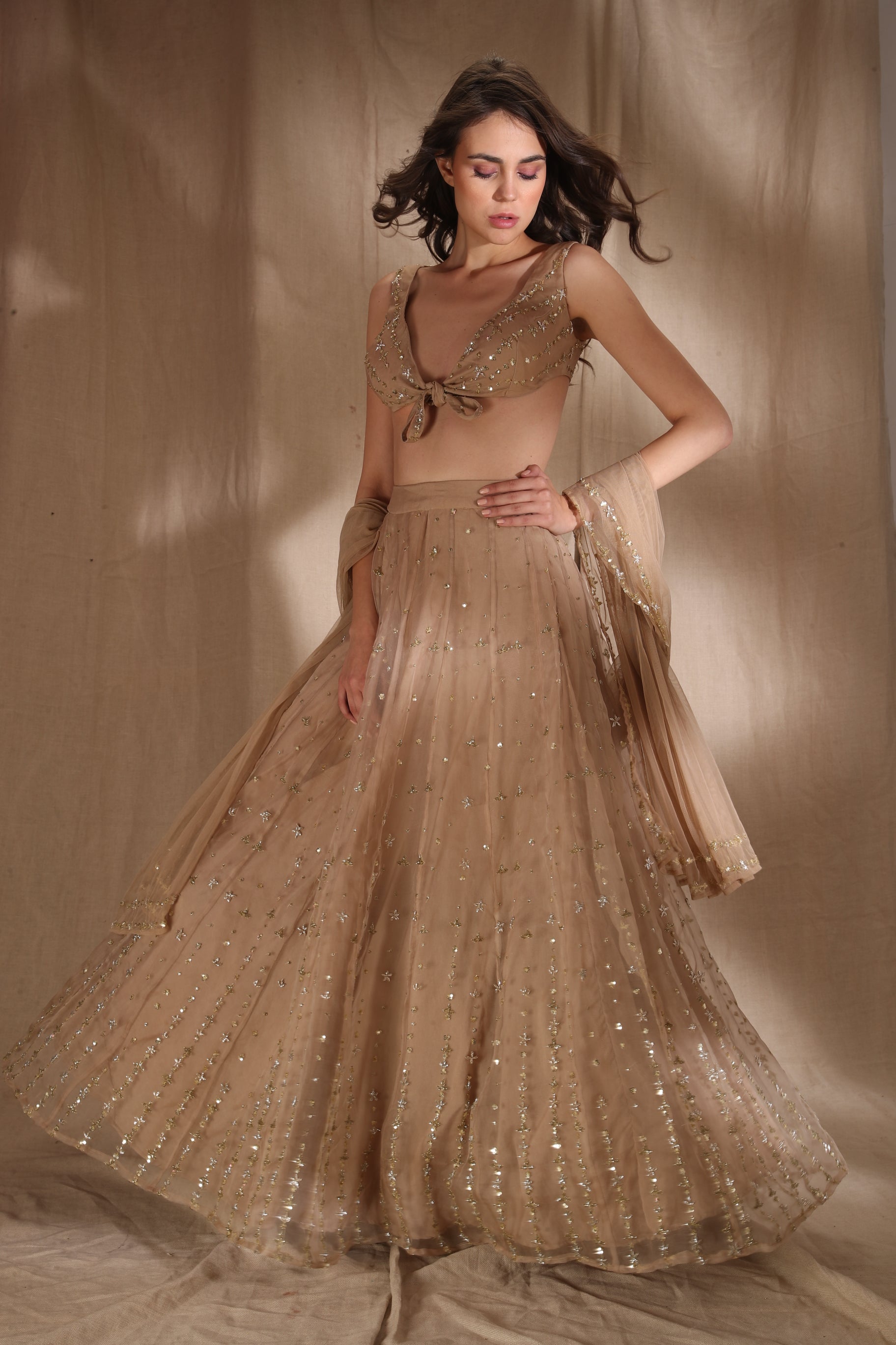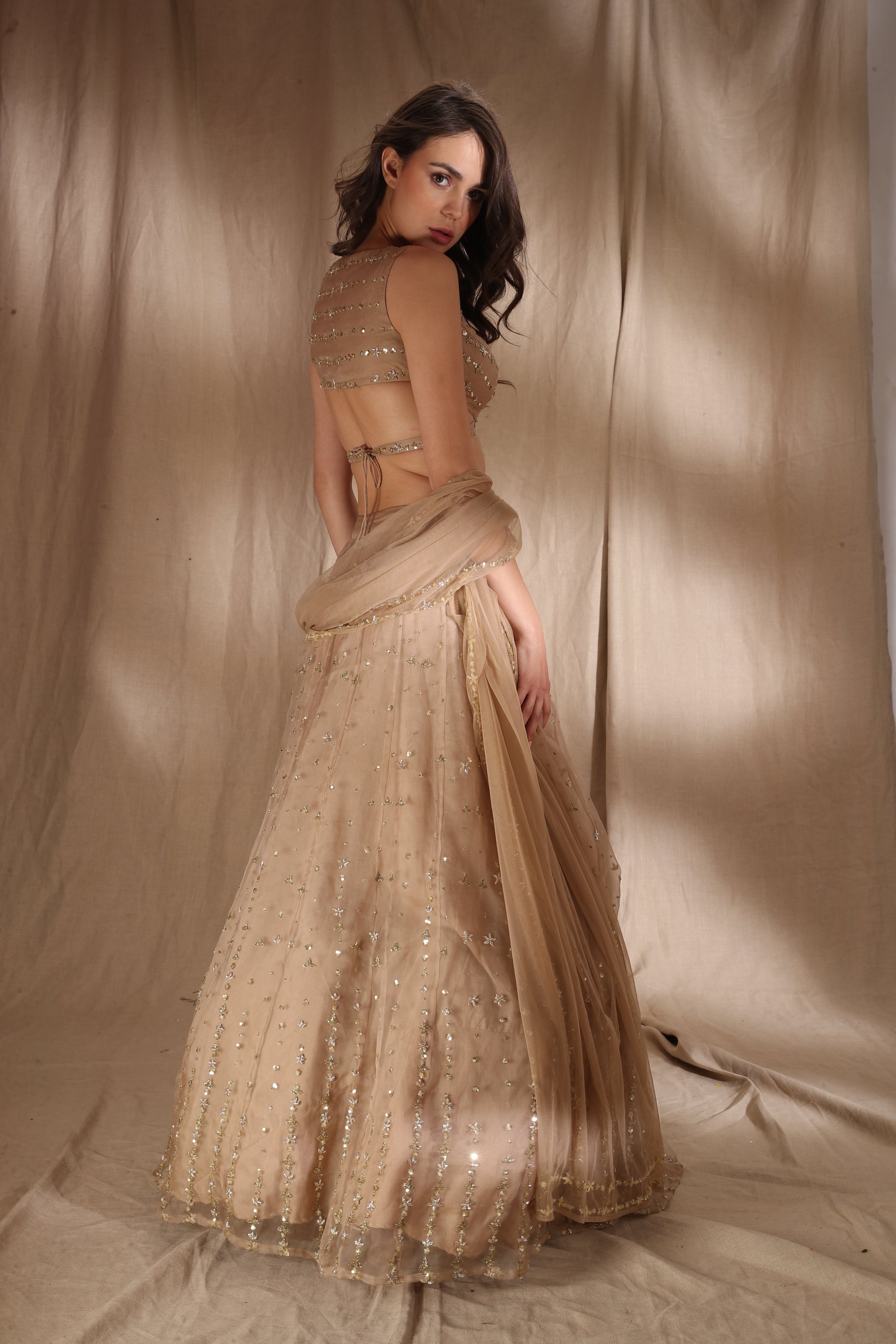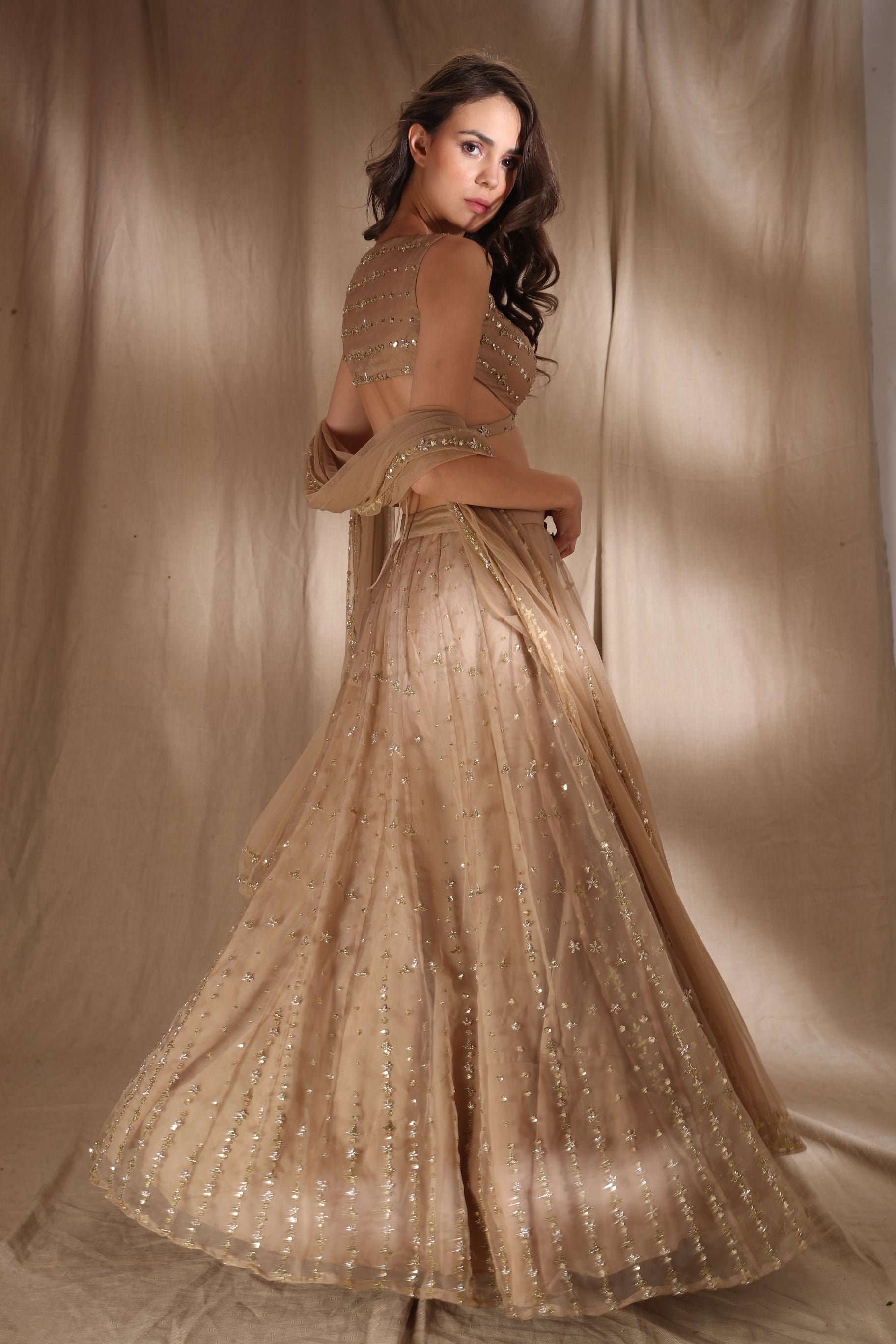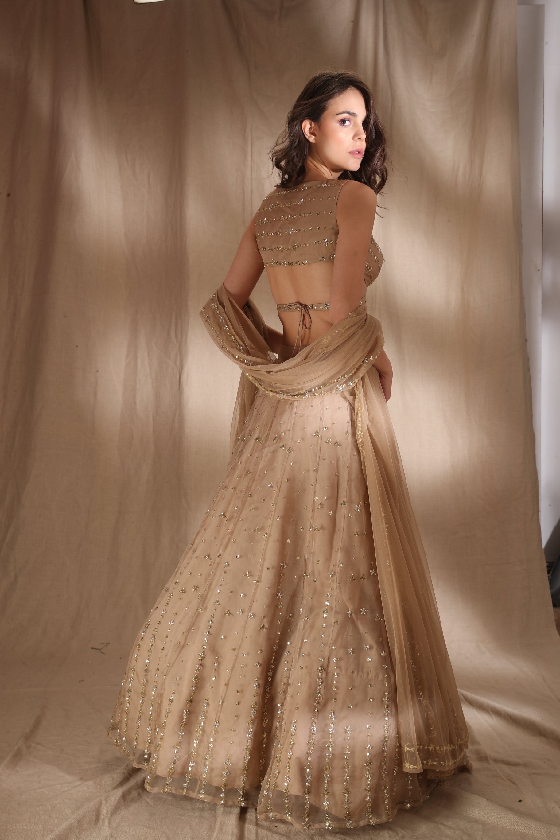 Featuring a PALE BROWN AND GOLD LEHENGA IN ORGANZA.