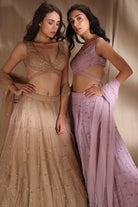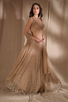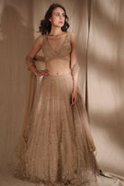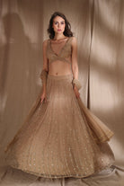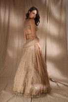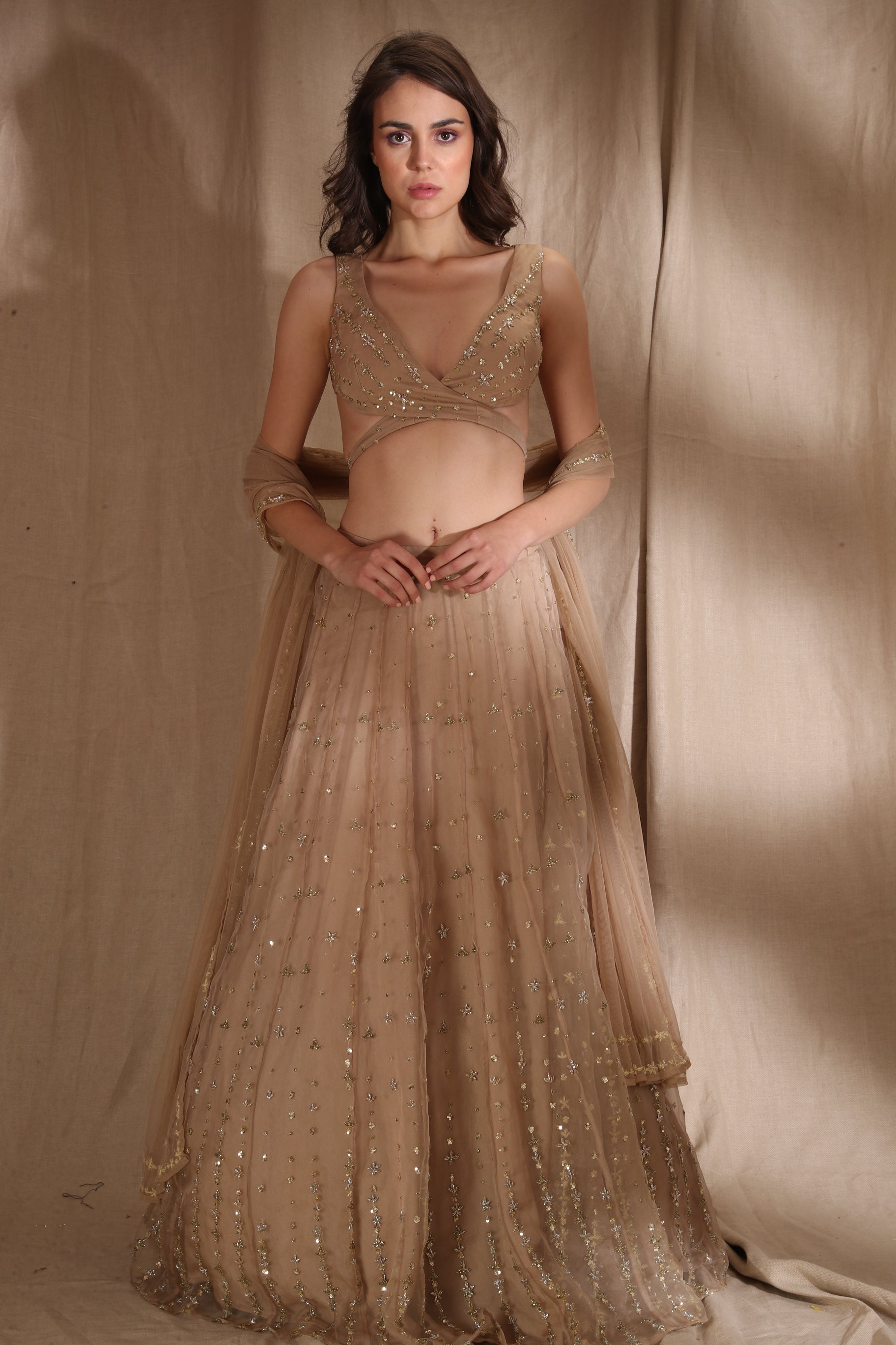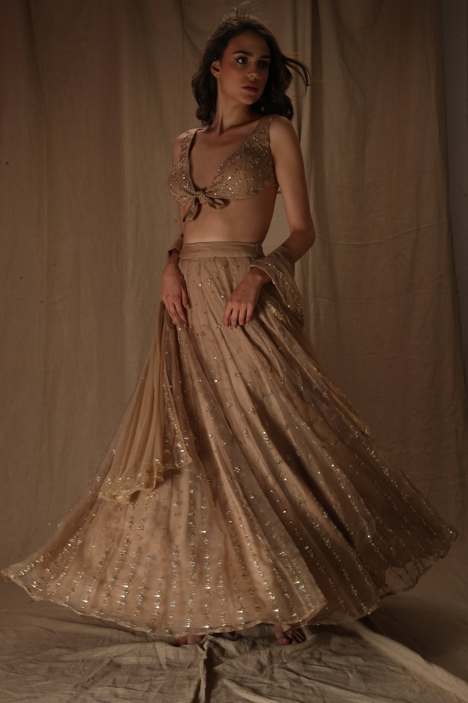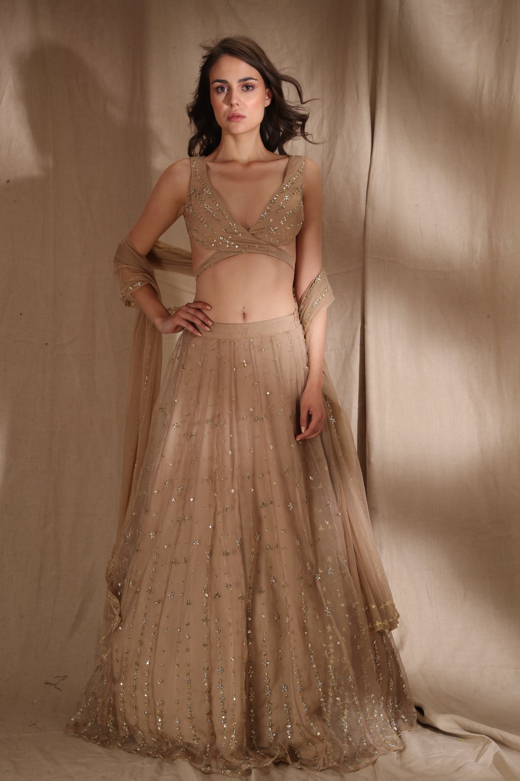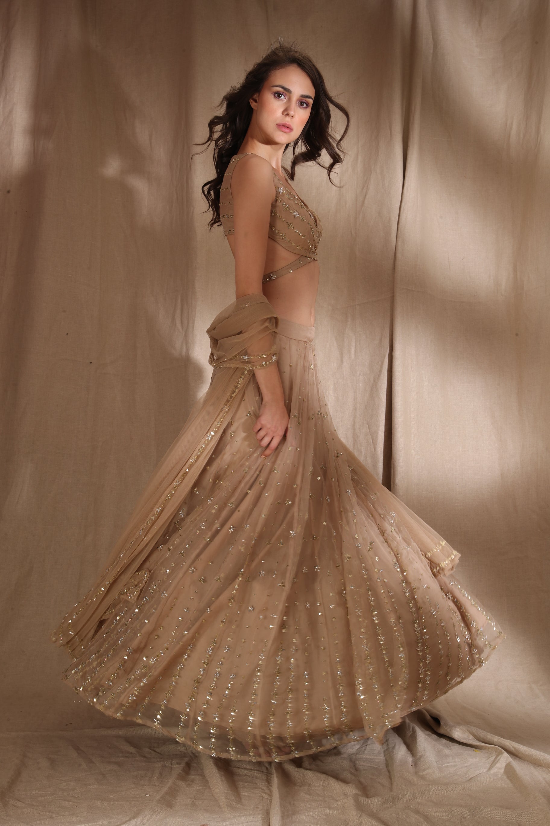 Featuring a PALE BROWN AND GOLD LEHENGA IN ORGANZA.