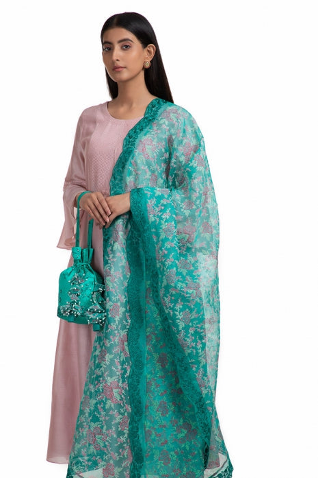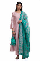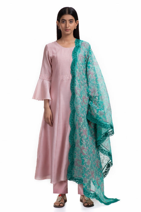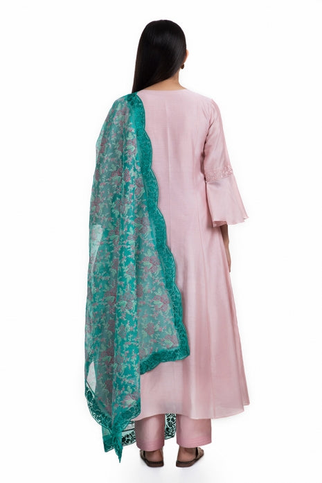A Pale Pink handwoven Chanderi kurta, perfectly complements the Pale Pink cotton pants, creating a harmonious blend of comfort and style. Completing the look is a Bottle Green block printed Silk Organza dupatta, embellished with intricate Silk thread embroidery, creating a unique charm.