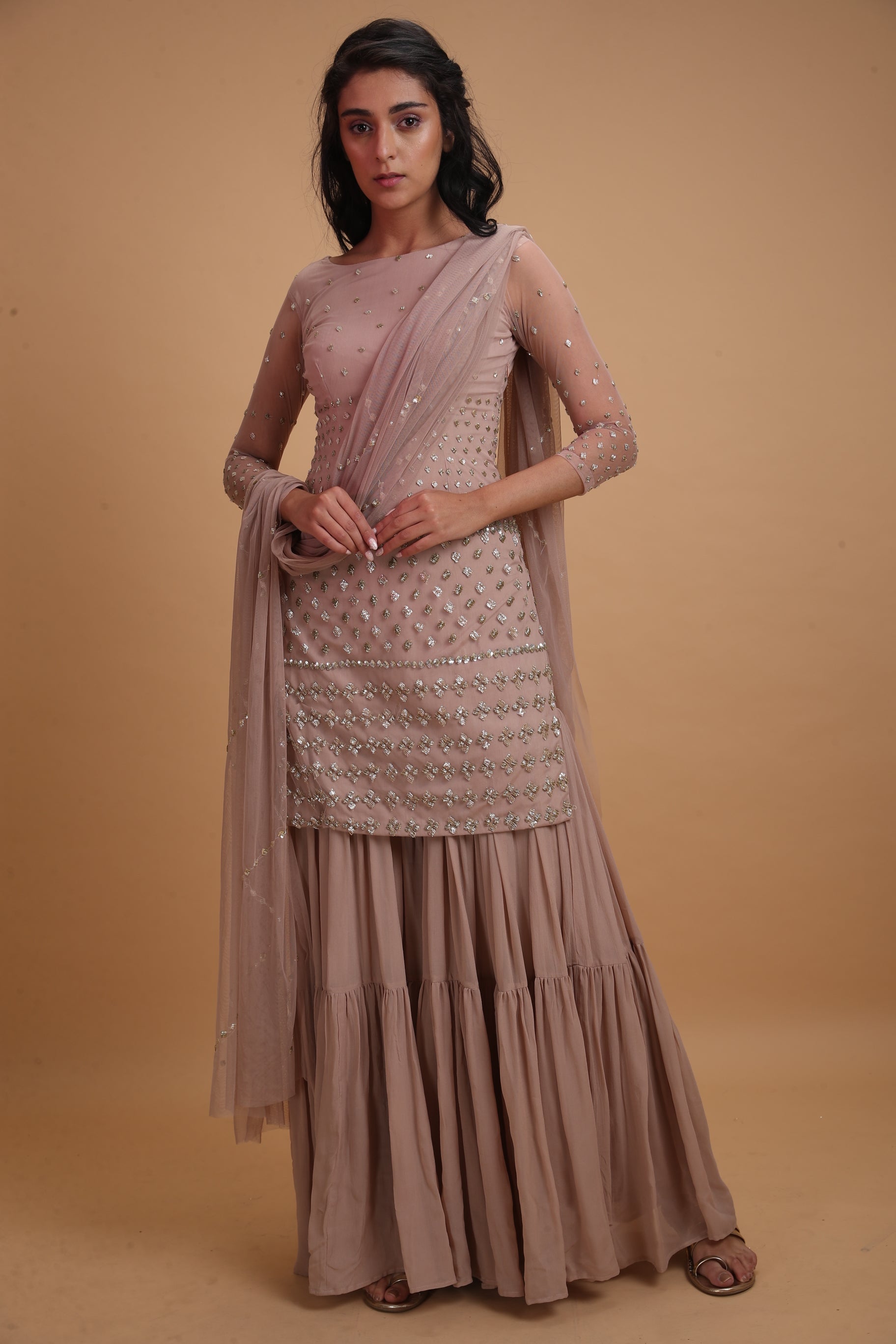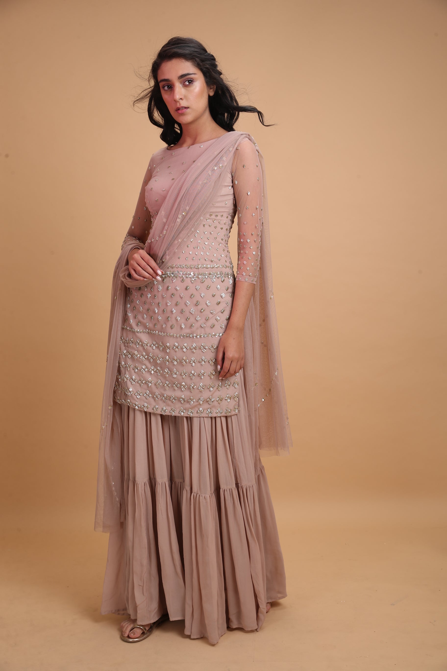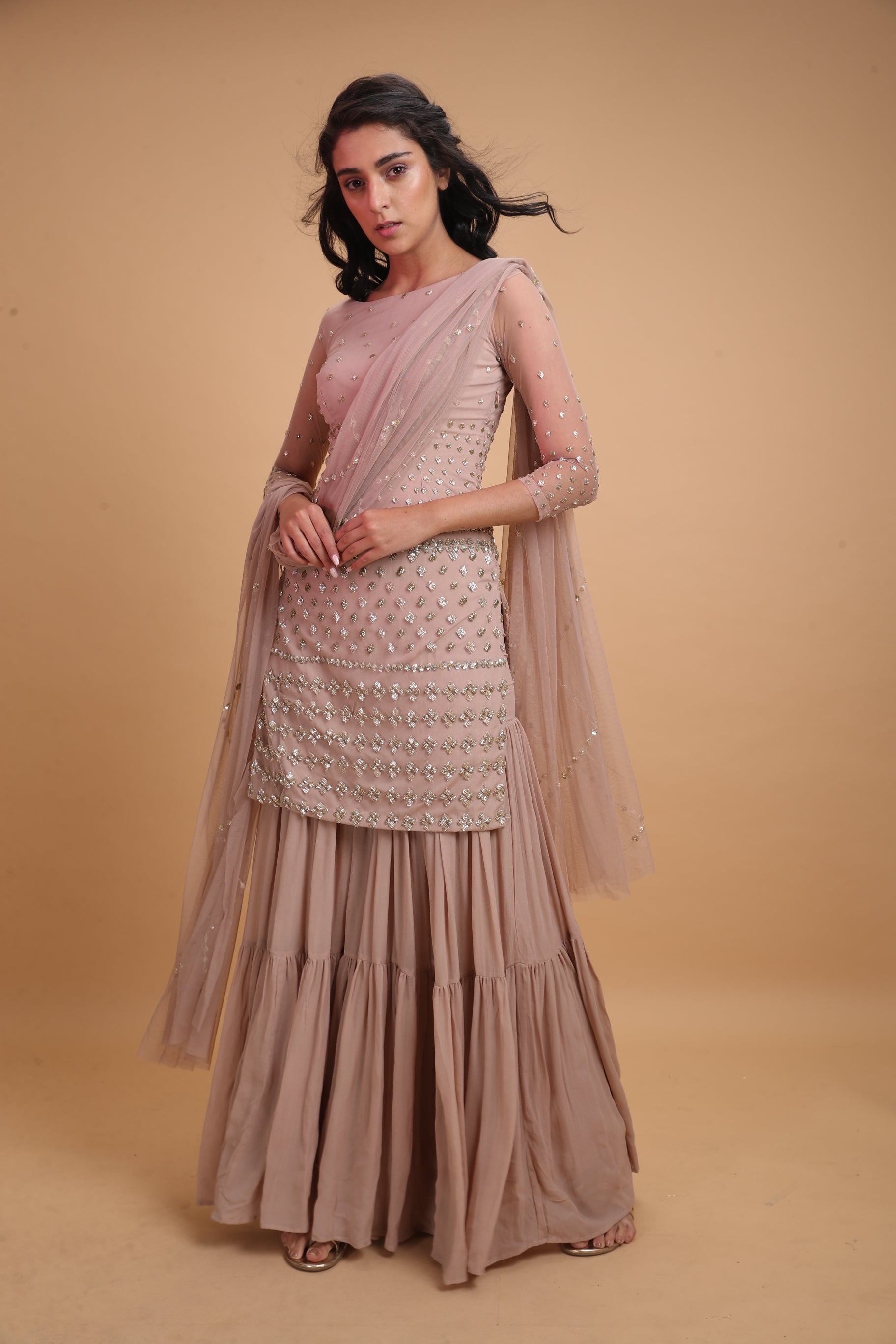Featuring a PALE PINK NET KURTI WITH SHARARA SET IN NET.