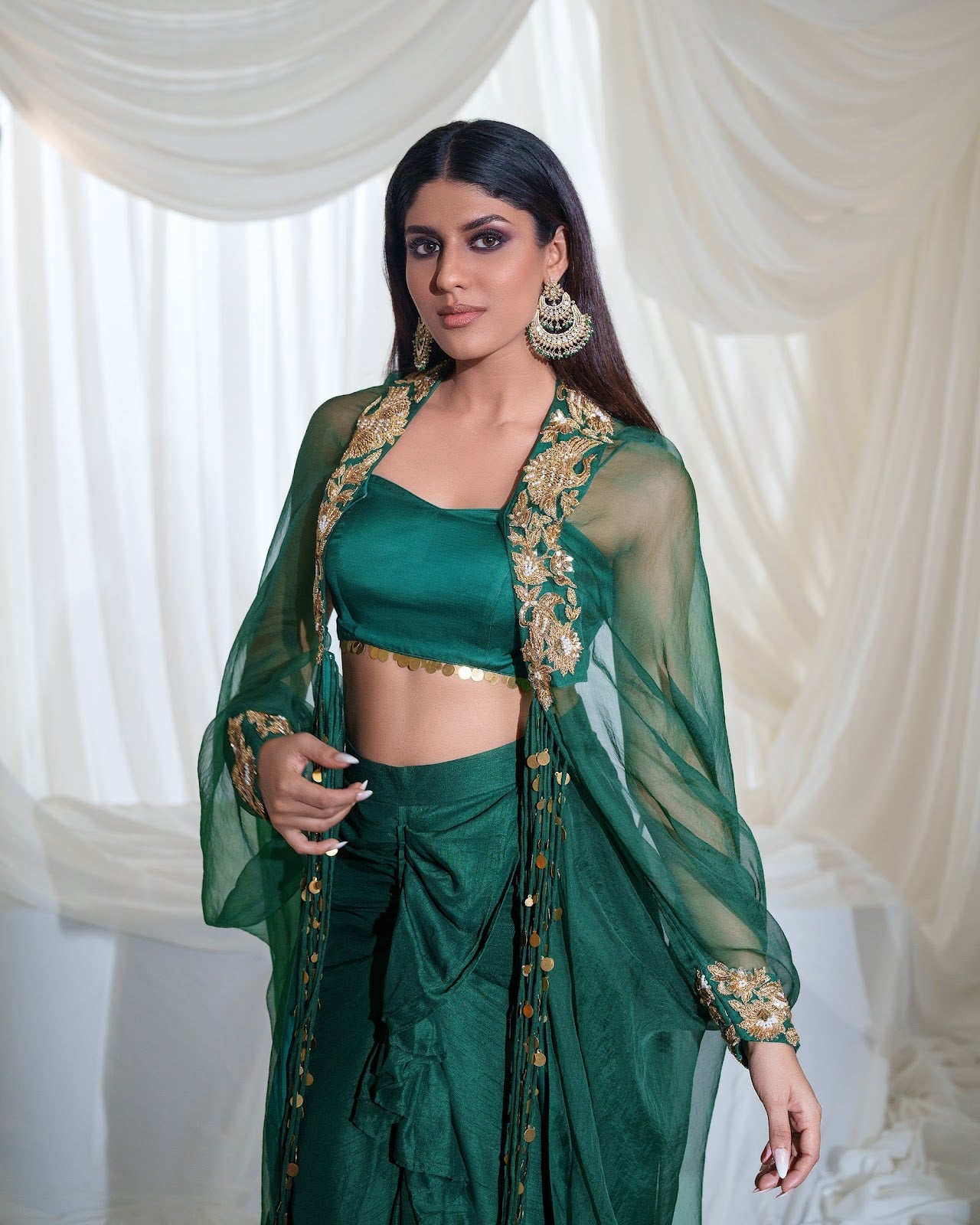 Green drape set with gold thread-work detail showcasing gold bird boarder on cape , paired with green tassel accents , a green blouse with coin detailing and a drape skirt .
