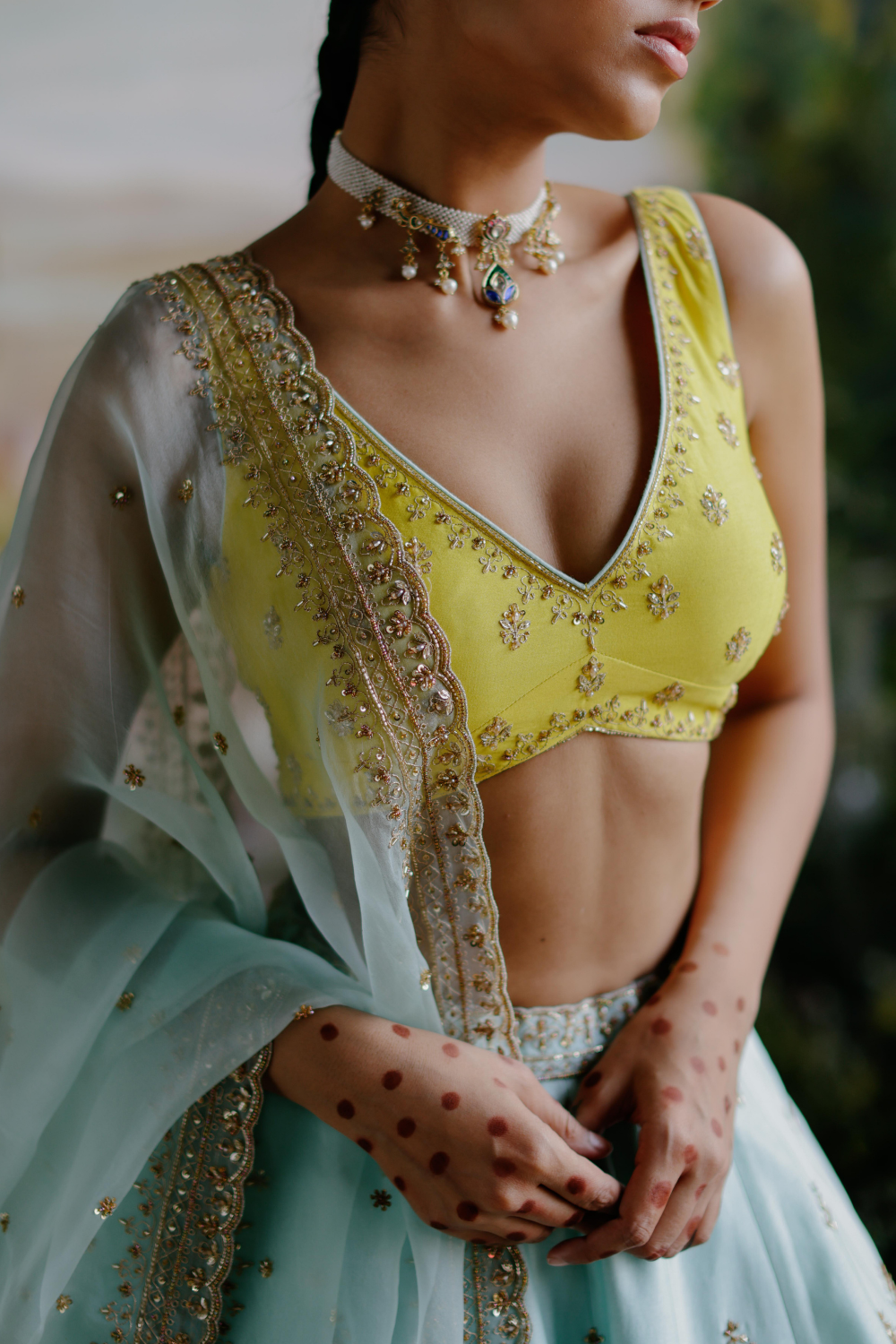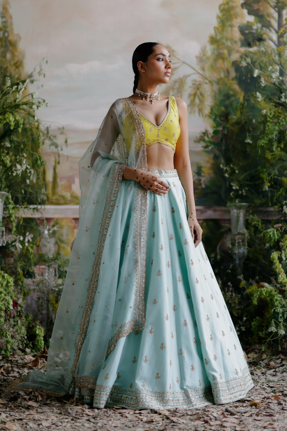Featuring an aqua yellow chanderi lehenga set paired with an organza base dupatta with antique gold dori and embellished hand embroidery.