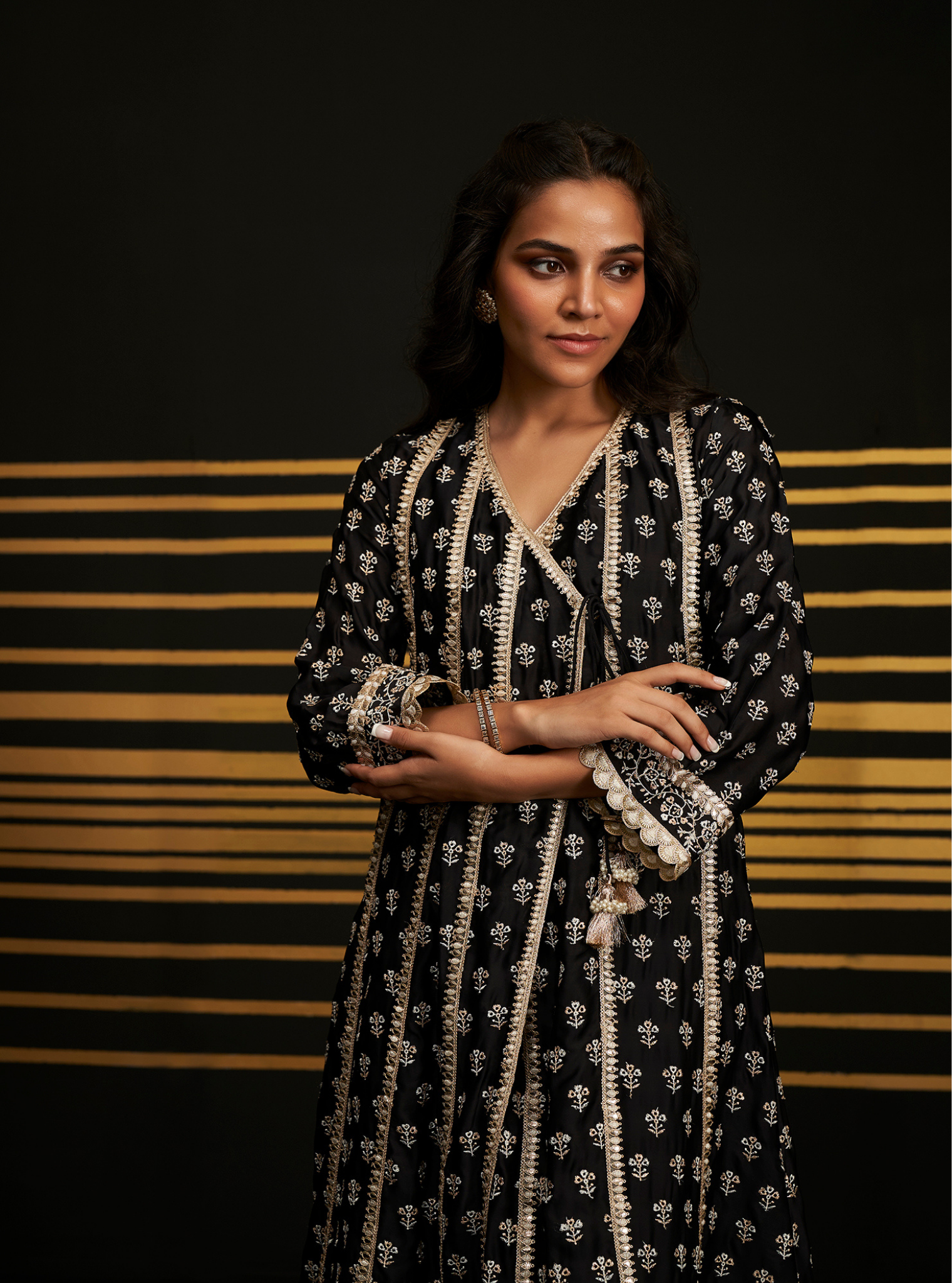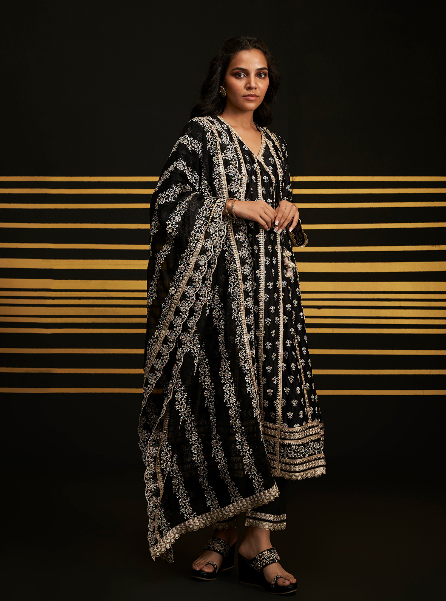 This striking kurta set is an impeccable choice for shaadi celebrations, blending traditional aesthetics with festive flair. The rich black/Fuchsia kurta is richly embellished with intricate white embroidery, exuding a royal and timeless appeal. The V-neckline and flowy silhouette offer both comfort and elegance, perfect for a variety of wedding events. The matching pants feature delicate embroidery along the cuff adding to the outfit's sophistication. The dupatta, with its ornate border and matching embroidery, elevates the entire look, making it a statement piece for any wedding function.