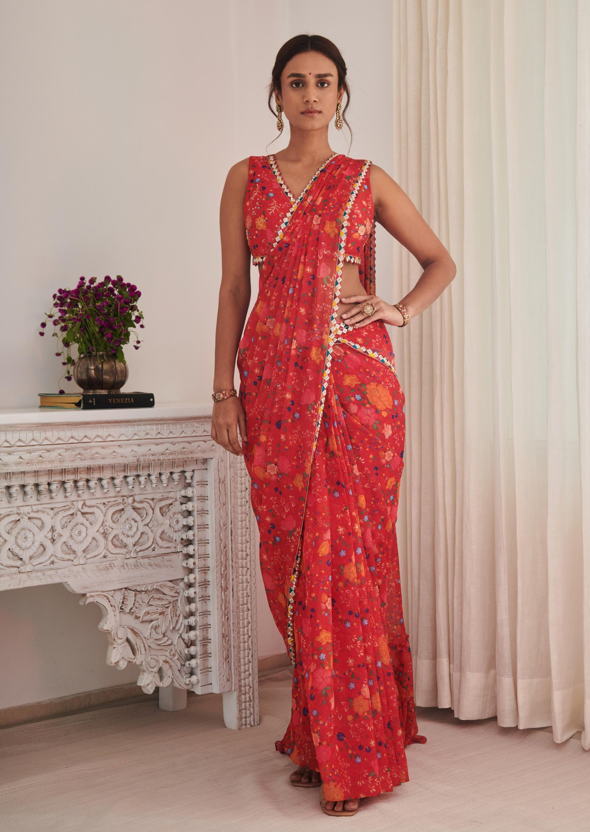 Bright red floral printed pre-stitched saree with rhombus thread and pipe embroidery work with multicoloured thread and sequence details , comes with cut sleeves blouse