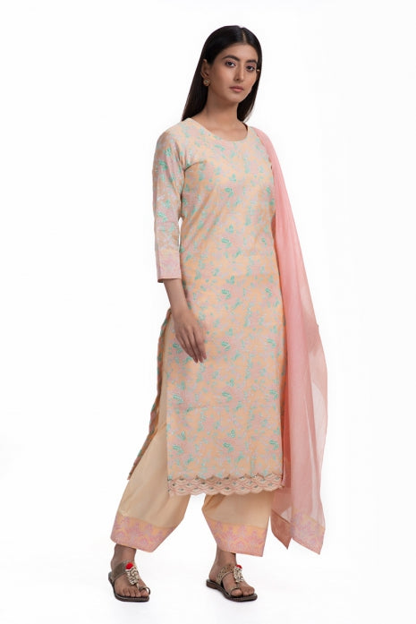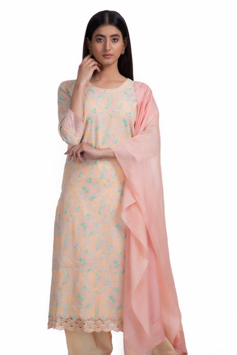 A Peach block printed handwoven Chanderi kurta, finds its perfect match in a Peach cotton salwar, creating a harmonious blend of comfort and style. Completing the ensemble is a Pink Ombre pure Silk Chanderi dupatta, adorned with intricate hand embroidery.
