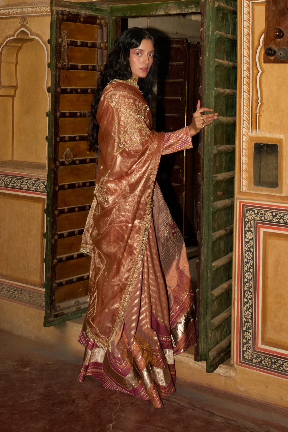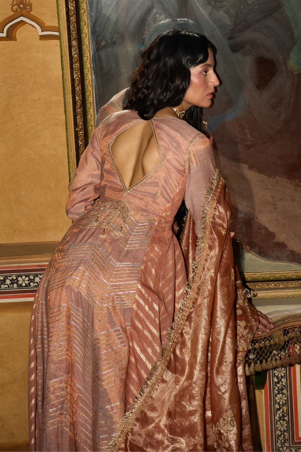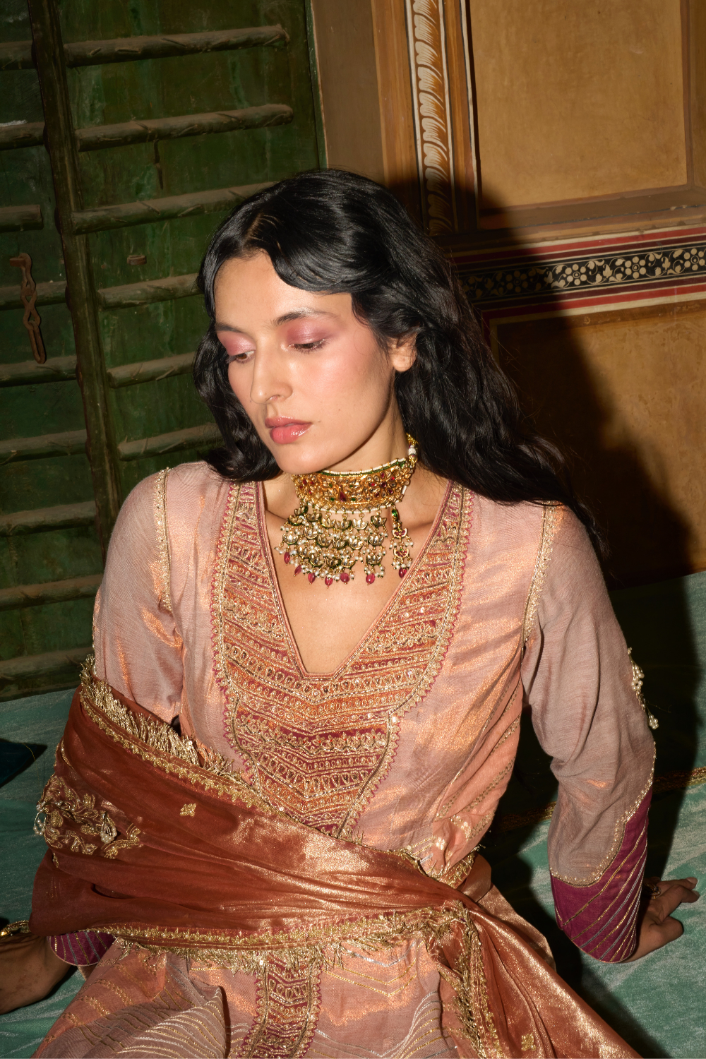 This Kalidar Anarkali set, crafted in peach silk zari tissue and jacquard Banarasi silk, features intricately embroidered elongated motifs with gota texturing, dori, zari, and fine thread work. Paired with a monochromatic tissue dupatta adorned with floral-inspired embroidery and subtle sequins, its look is elevated by a beautifully textured V-shaped gota patti border that adds a touch of refined elegance.