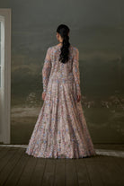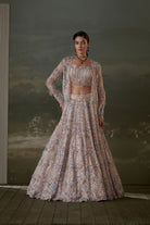Peach net lehenga choli and jacket set with all embellished all over in tonal sequins and beadwork with multi coloured inticate 3-D floral embroidery.