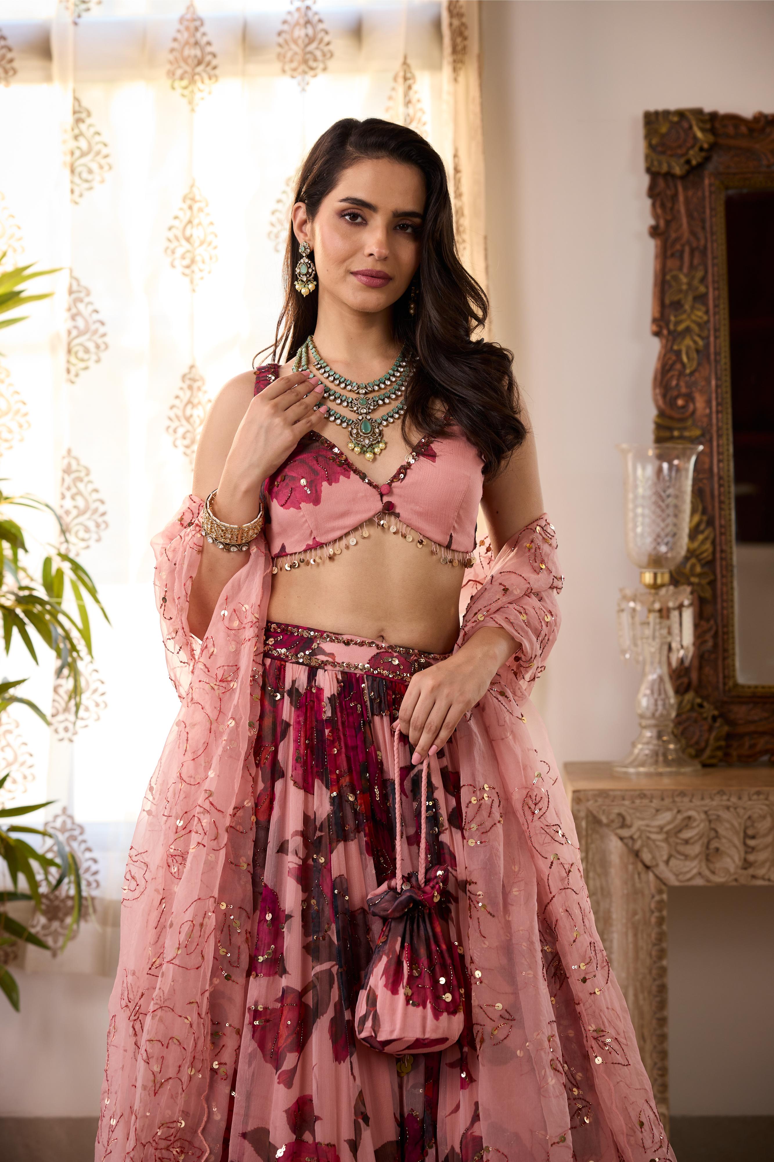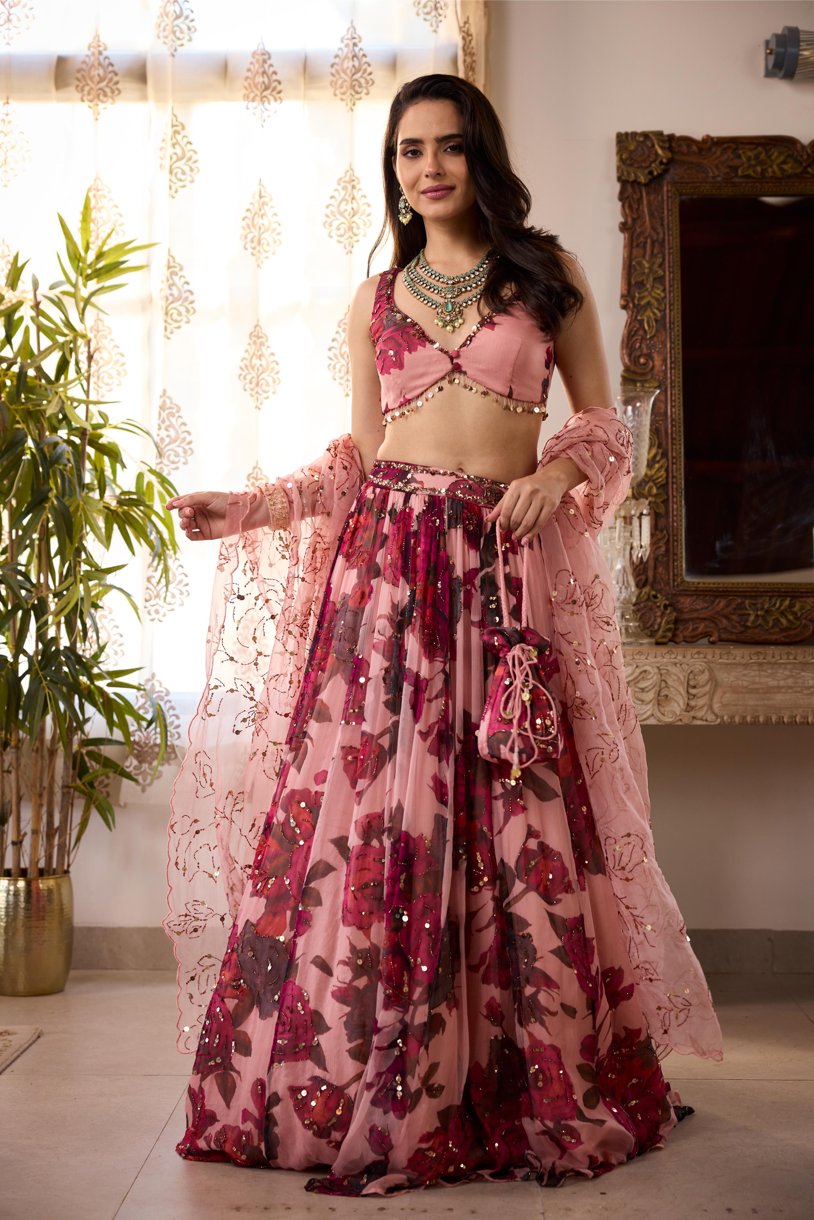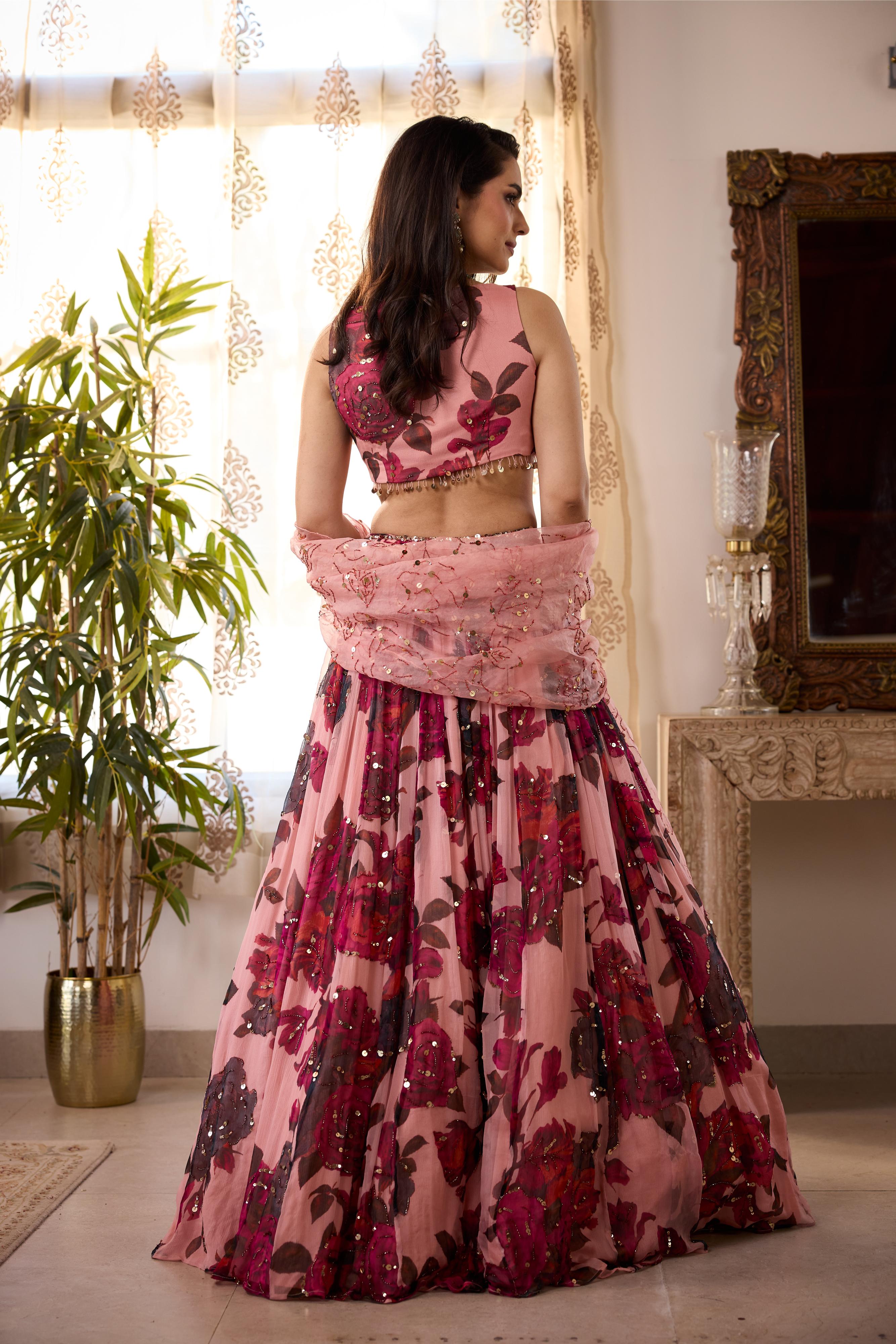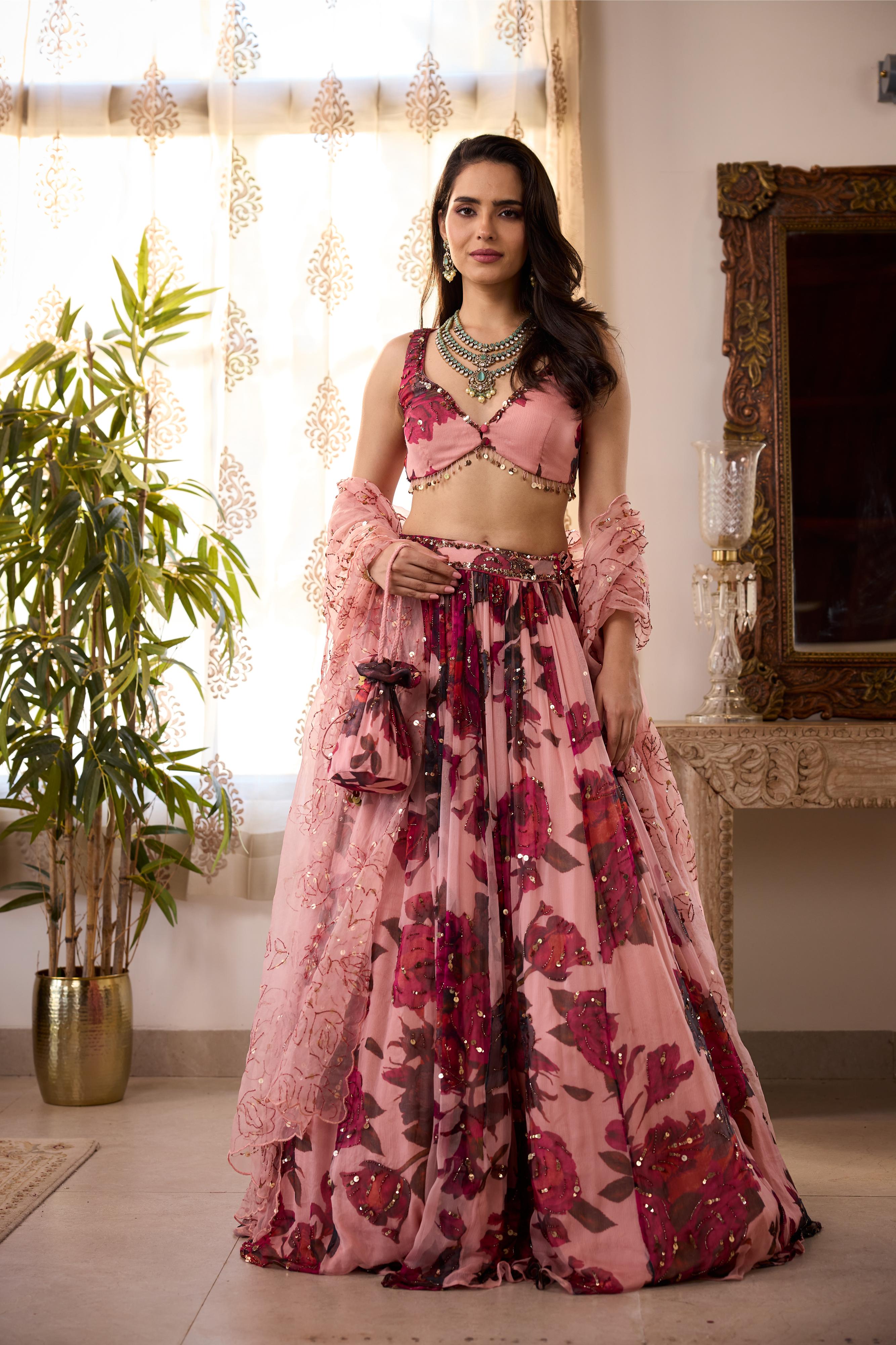 Featuring a Peach Pink Floral Lehenga in Chiffon.