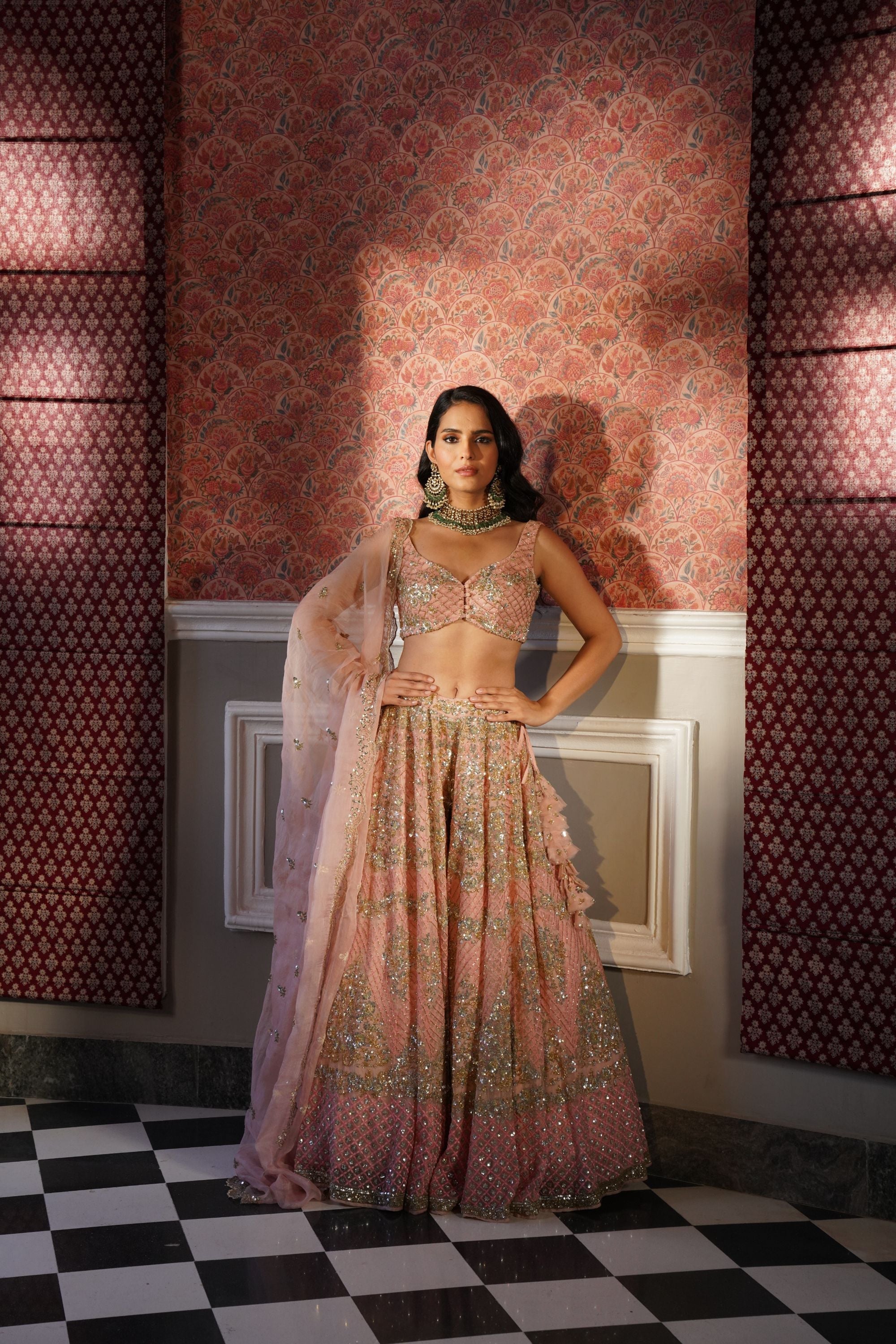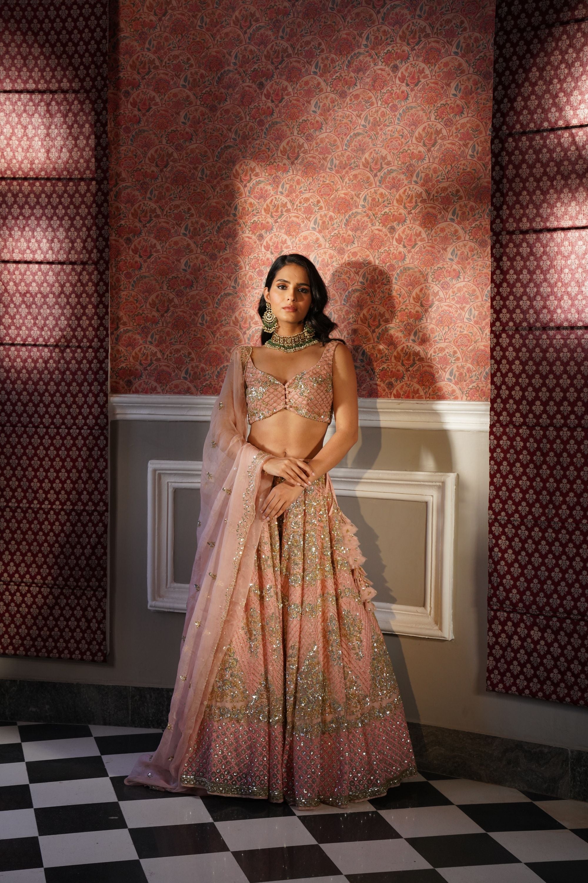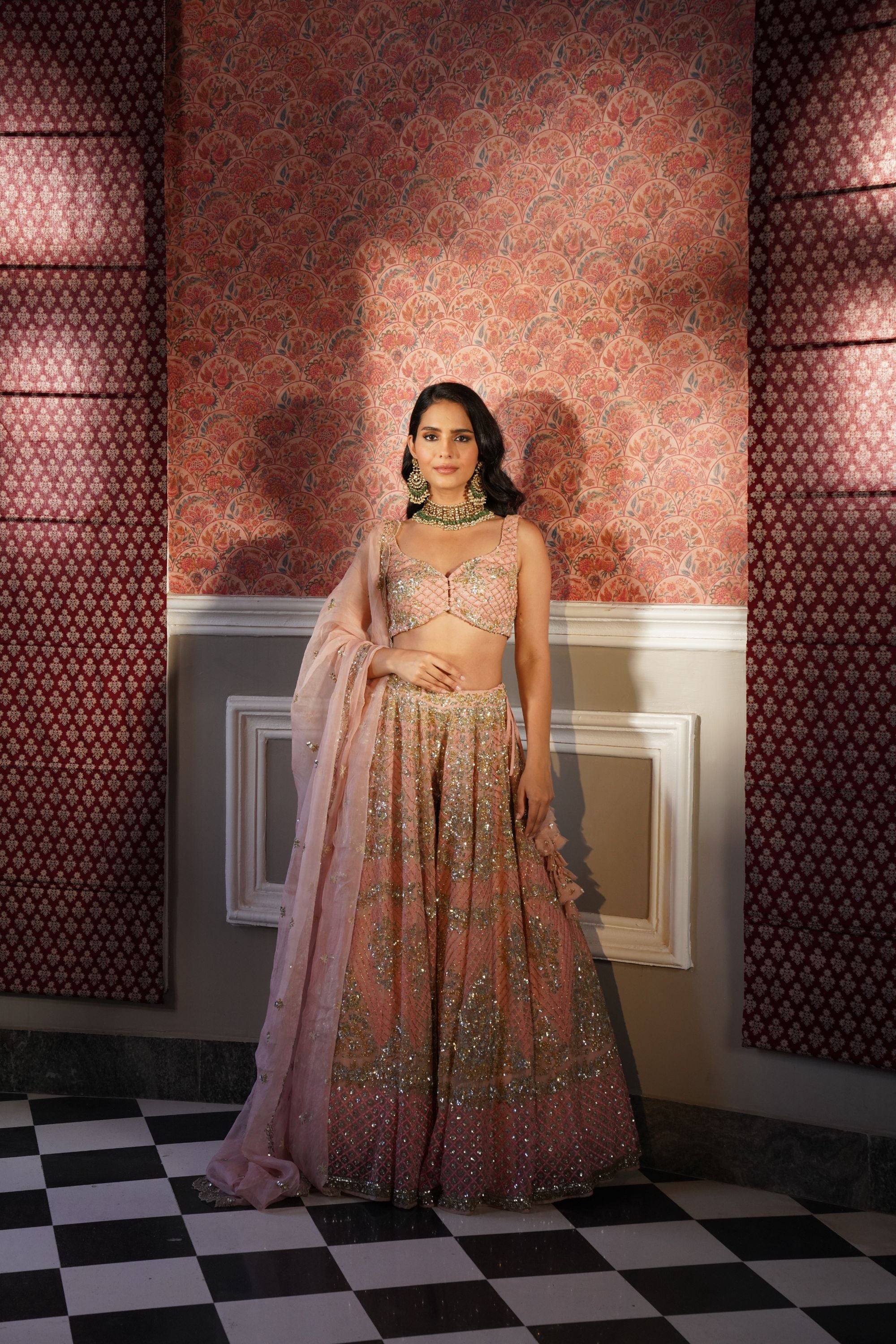 Featuring a Peach Pink Organza Bridal Lehenga set in Organza.