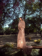 Peach net skirt with a trail paired with a net cape and bustier with veil embroidered in tonal beadwork, sequins and crystals