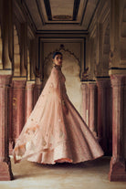Peach tafetta silk lehenga choli set with a tulle dupatta embroidered with gold Dori resham and highlighted with dabka, sequins beads and crystals. It has an optional second worked dupatta and belt which can be ordered separately.