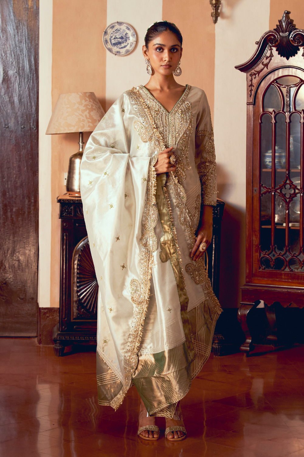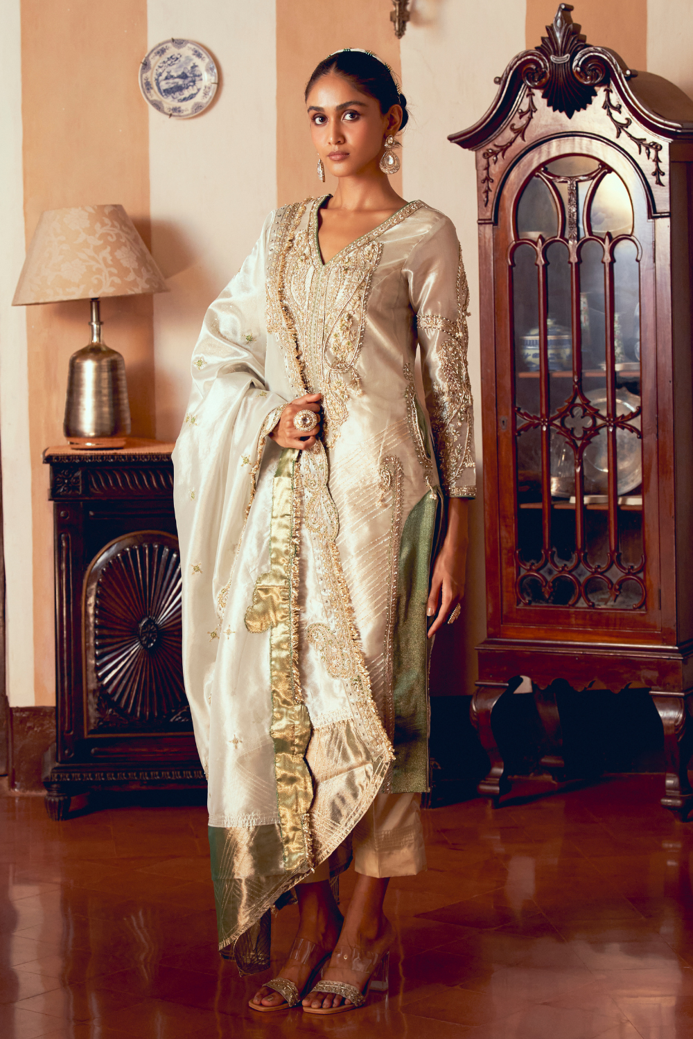 This kurti set in pearl gold silk zari tissue and Jacquard silk Banarasi features intricate elongated paisley embroidery. The ensemble is completed with a pearl gold tissue dupatta adorned with Jharokha-inspired panels with pearl detailing, and a straight pant crafted from soft silk with gota texturing at the hem.