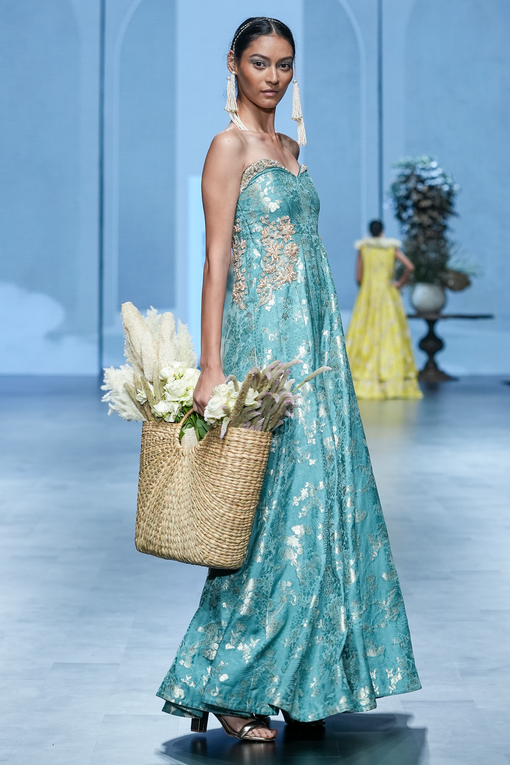 A self-woven russian jacquard jumpsuit in a beautiful shade of ice blue. It has delicate hand–embroidery of floral motifs on the pockets and yoke.
